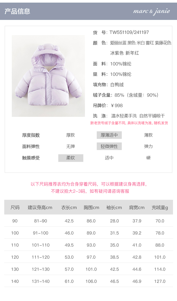 【三防】马克珍妮女童超轻加厚保暖羽绒服儿童面包服冬装241197/551109