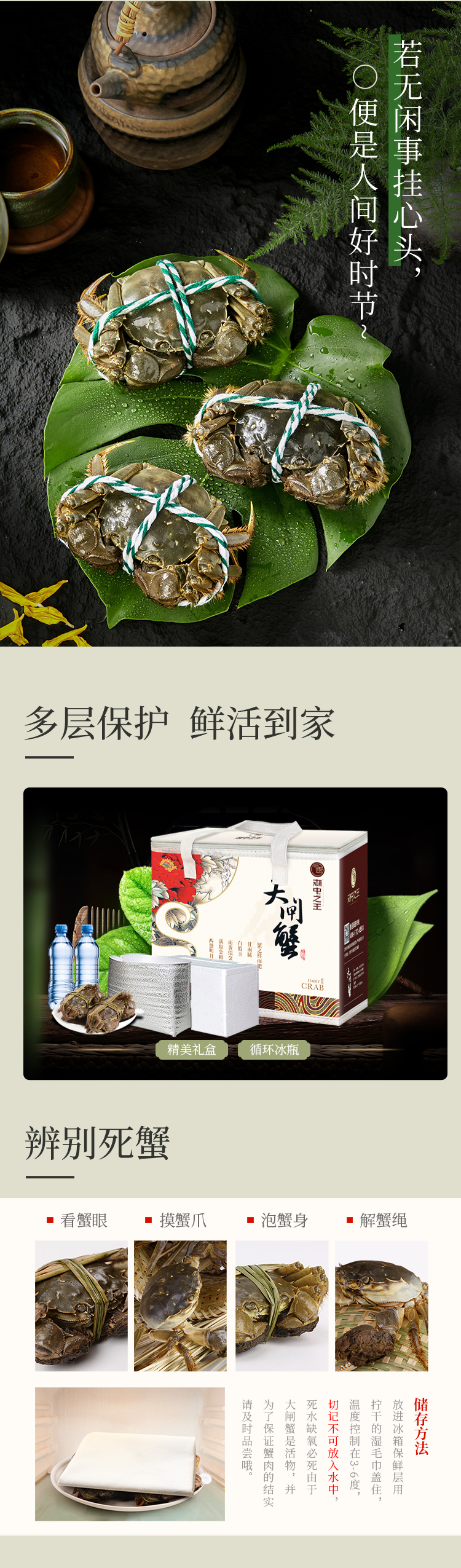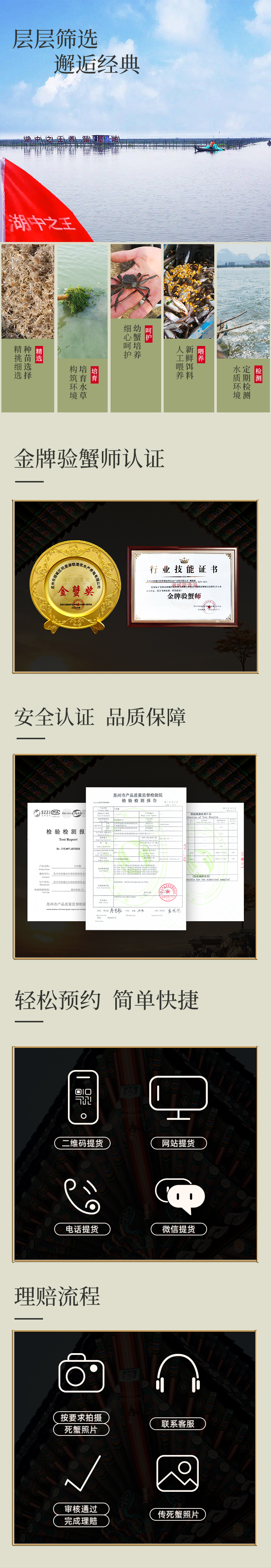 专注养殖大闸蟹20年,拥有标准化、生态化、规模化养殖基地,从前期的苗种培育、中期的投入品使用,到后期的捕捞运输,每一环节都严格执行。我们的宗旨:让每一位消费者都吃上放心蟹!
