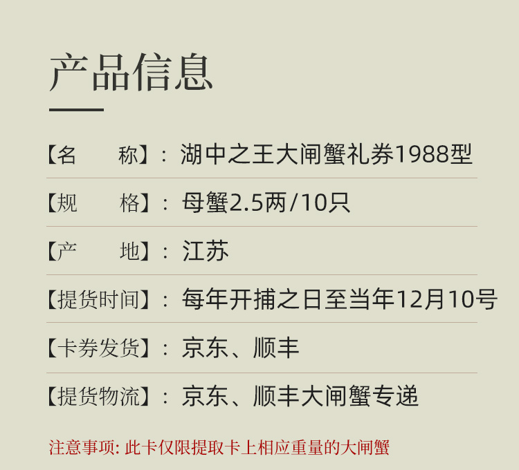 【蟹卡】湖中之W王大闸蟹1988型礼券-母蟹2.5两/10只