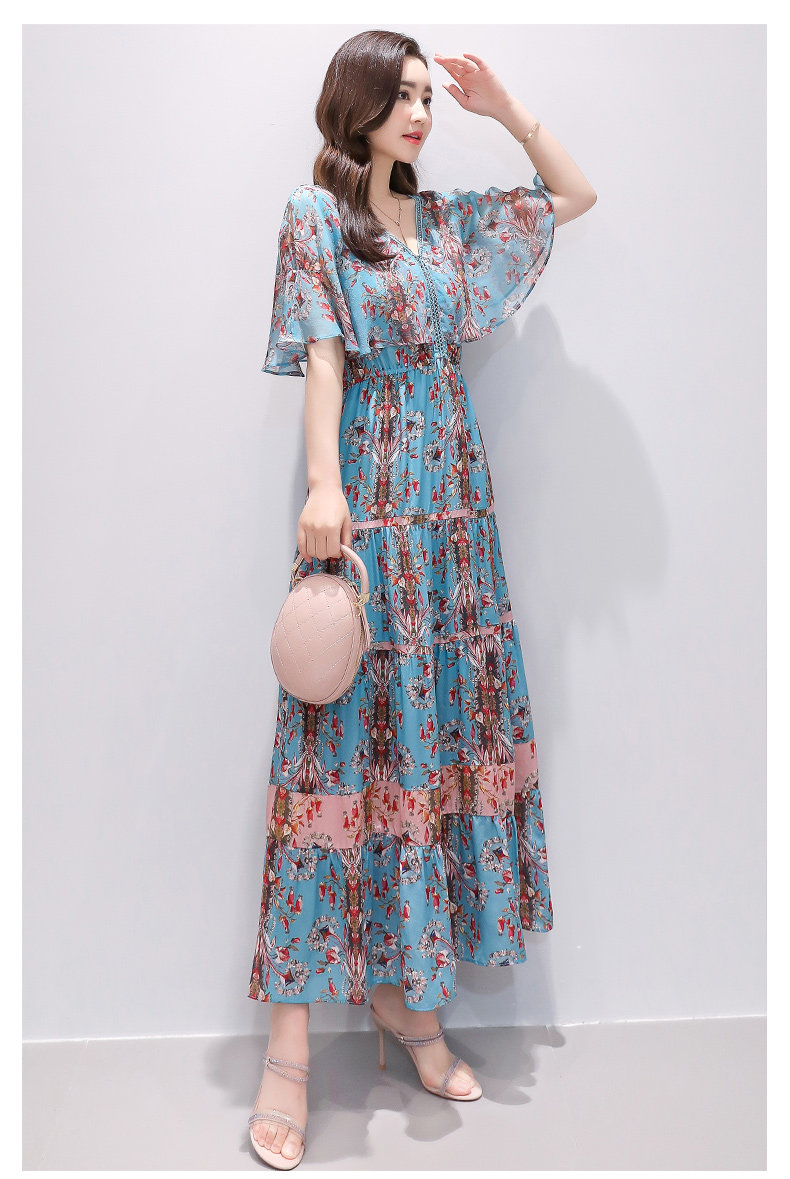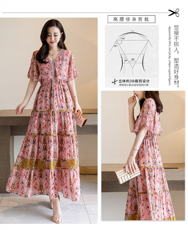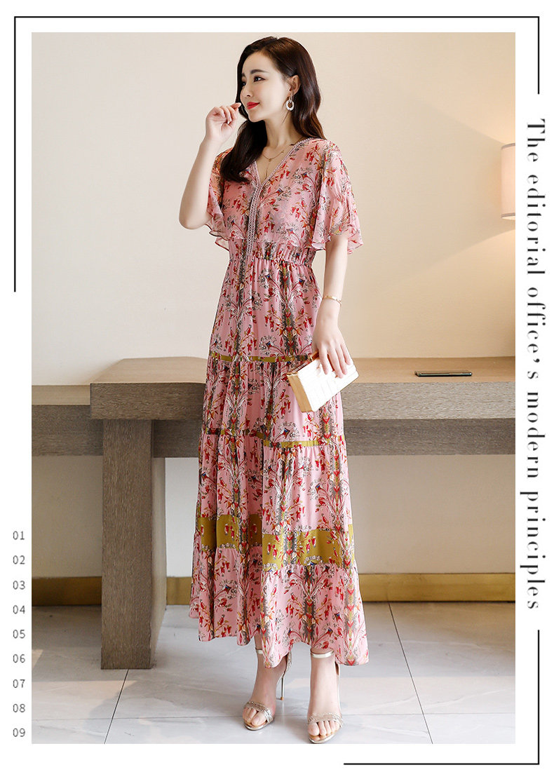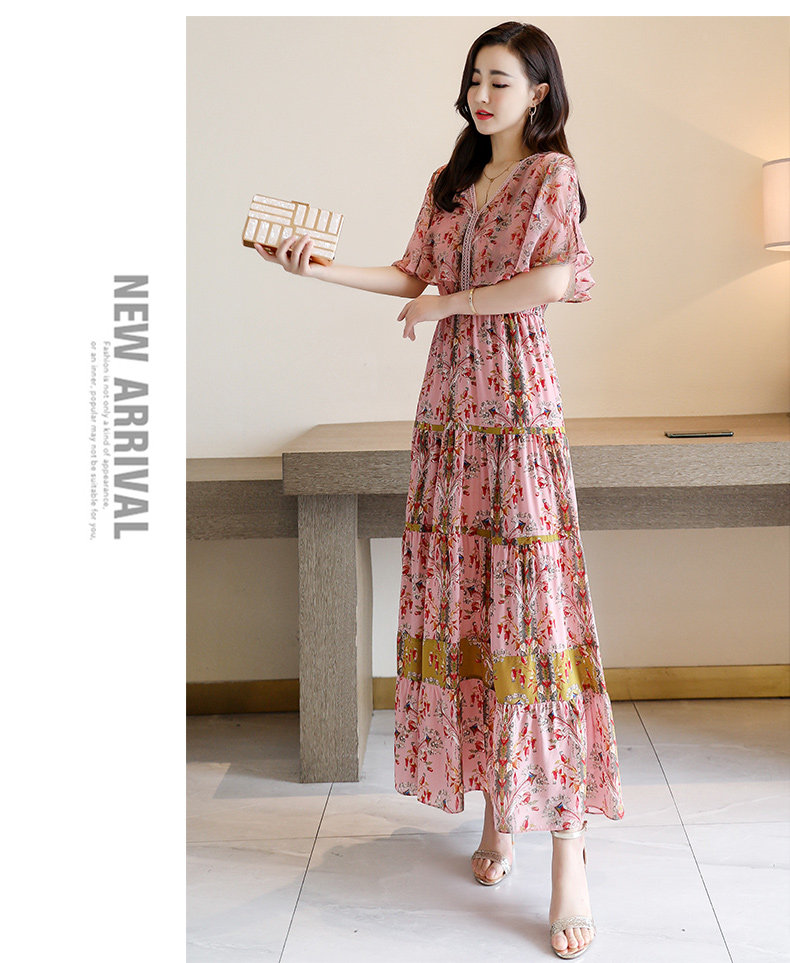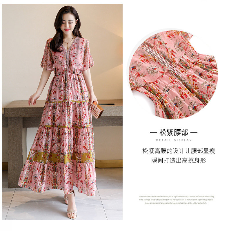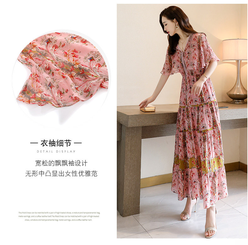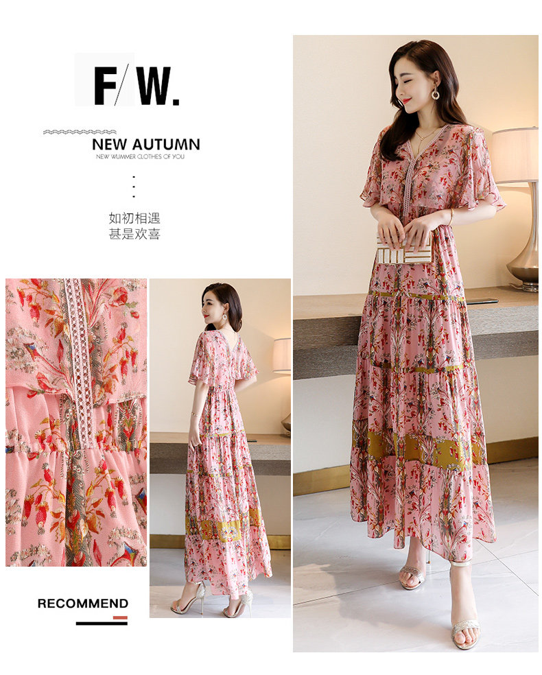 WZNH-QSLG9801A新款v领碎花裙长裙修身喇叭袖中腰雪纺连衣裙
