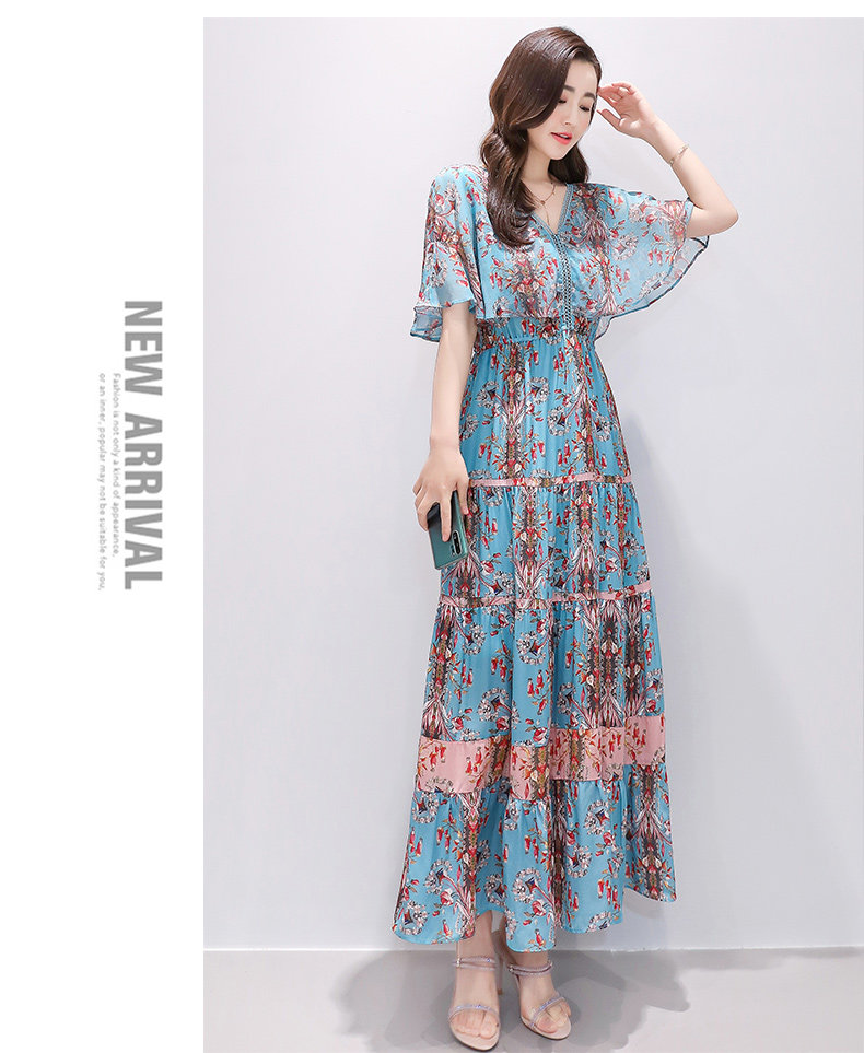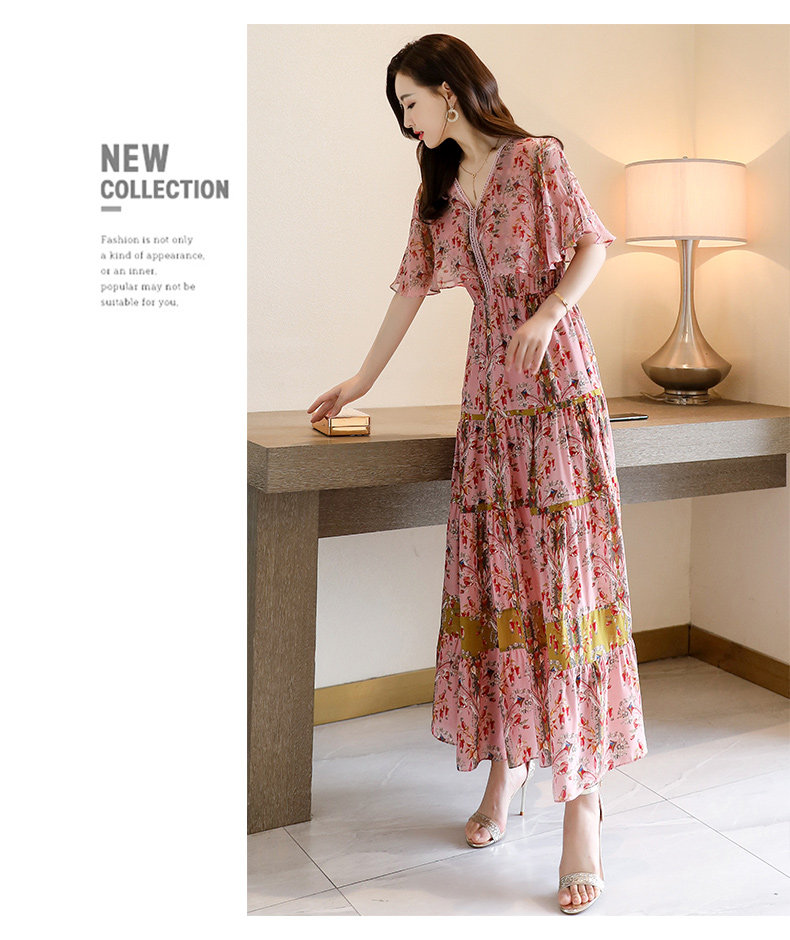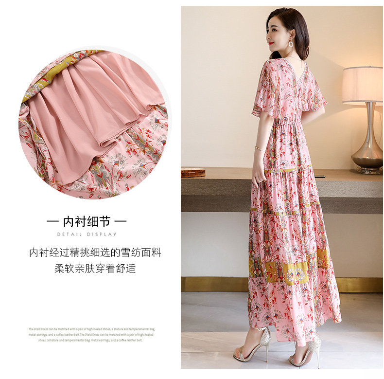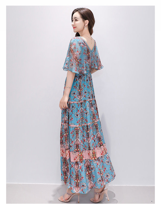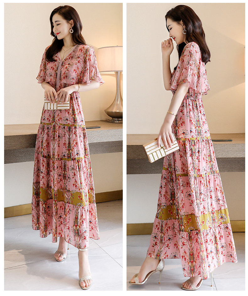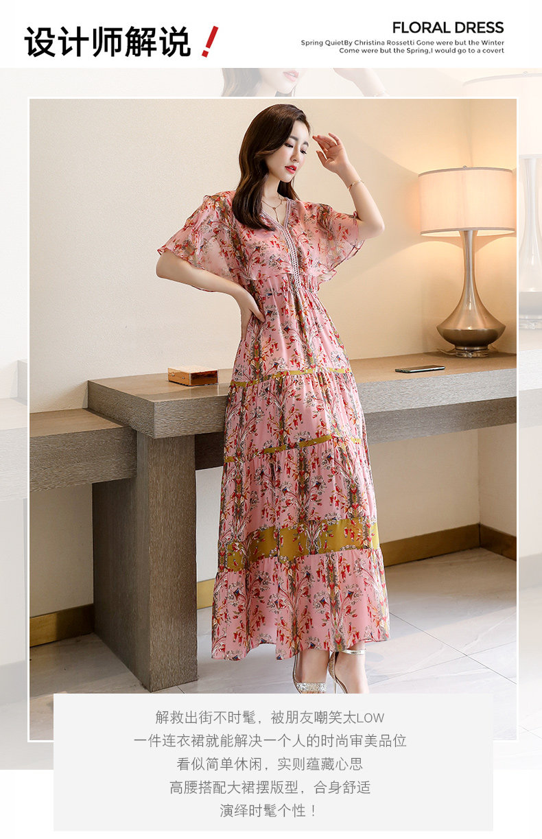 WZNH-QSLG9801A新款v领碎花裙长裙修身喇叭袖中腰雪纺连衣裙