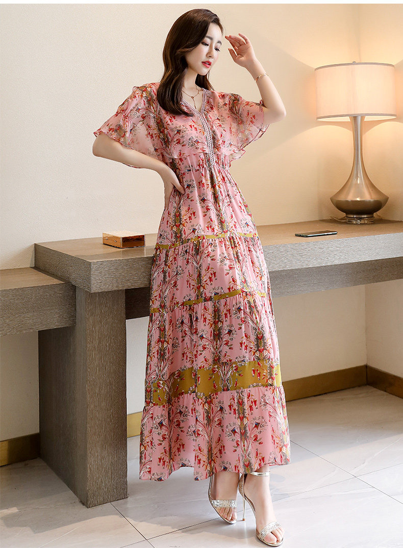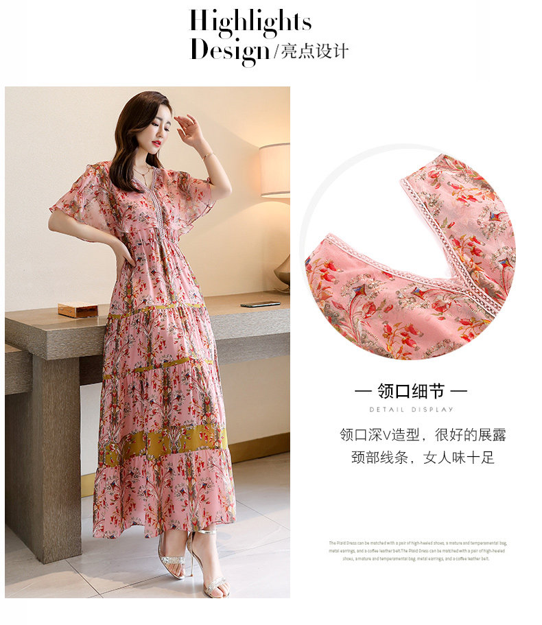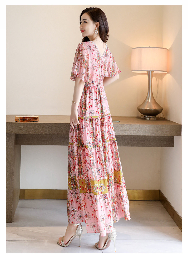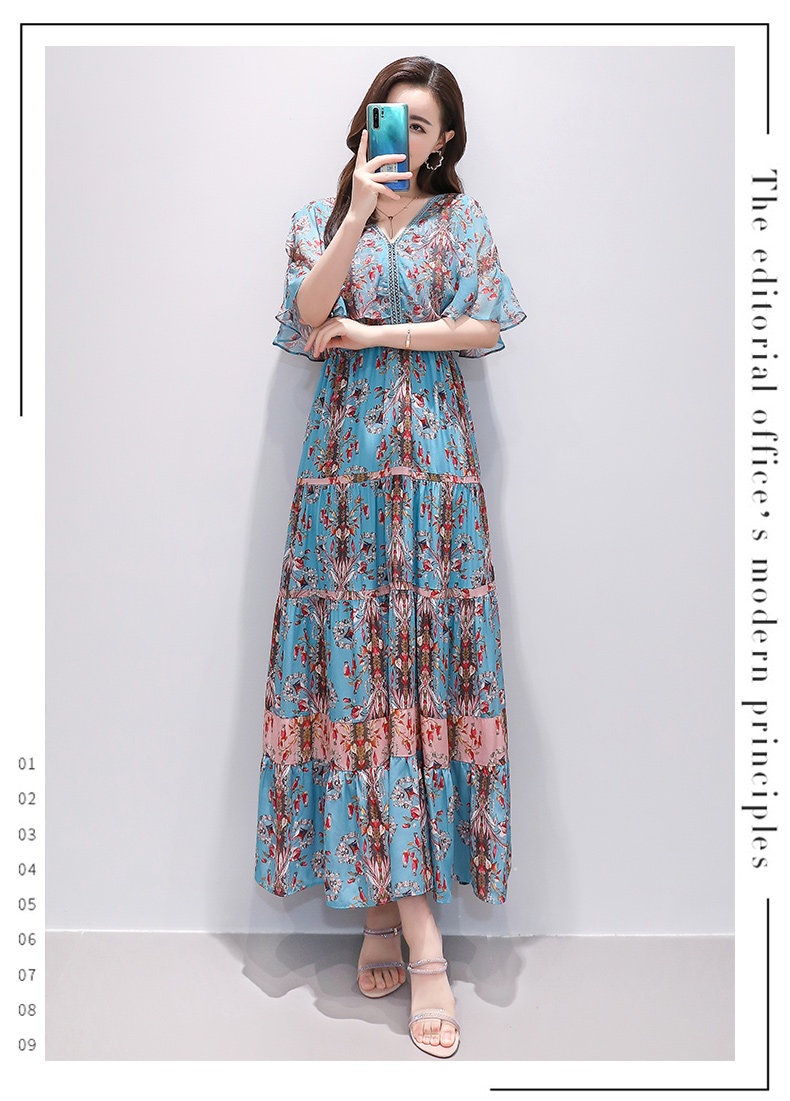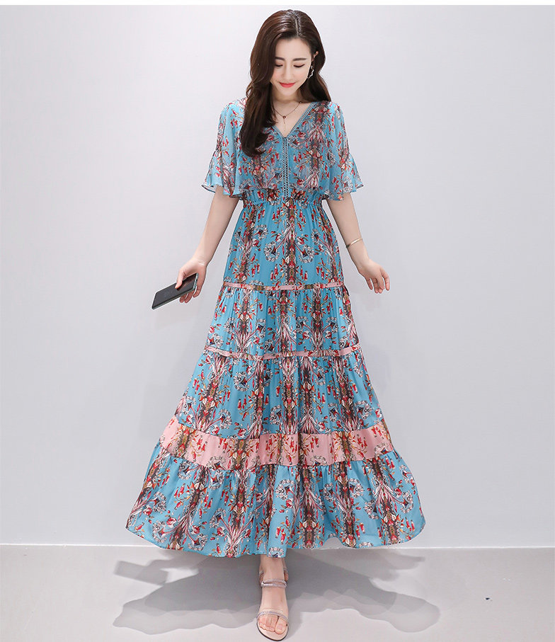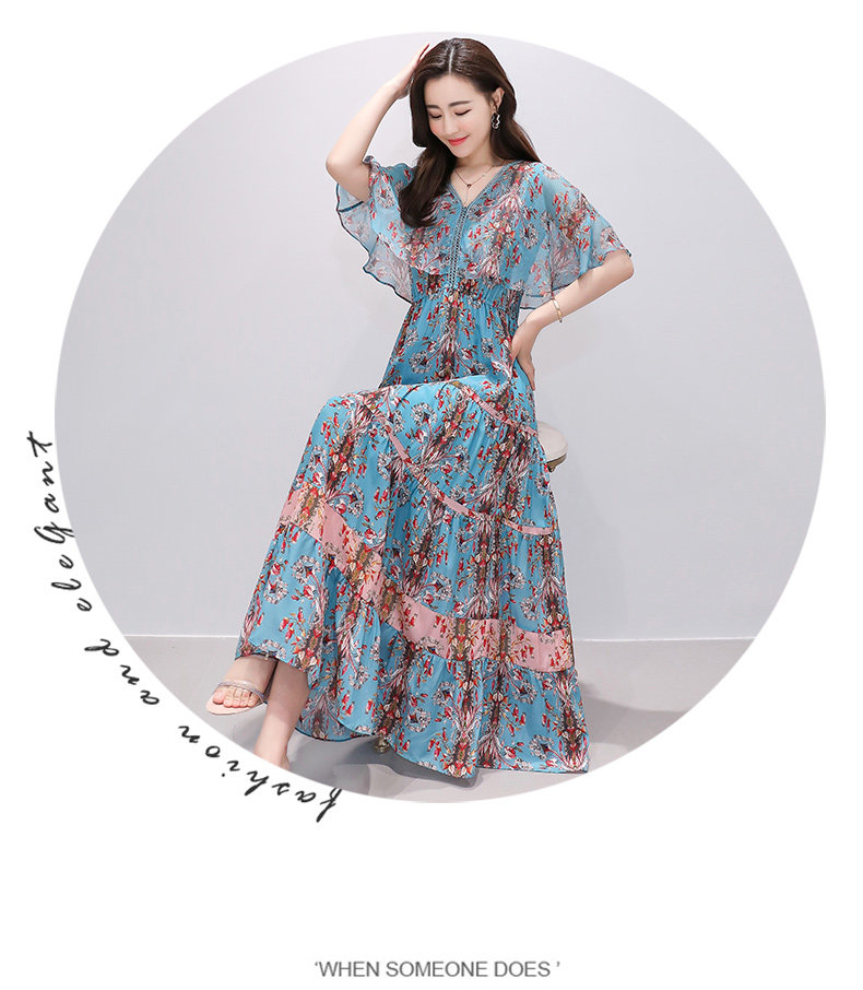 WZNH-QSLG9801A新款v领碎花裙长裙修身喇叭袖中腰雪纺连衣裙