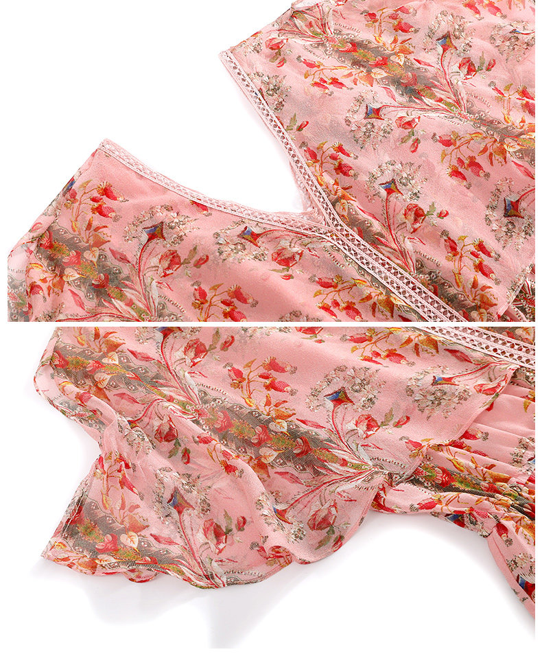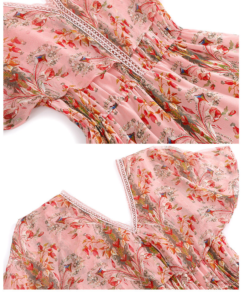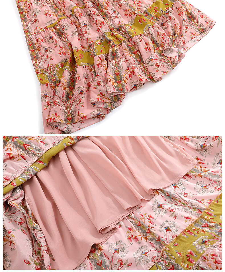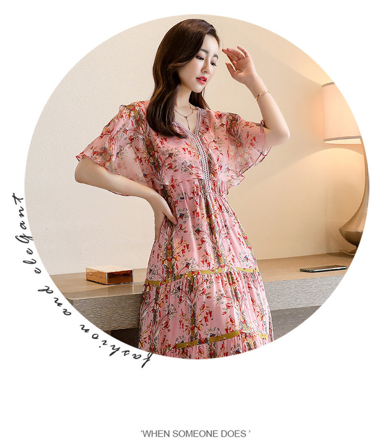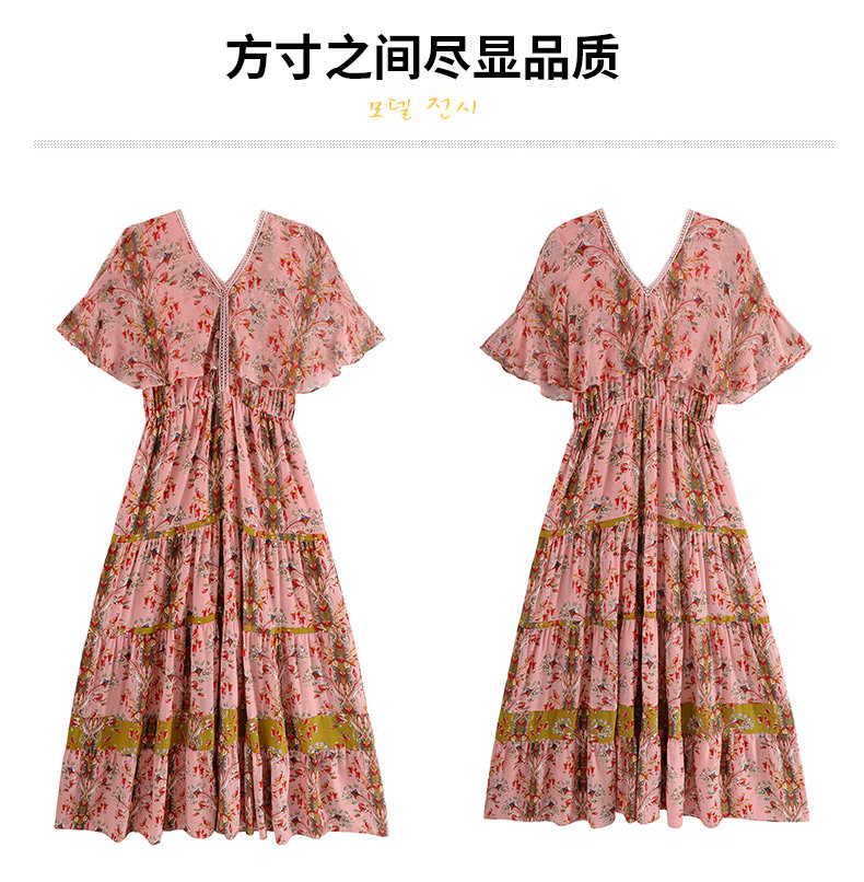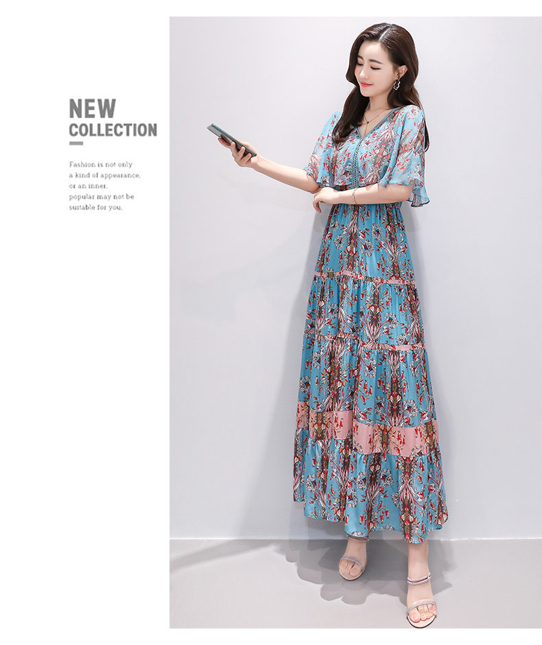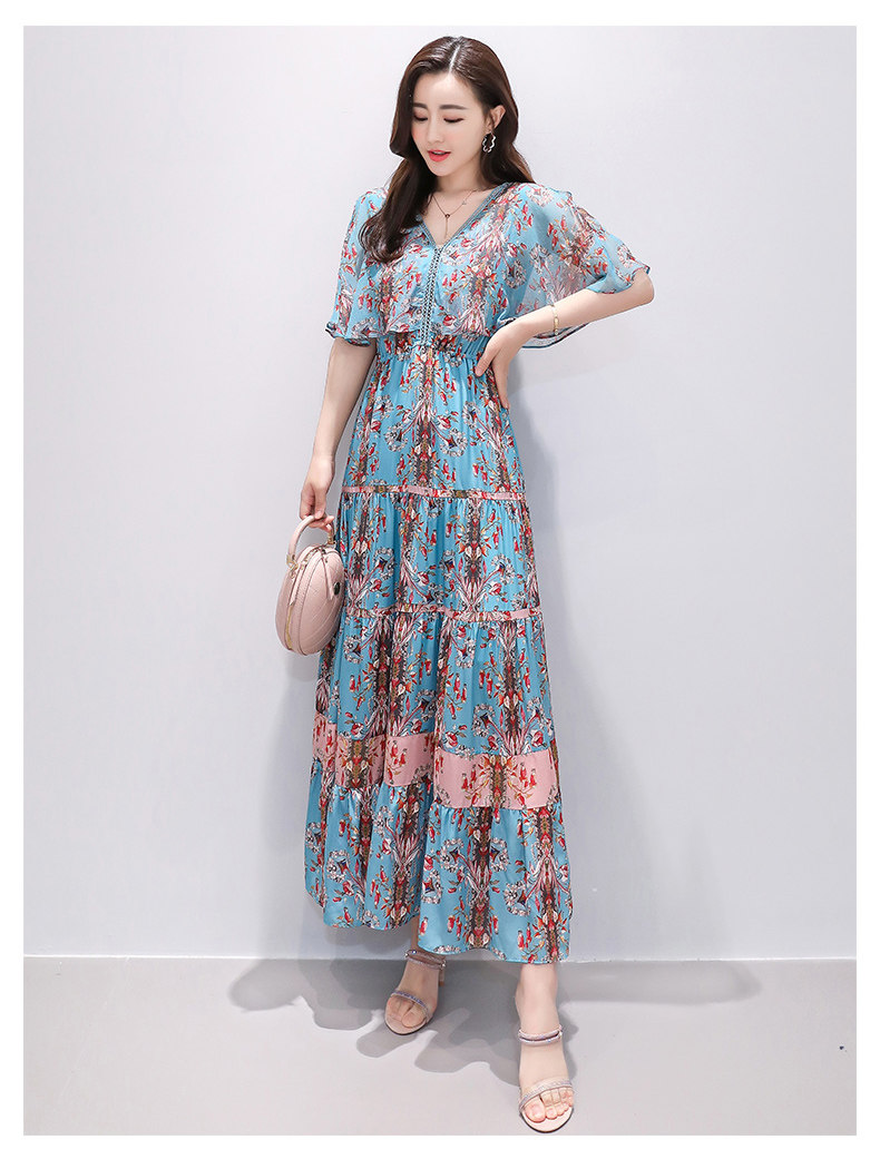 WZNH-QSLG9801A新款v领碎花裙长裙修身喇叭袖中腰雪纺连衣裙