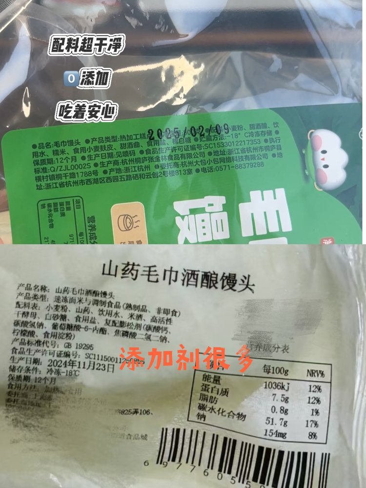 目前市面上很多毛巾馒头用的都是高活性干酵母发酵的,省时省力还省钱,添加剂也是一大堆。市面上在售的毛巾馒头做了对比,我们的配料表用的是甜酒酿和甜酒曲,市面上的很多都是用的高活性干酵母发酵的,有的还使用了复配蓬松剂等添加剂来增加馒头的蓬松度,这款毛巾馒头坚持0️⃣添加,用心做好每一个馒头!