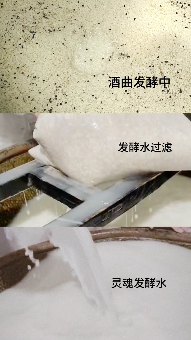 第二步是做发酵水。将发酵后的酒酿和麦麸、稀饭均匀搅拌后发酵12小时,再用纱布滤出发酵水。这发酵水就是馒头的灵魂所在。