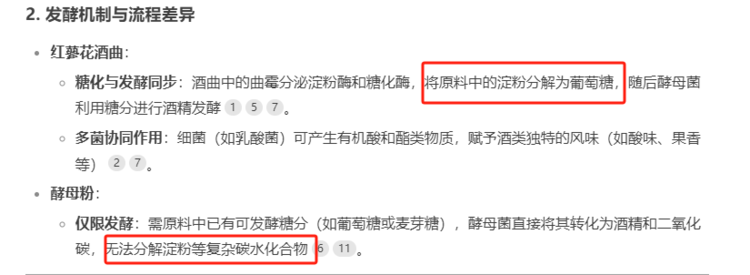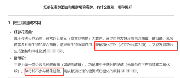 关于红蓼花酒曲和酵母粉发酵的区别,deepseek也给了很客观的对比分析: