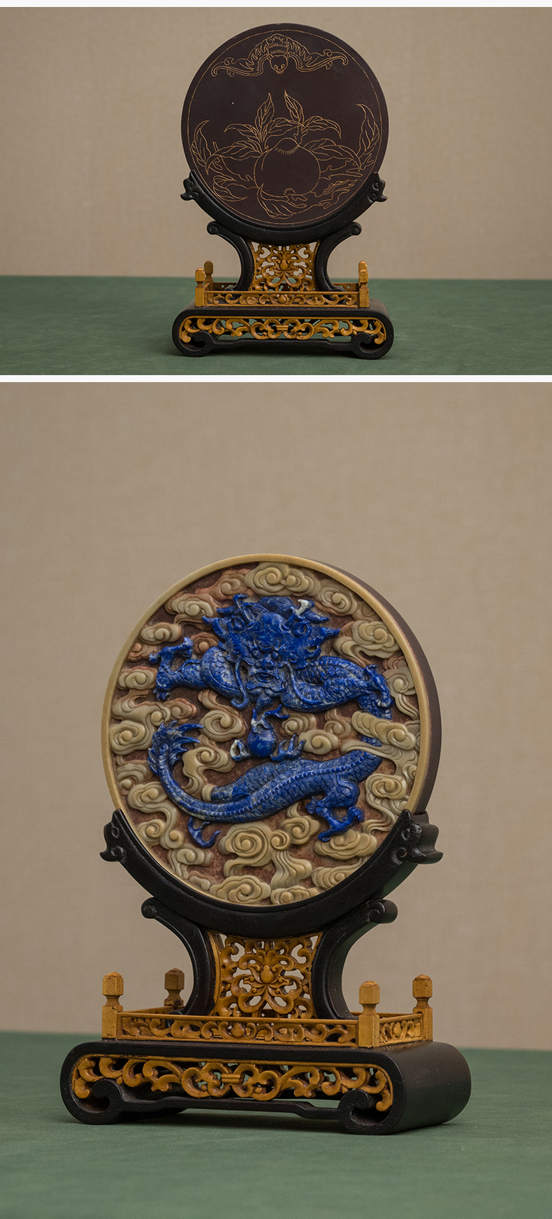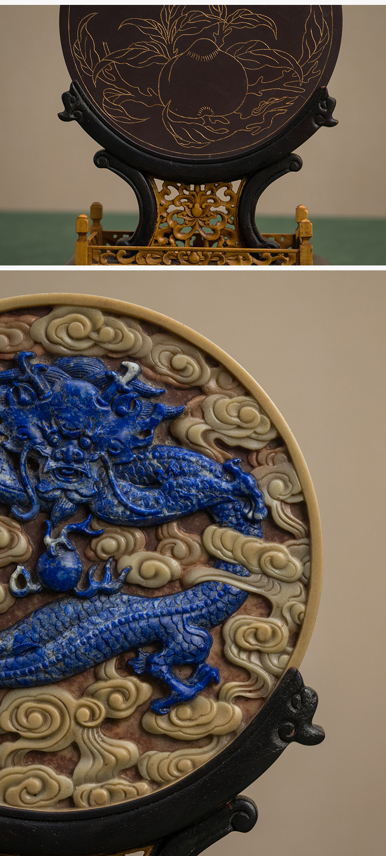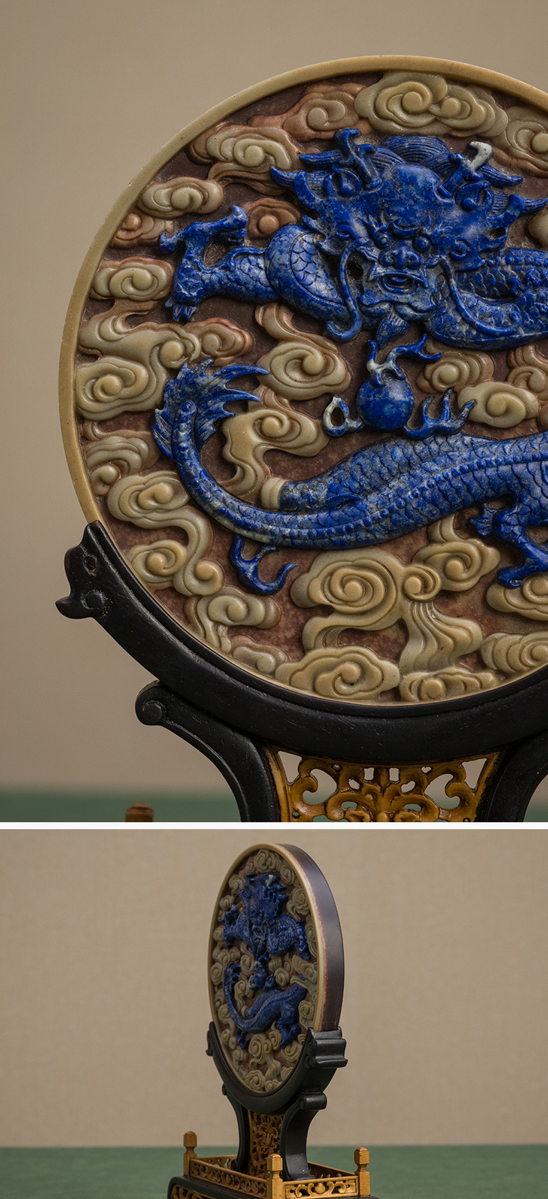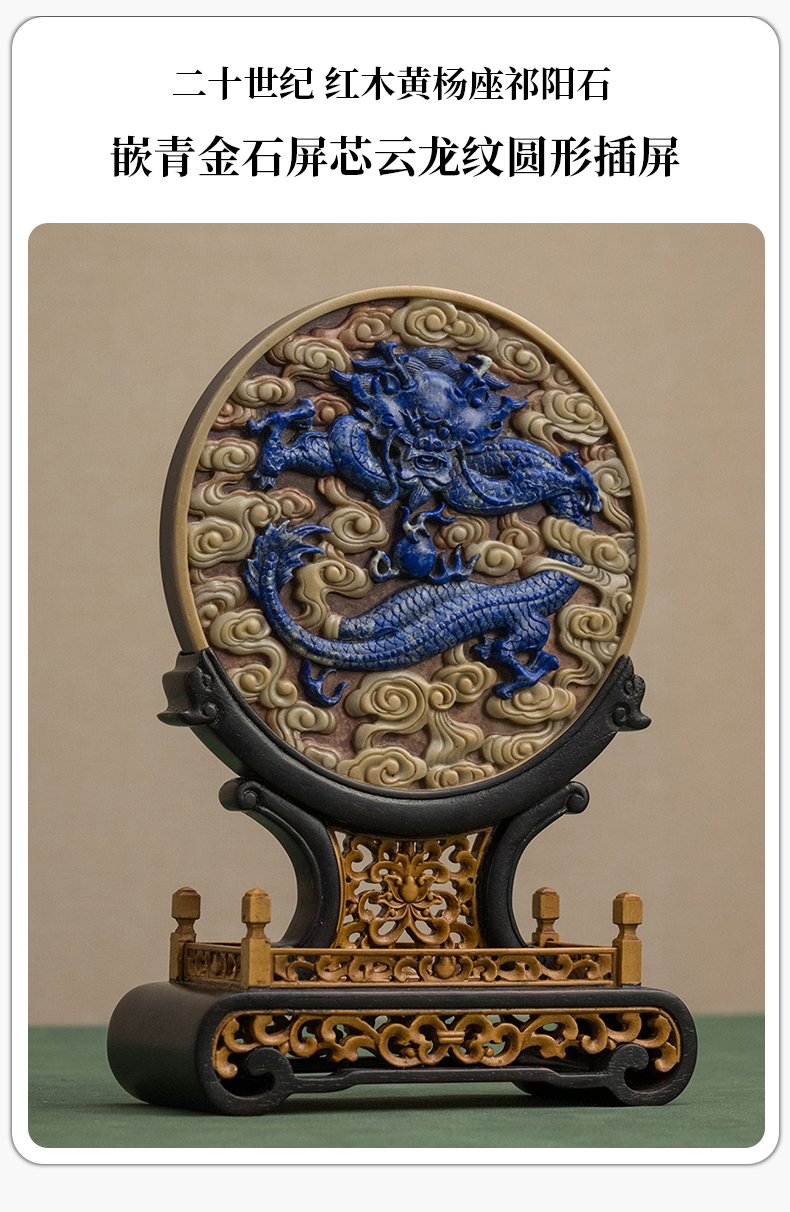 二十世纪 红木黄杨座祁阳石嵌青金石屏芯云龙纹圆形插屏