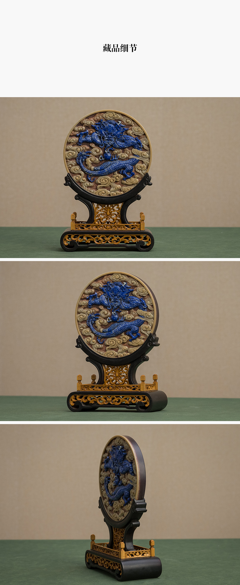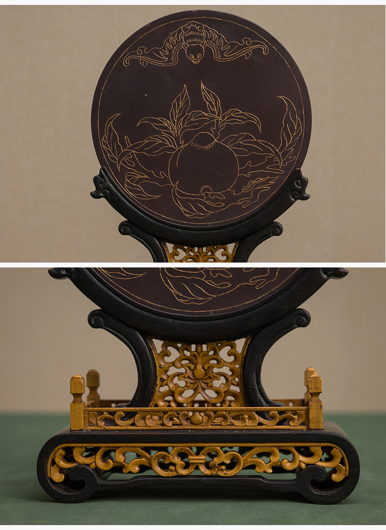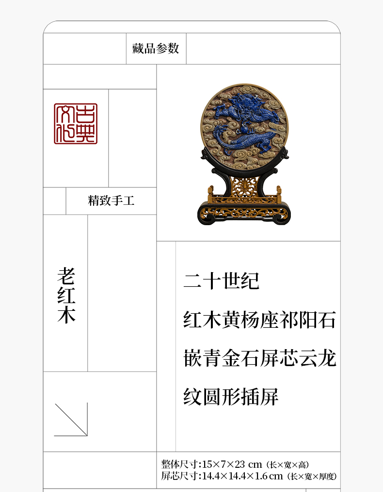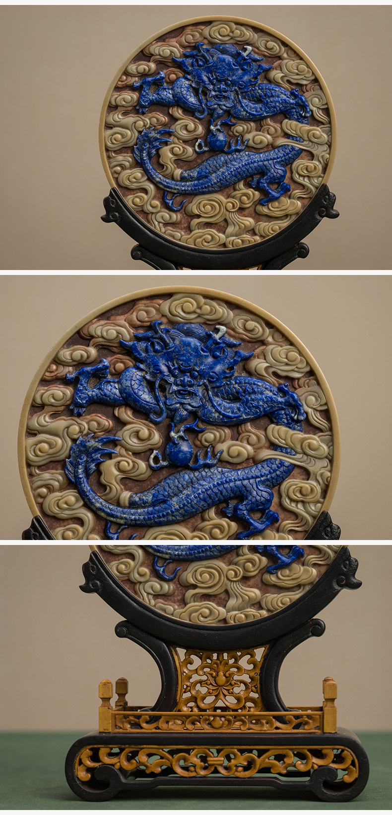 二十世纪 红木黄杨座祁阳石嵌青金石屏芯云龙纹圆形插屏
