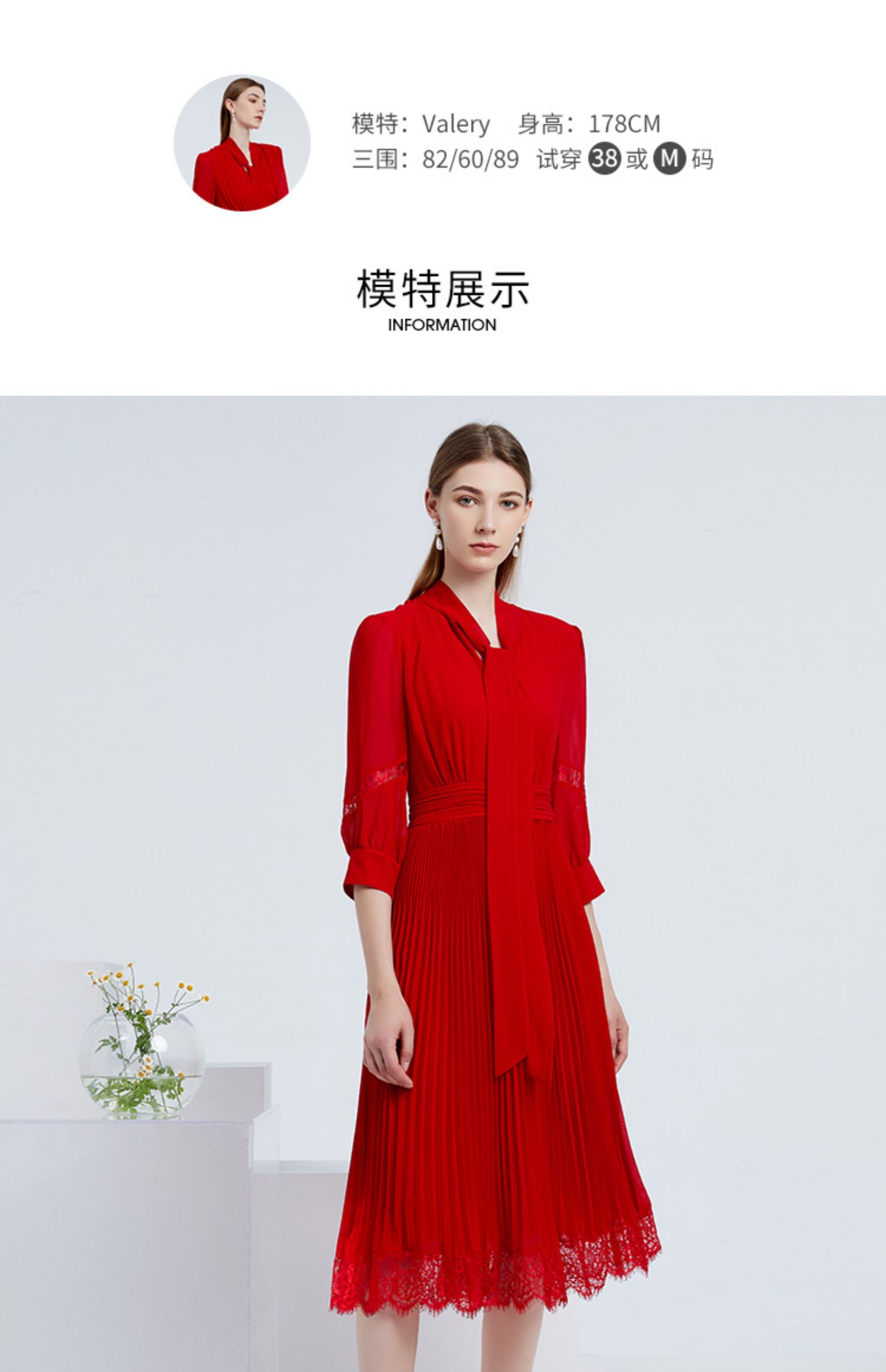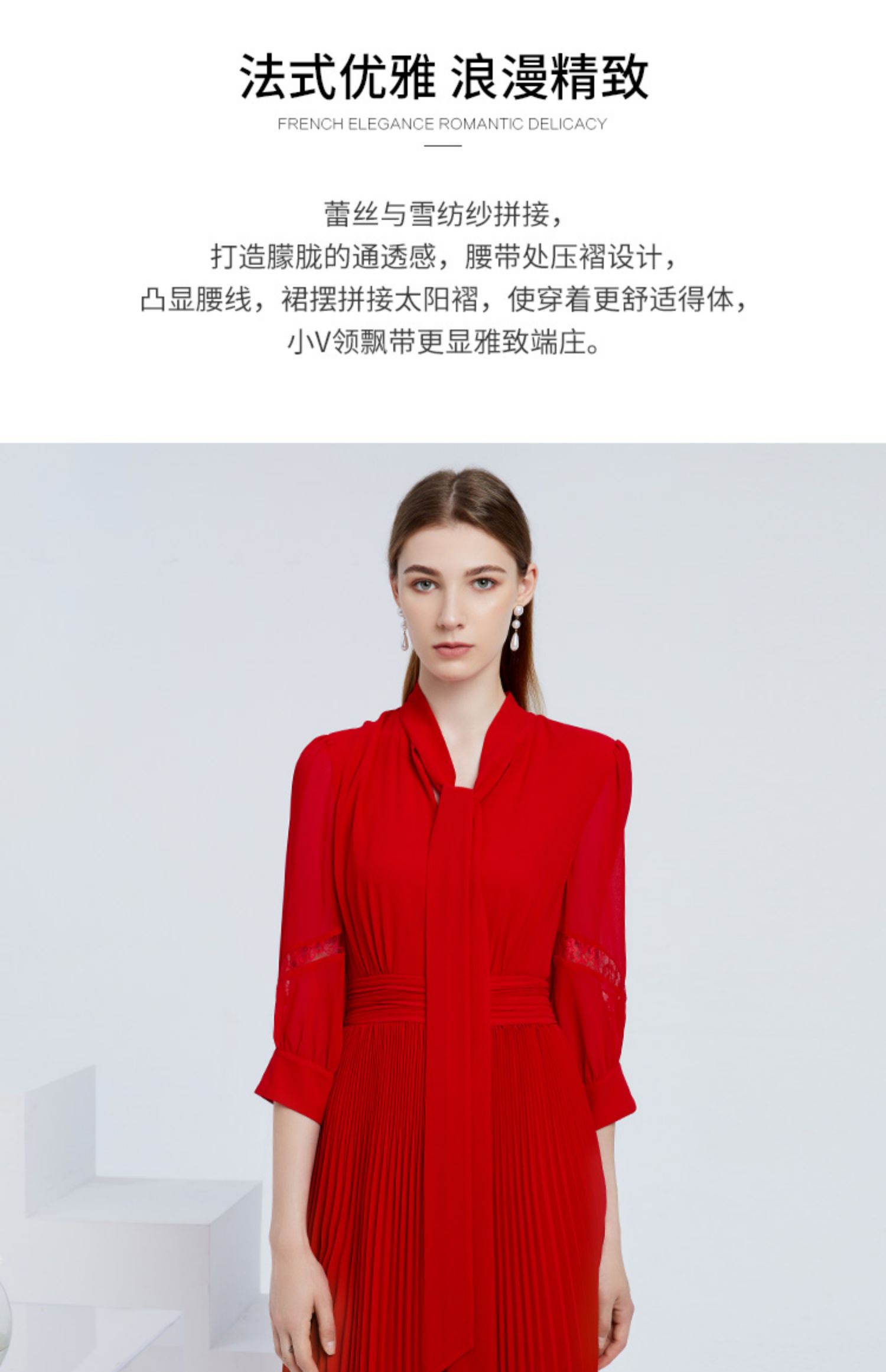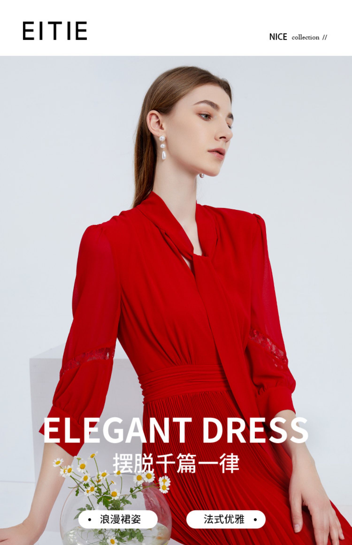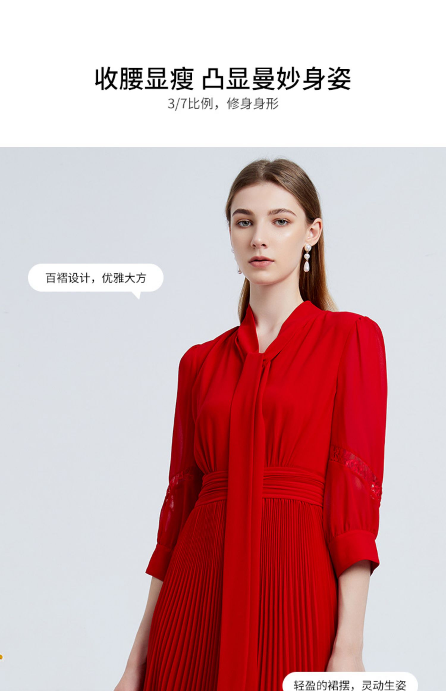 EITIE爱特爱秋季新款气质飘带V领七分袖显瘦A字百褶连衣裙女6507231