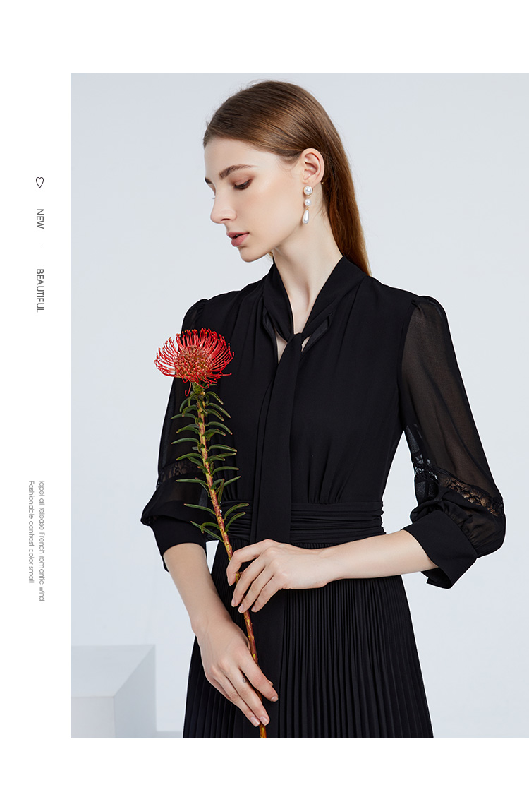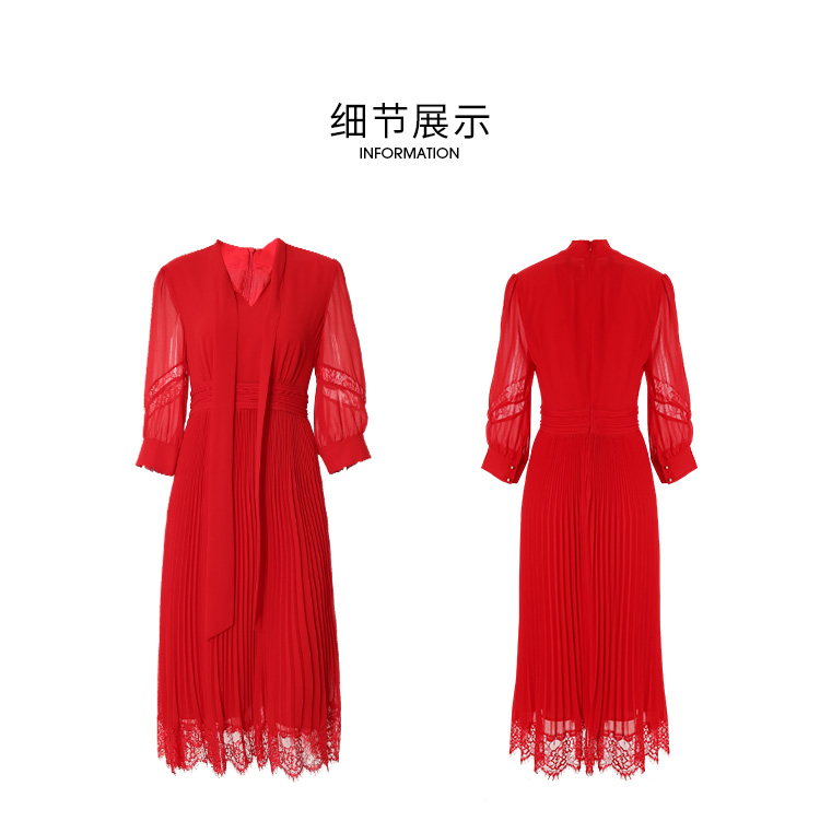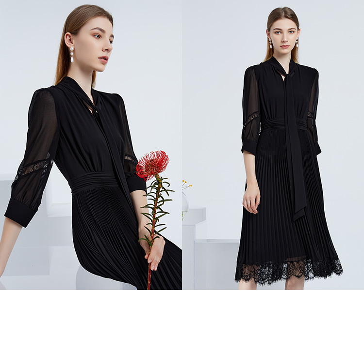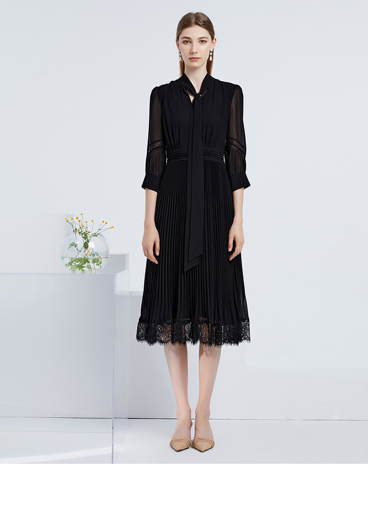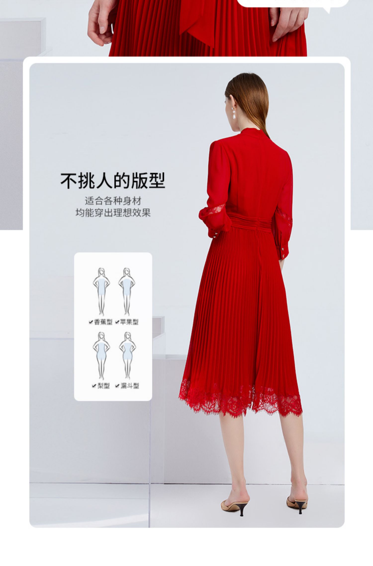 EITIE爱特爱秋季新款气质飘带V领七分袖显瘦A字百褶连衣裙女6507231