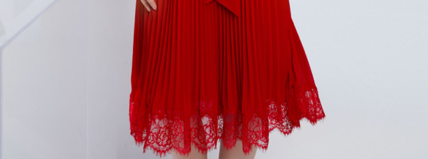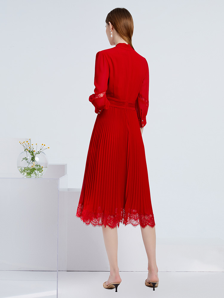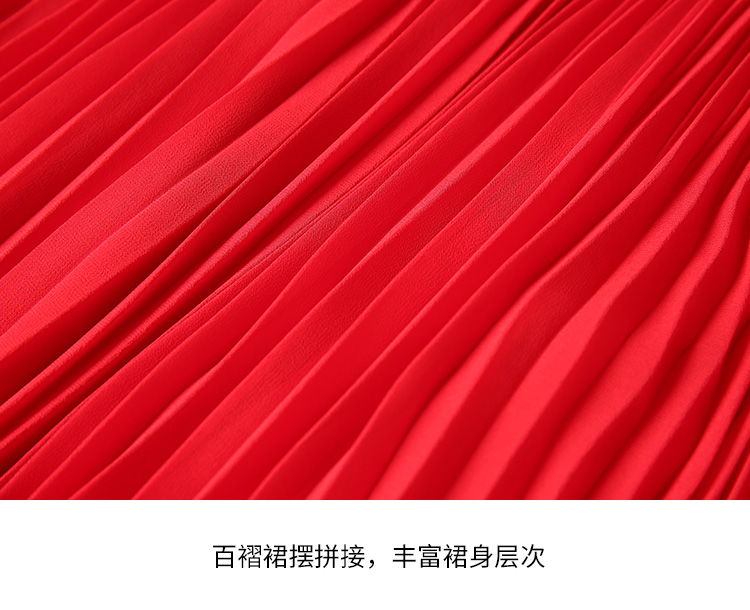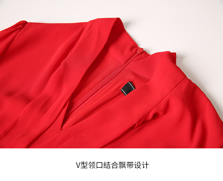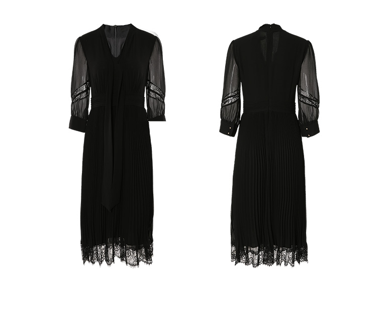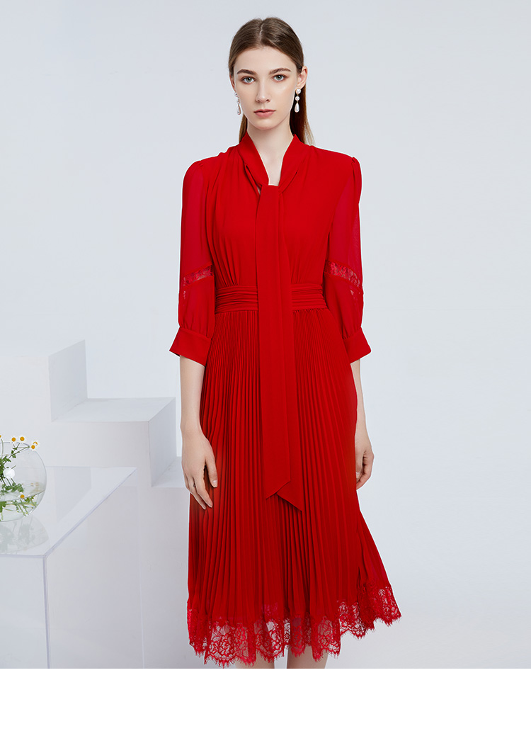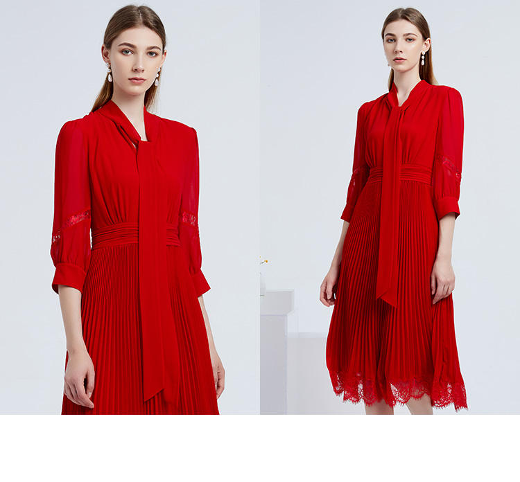 EITIE爱特爱秋季新款气质飘带V领七分袖显瘦A字百褶连衣裙女6507231