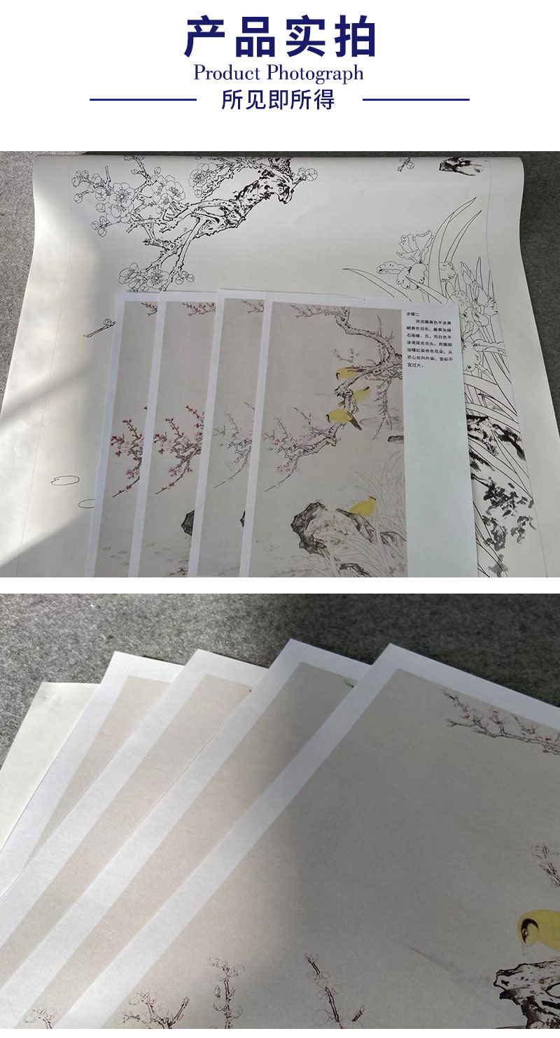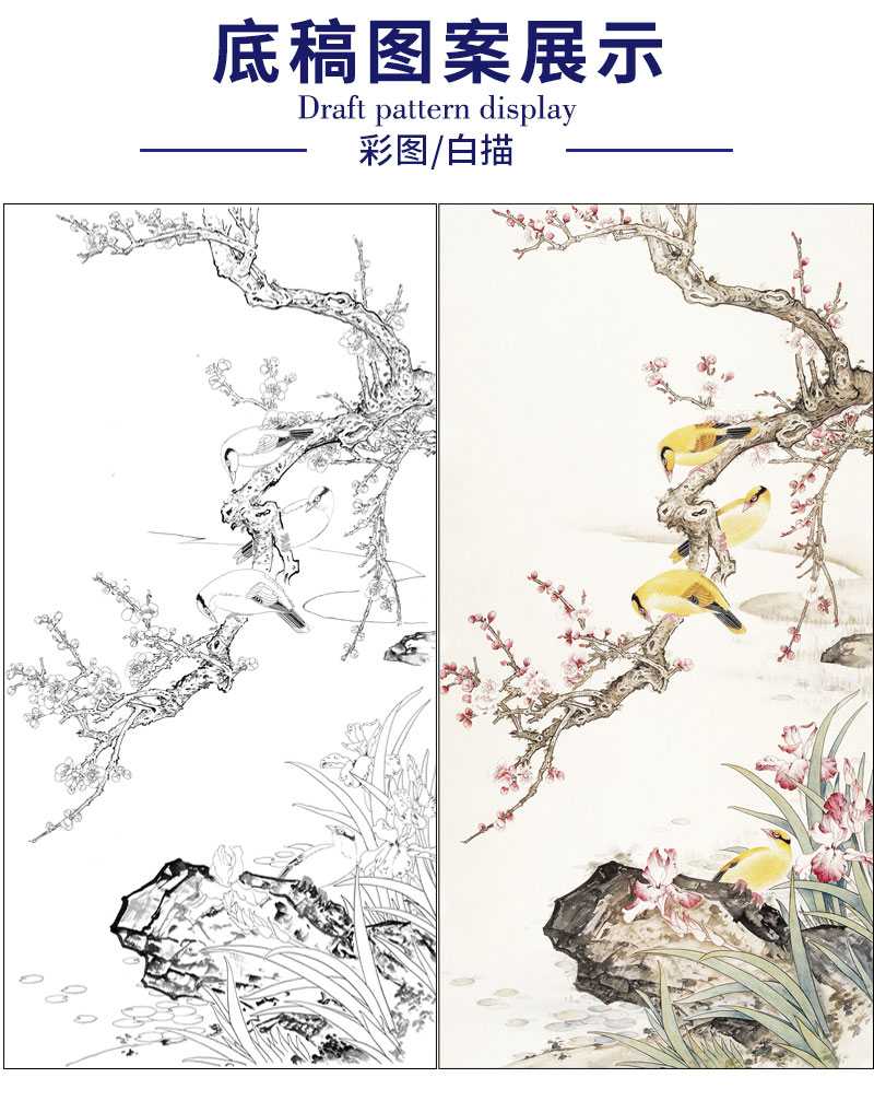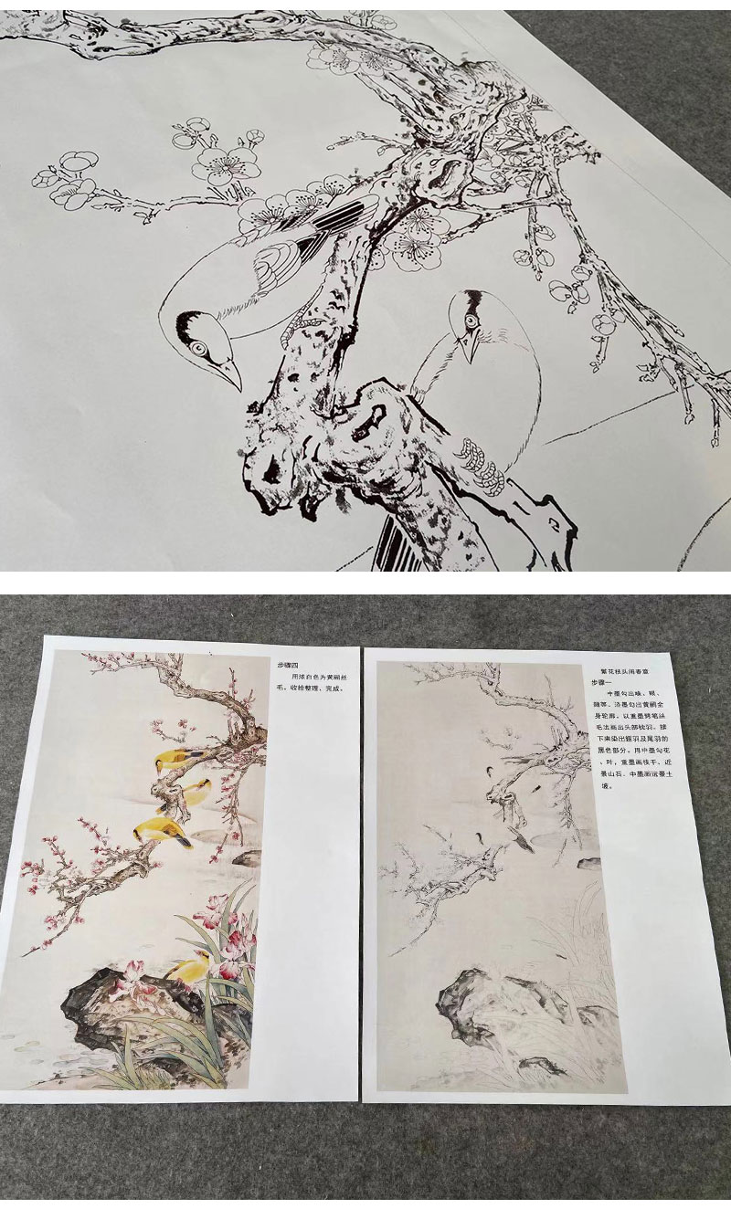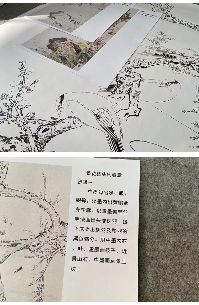 【有步骤】陈军工笔画白描底稿《繁花枝头闹春意》梅花黄鹂初学者临摹花鸟线稿CJ06