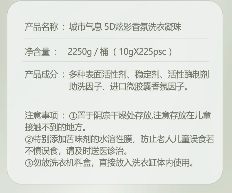 注意事项: ①置于阴凉干燥处存放,注意存放在儿童接触不到的地方。 ②特别添加苦味剂的水溶性膜,防止老人儿童误食若不慎误食,请及时送医诊治。 ③勿放洗衣机料盒,直接放入洗衣缸体内使用。