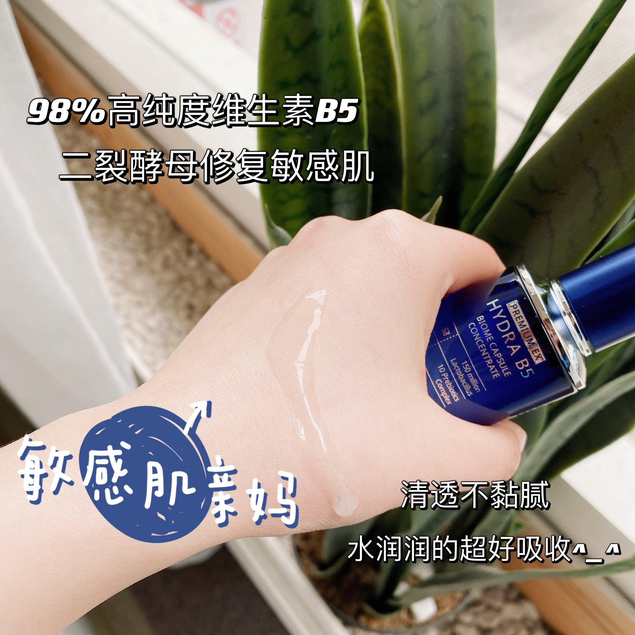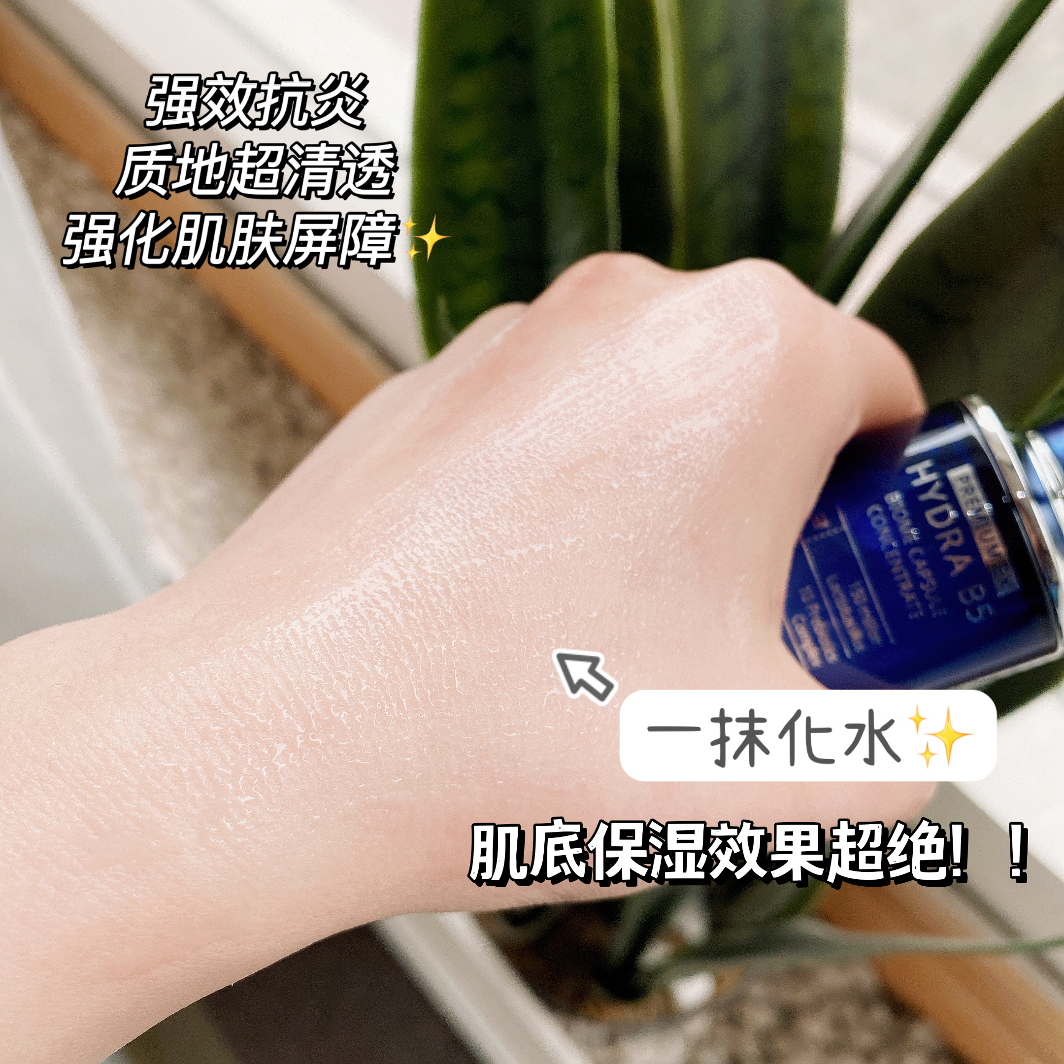这款是新包装款的哦~迅速渗进表皮层,能吸取1000倍水份分子进入肌肤底层,增加其锁水能力,并补充营养要素,促进胶原蛋白合成,修护细胞并柔软粗糙肌肤,改善过敏,舒缓红痕现象,使用后肌肤注满水分,倍觉水嫩清新。皮肤薄、脸部发烫、皮肤粗糙的救星#韩国AHC B5玻尿酸高效水合啫喱保湿原液精华#全脸搽上B5精华待干透后,其实就是说明精华已经被皮肤吸收了,精华就像一层营养薄膜一样覆盖在脸上,建议白天如果是要上妆的亲,只用一点点精华就可以了,晚上使用的话用两滴左右,不需要搽得太厚哦,会影响吸收的。