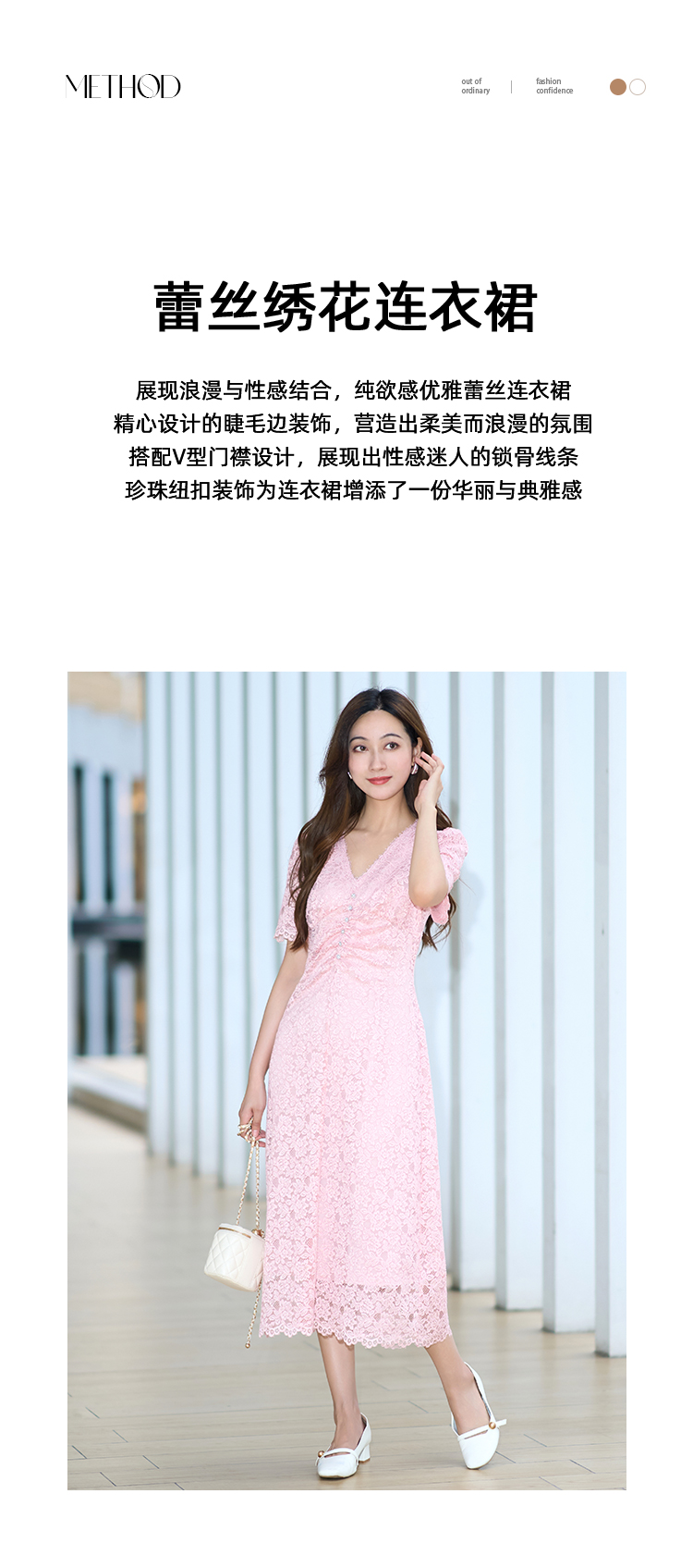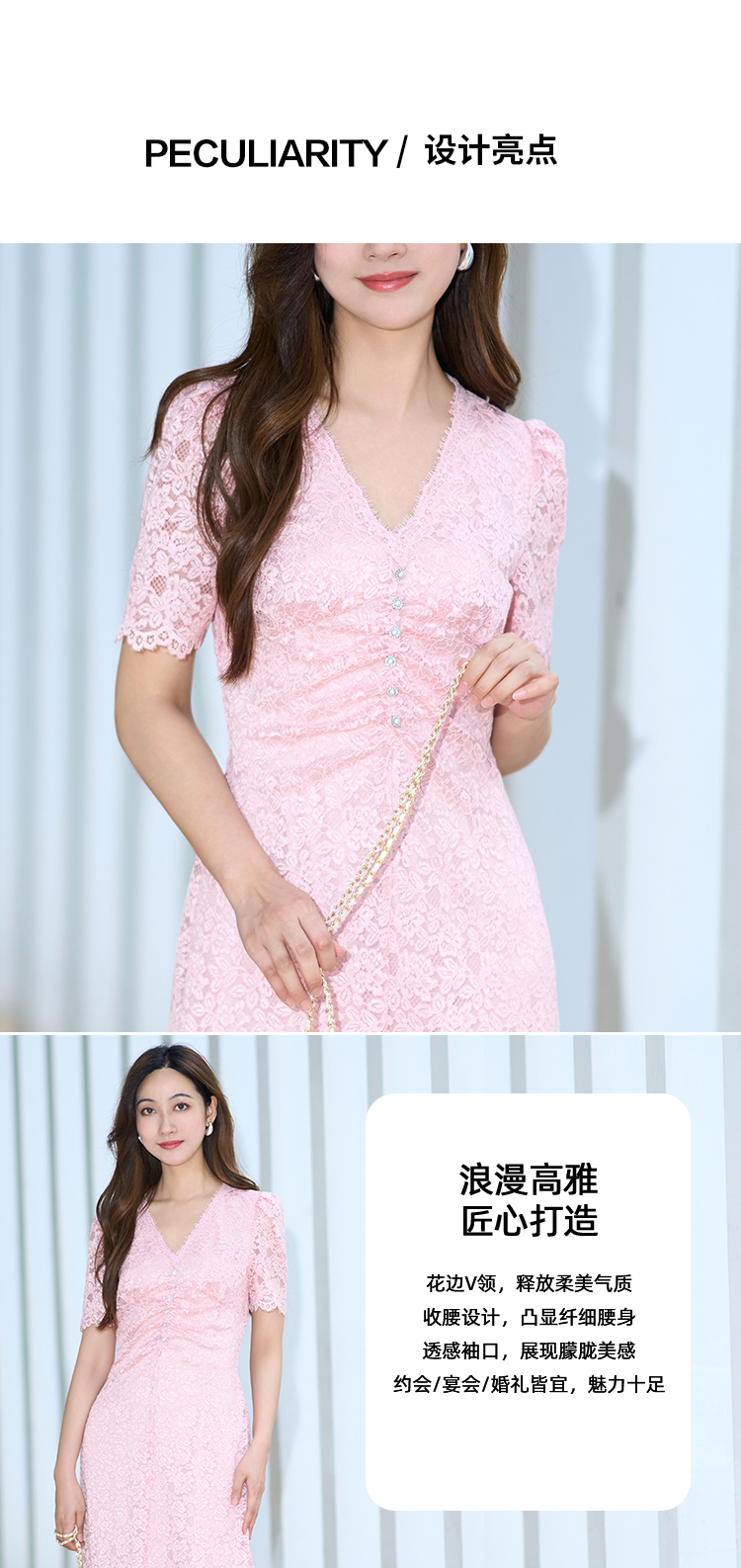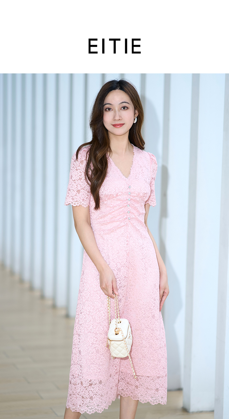 EITIE爱特爱法式复古粉色蕾丝V领压褶修身显瘦连衣裙夏季新款B2407330A