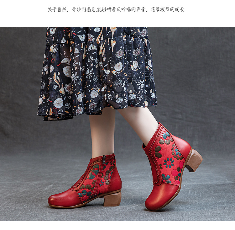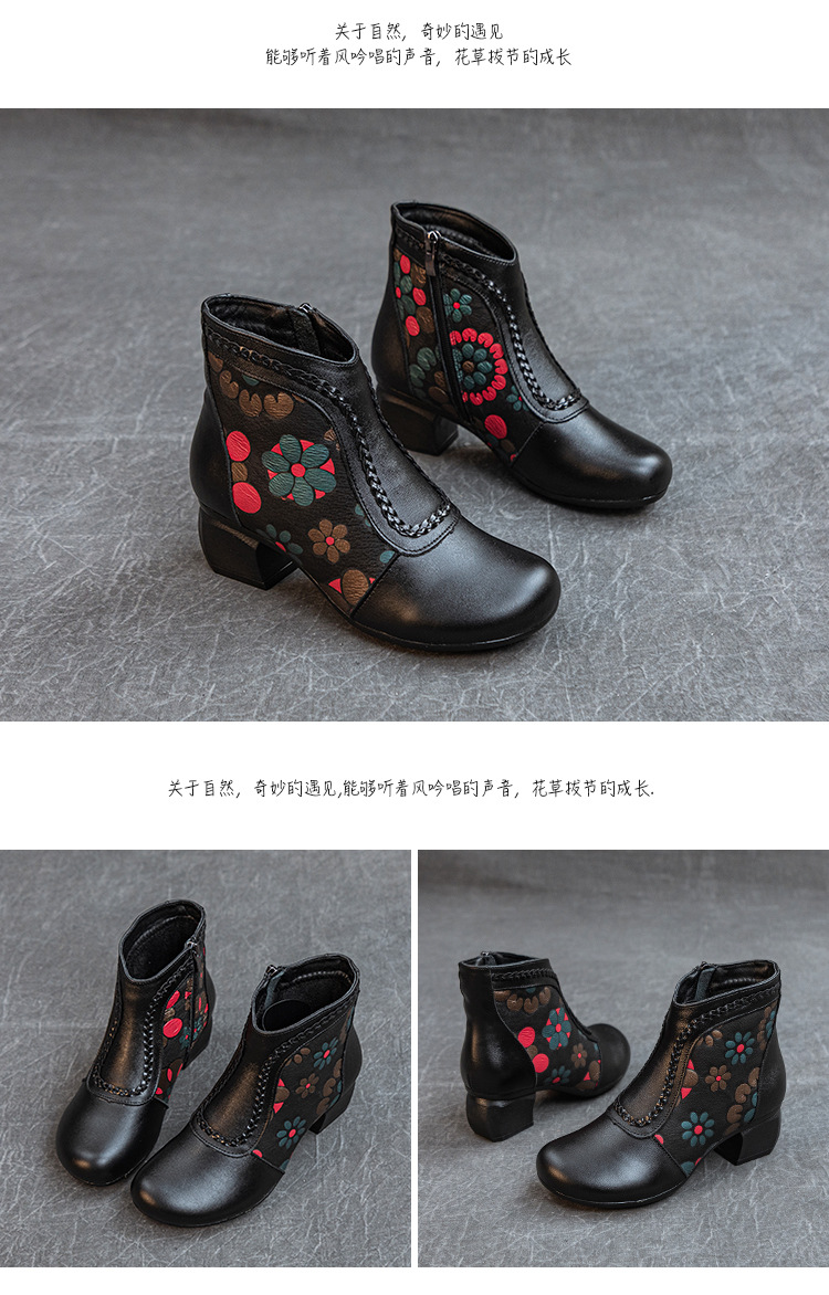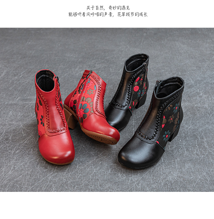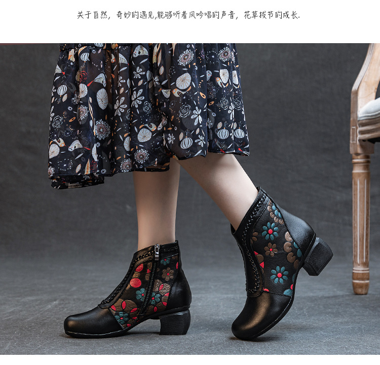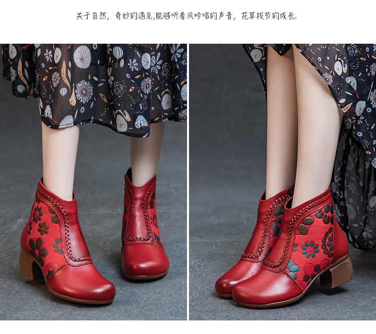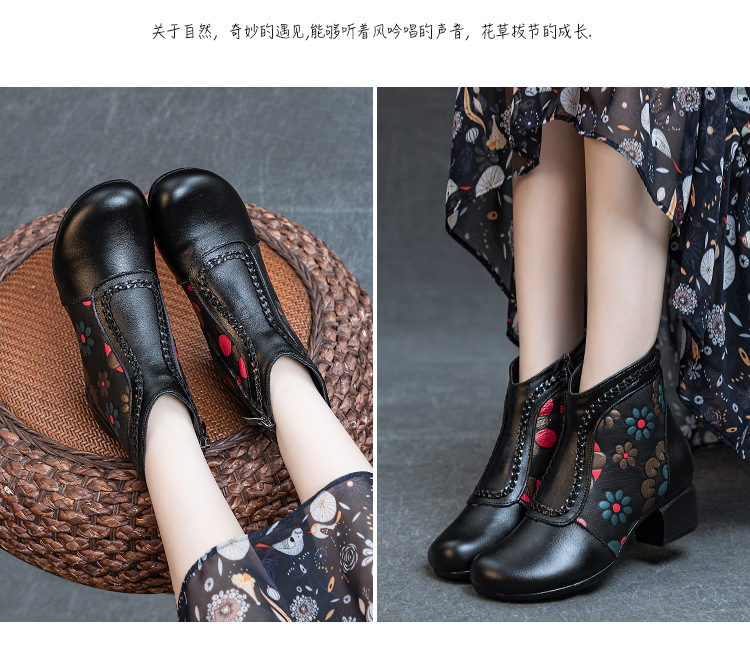 GL20239靴子女2023秋冬新款民族风真皮拼色印花女靴粗跟软底短靴 商品图3