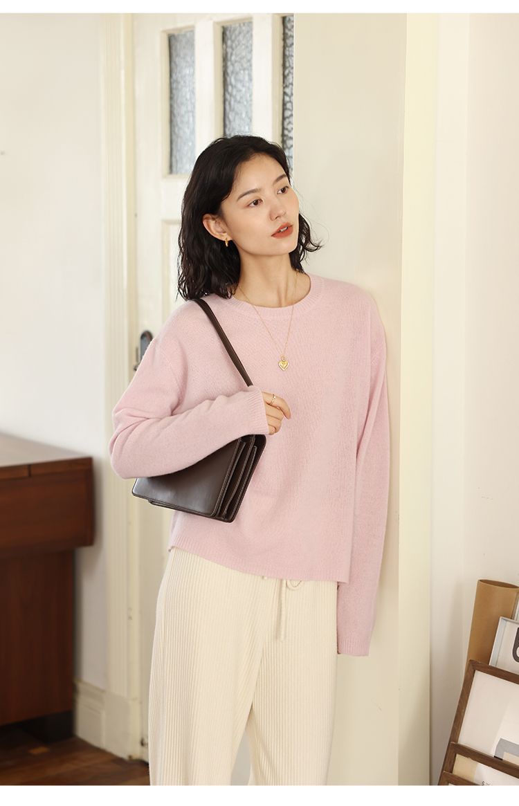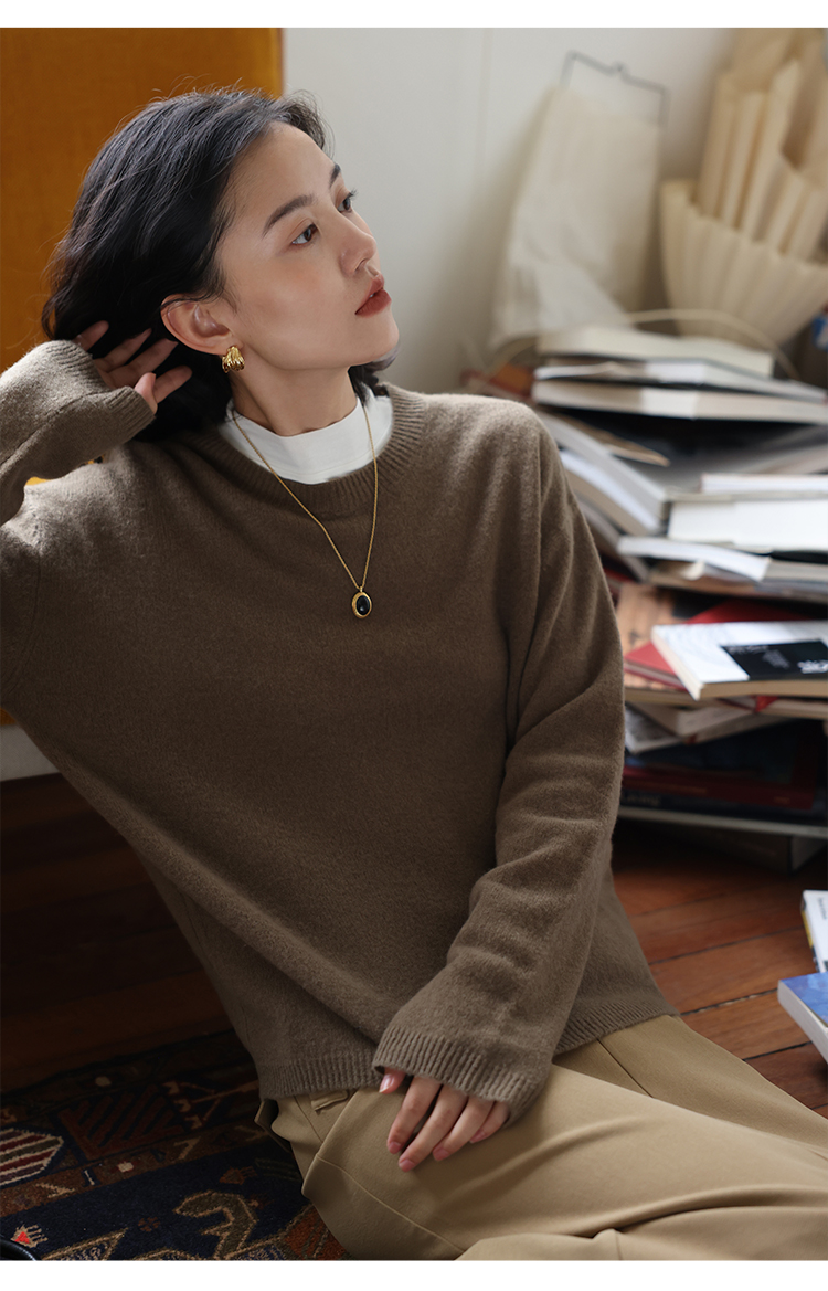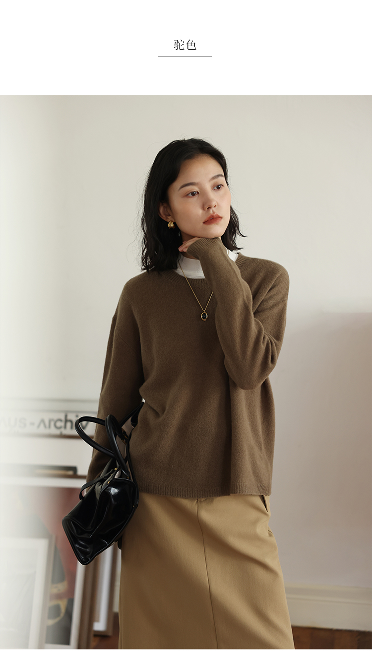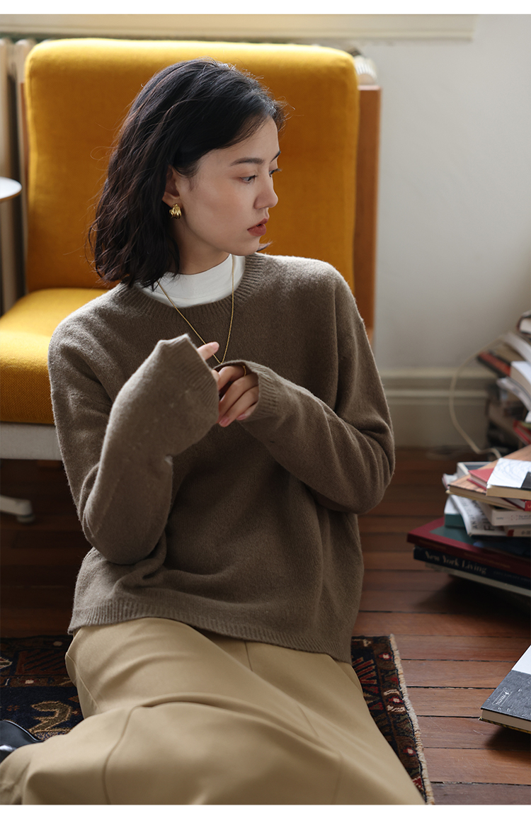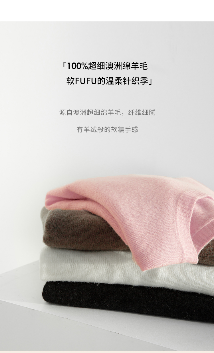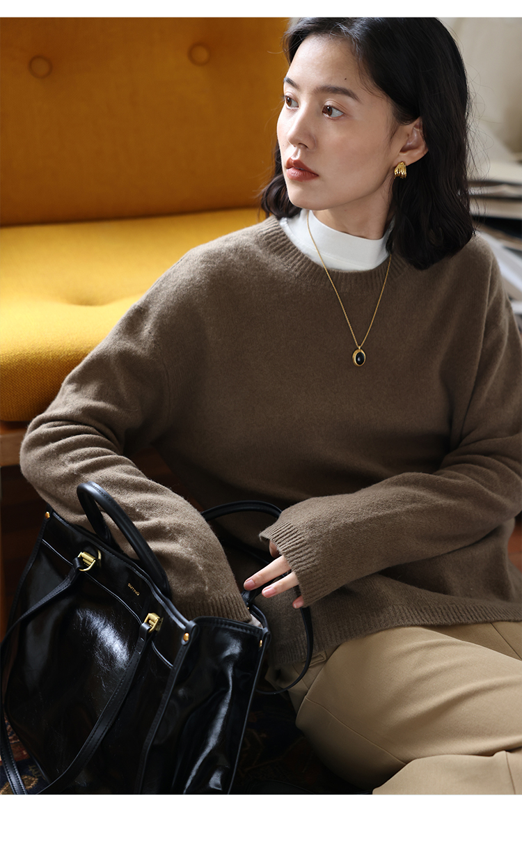 HeyDress100绵羊毛毛衣女秋冬法式圆领宽松针织衫慵懒感套头上衣