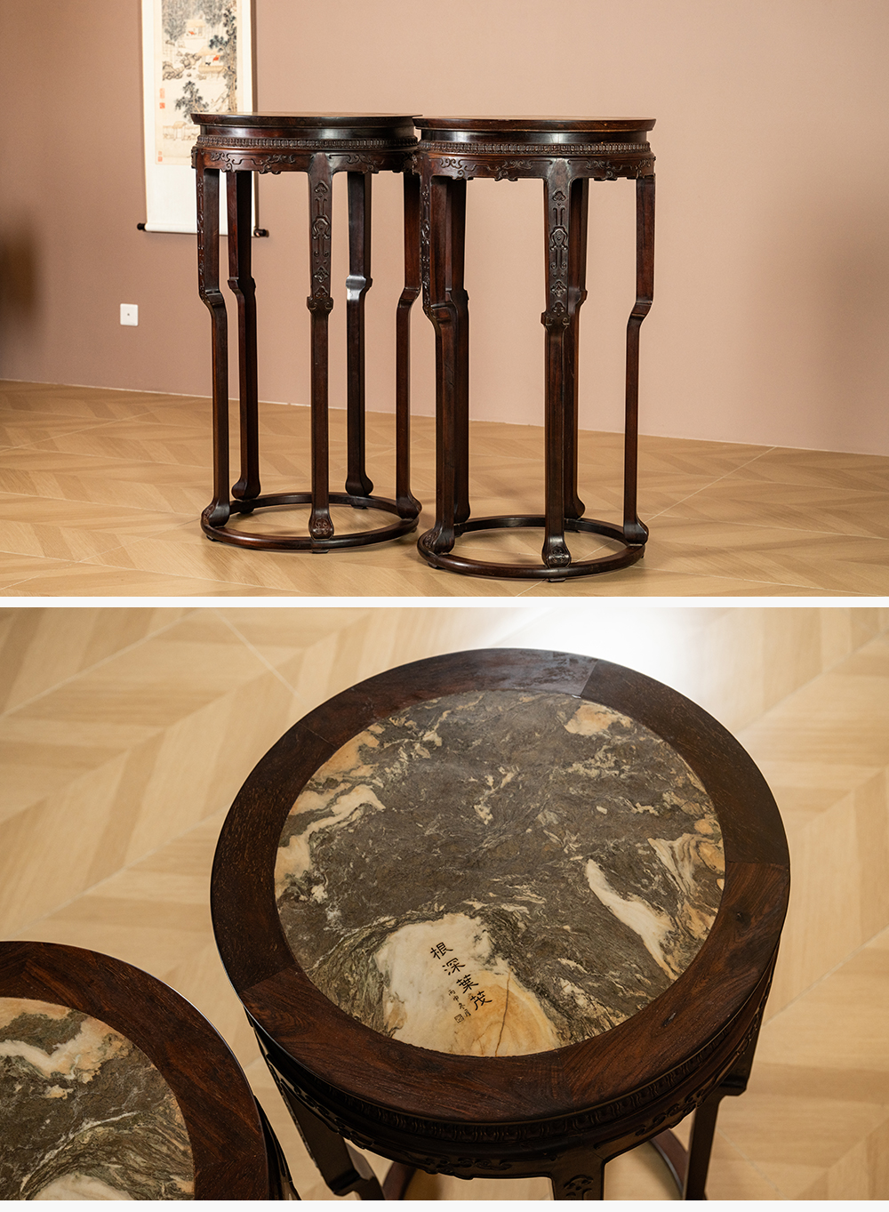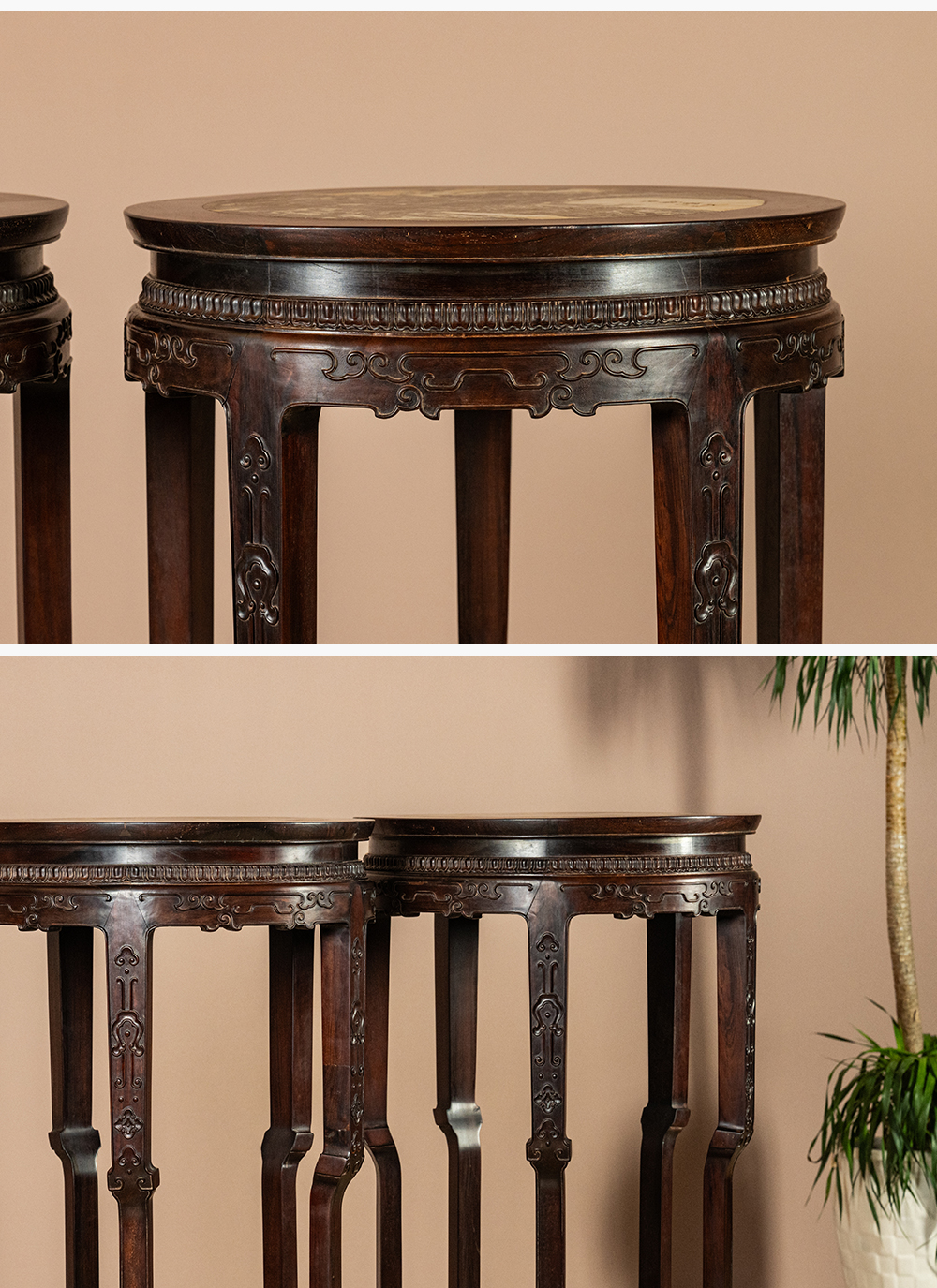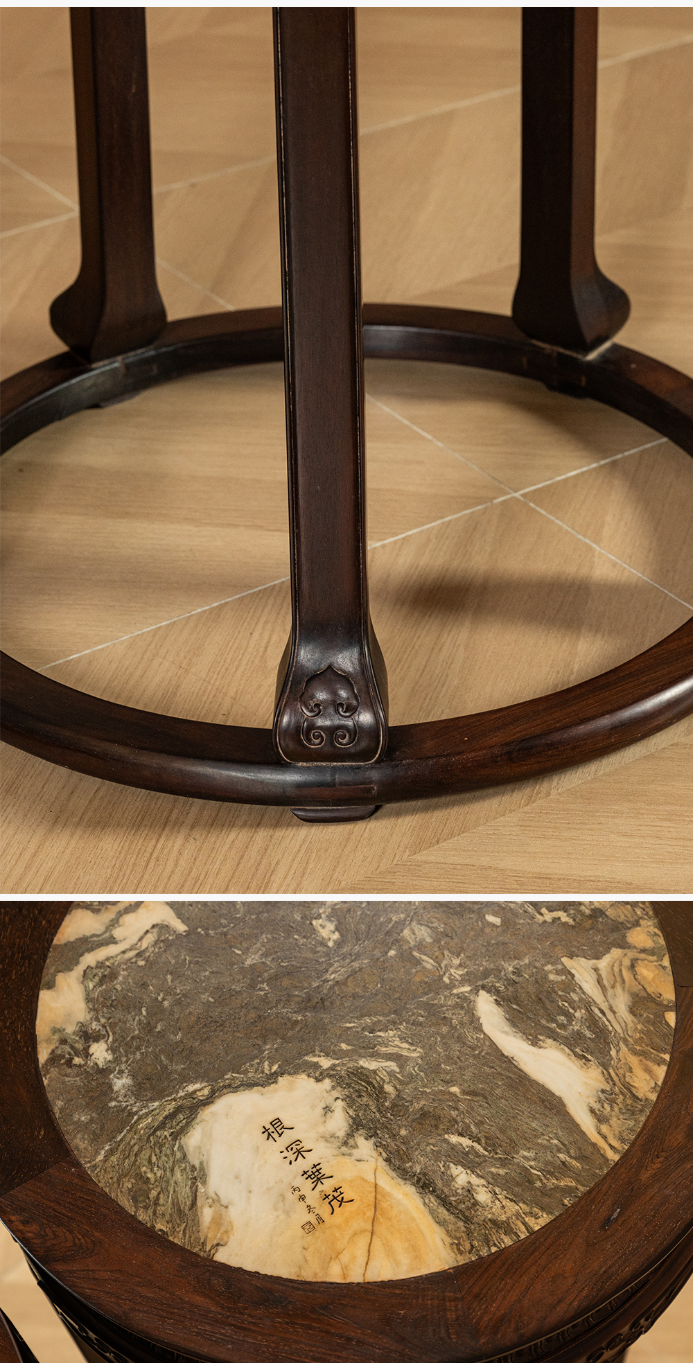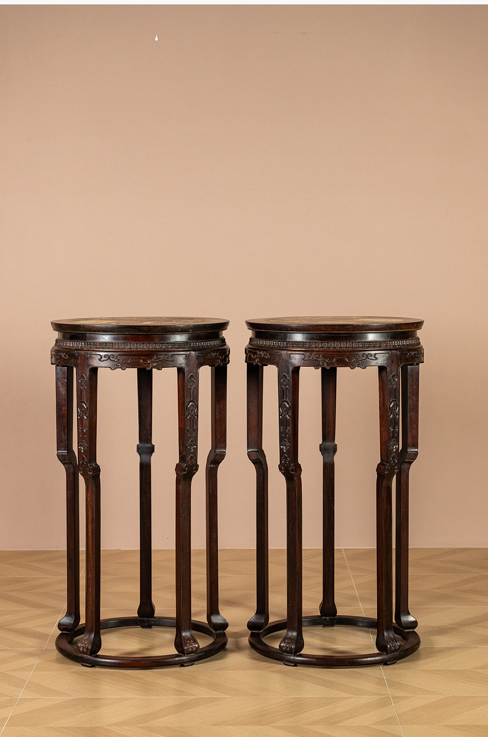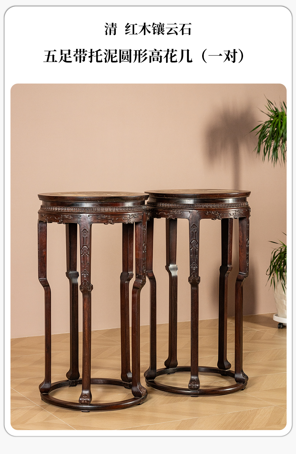 清 红木镶云石五足带托泥圆形高花几(一对)