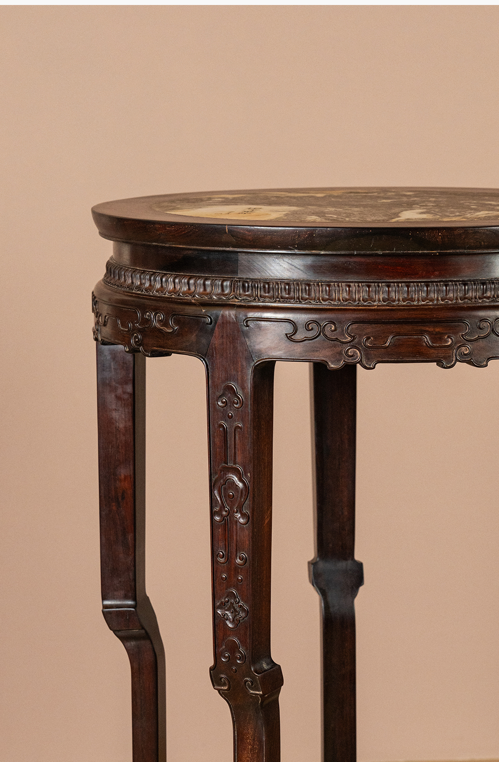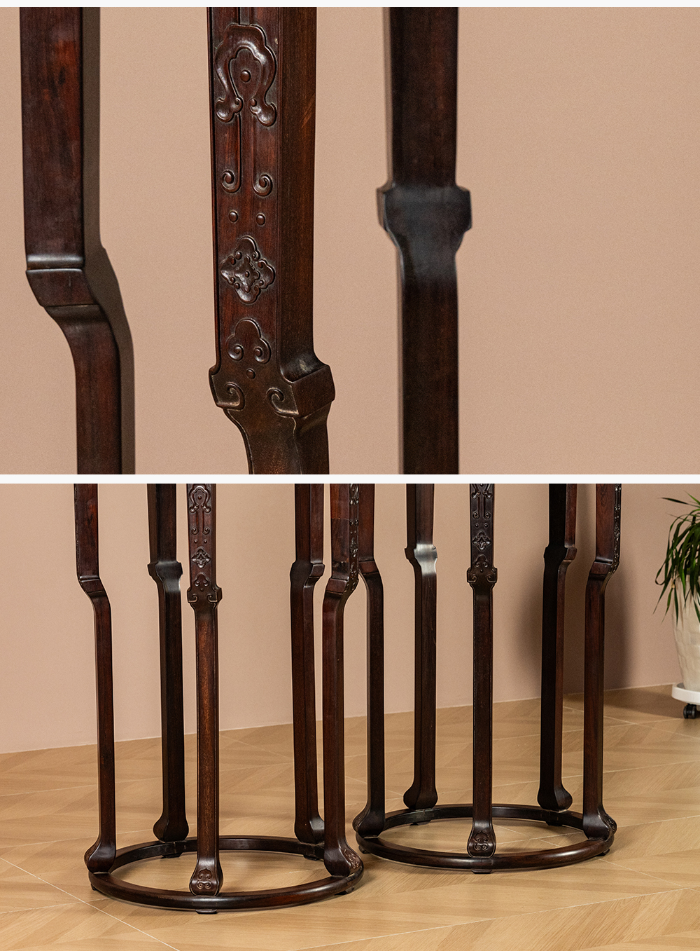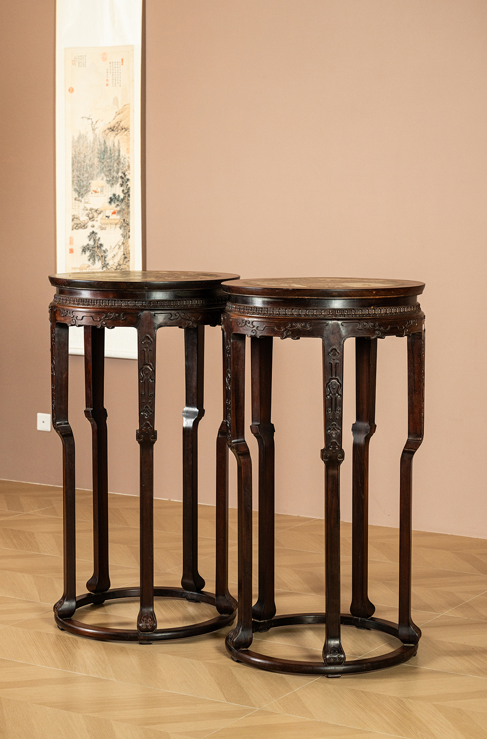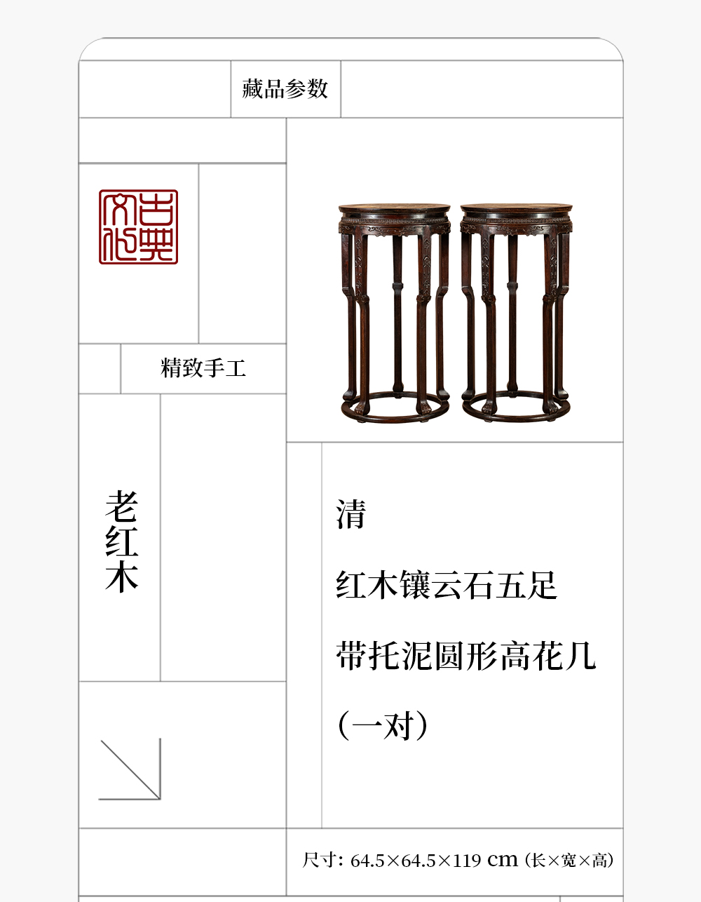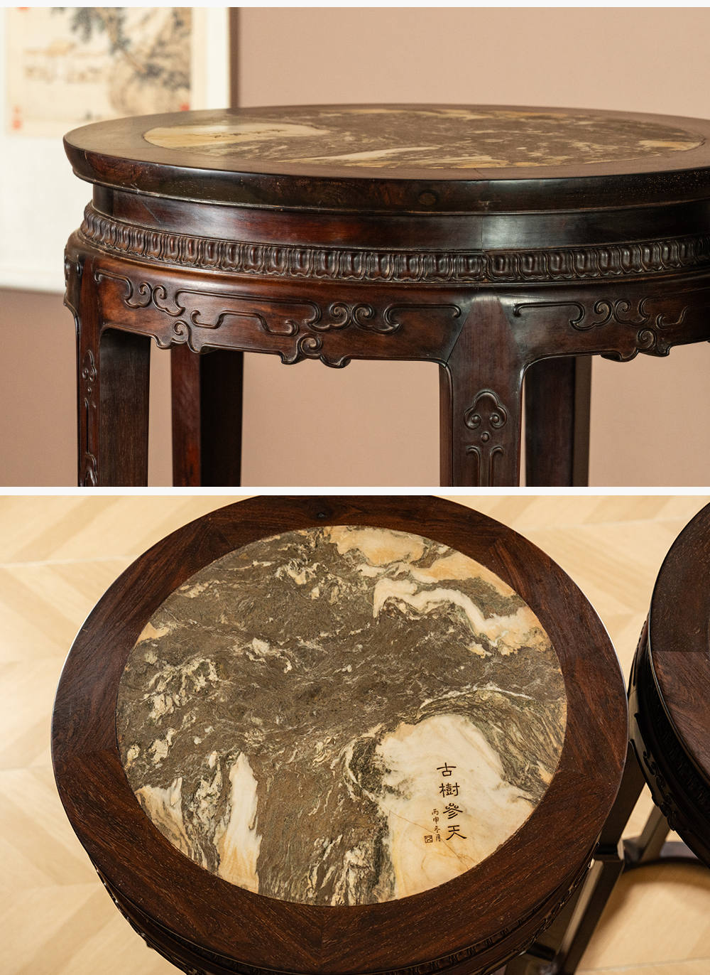 清 红木镶云石五足带托泥圆形高花几(一对)