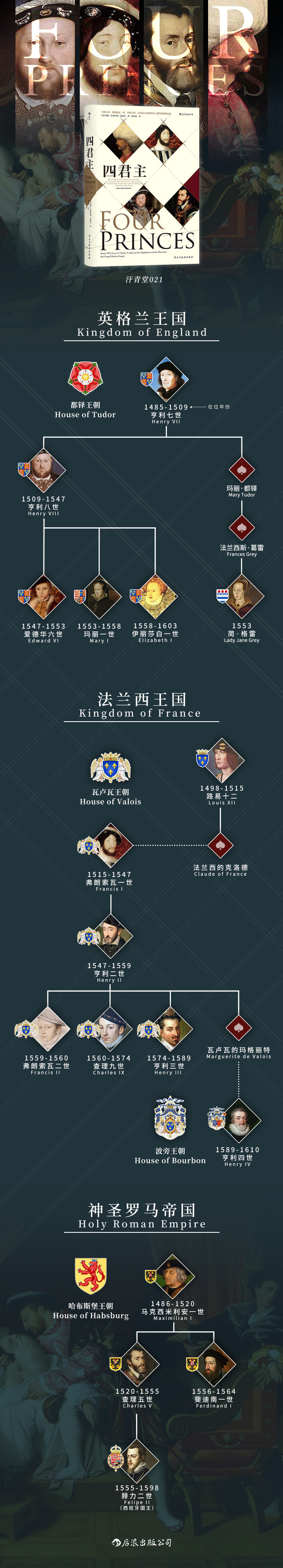 英格兰国王亨利八世、法国国王弗朗索瓦一世、神圣罗马帝国皇帝查理五世和奥斯曼帝国苏丹苏莱曼大帝,这四位伟大的君主出生于同一个十年(1491—1500年)。他们在各自国家的历史上都有着重要意义,而在本书中,约翰·朱利叶斯·诺威奇放大了视角,在文艺复兴和宗教改革的背景下,向我们展示了这四位君主之间的恩怨纠葛是如何为现代欧洲奠定基础的。分开来说,他们各不相同,亨利有六任妻子,查理则秉持禁欲主义;四人一并来说,他们曾支配着世界舞台。