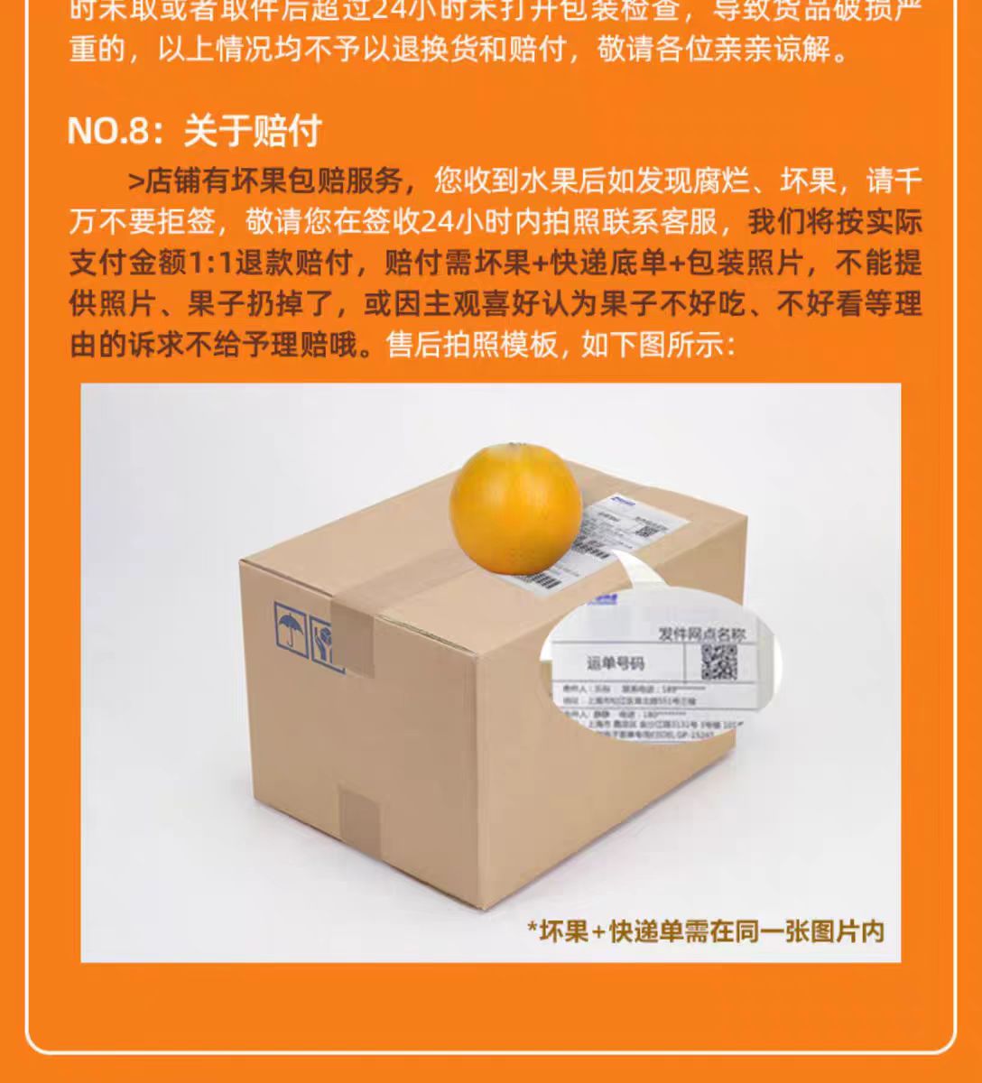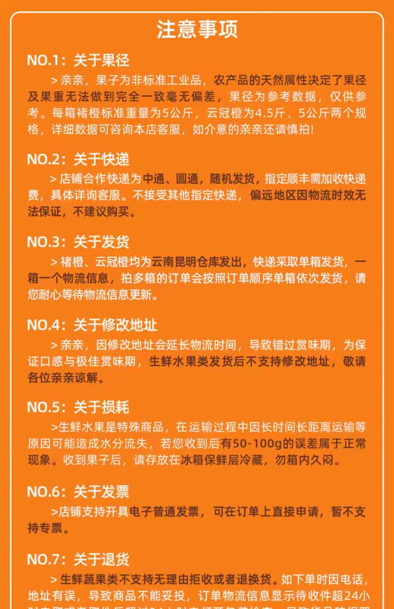 售后规则:褚橙售后需要快递面单加坏果图片一起拍照, ,售后是按照实付金额的比例,实付金额/个数*坏果 。
