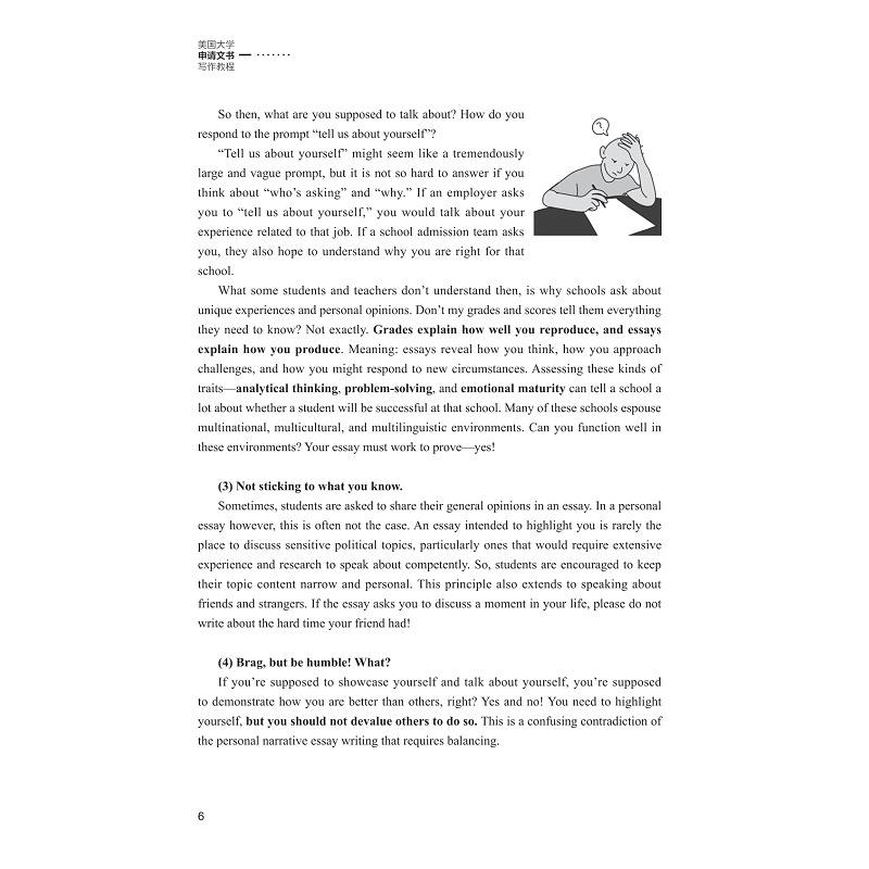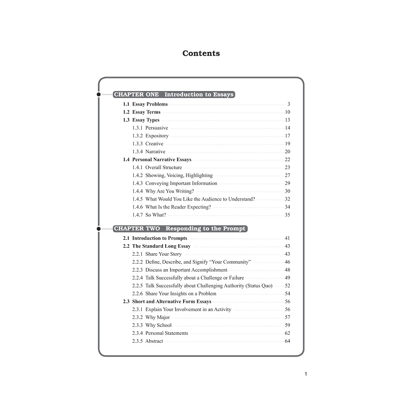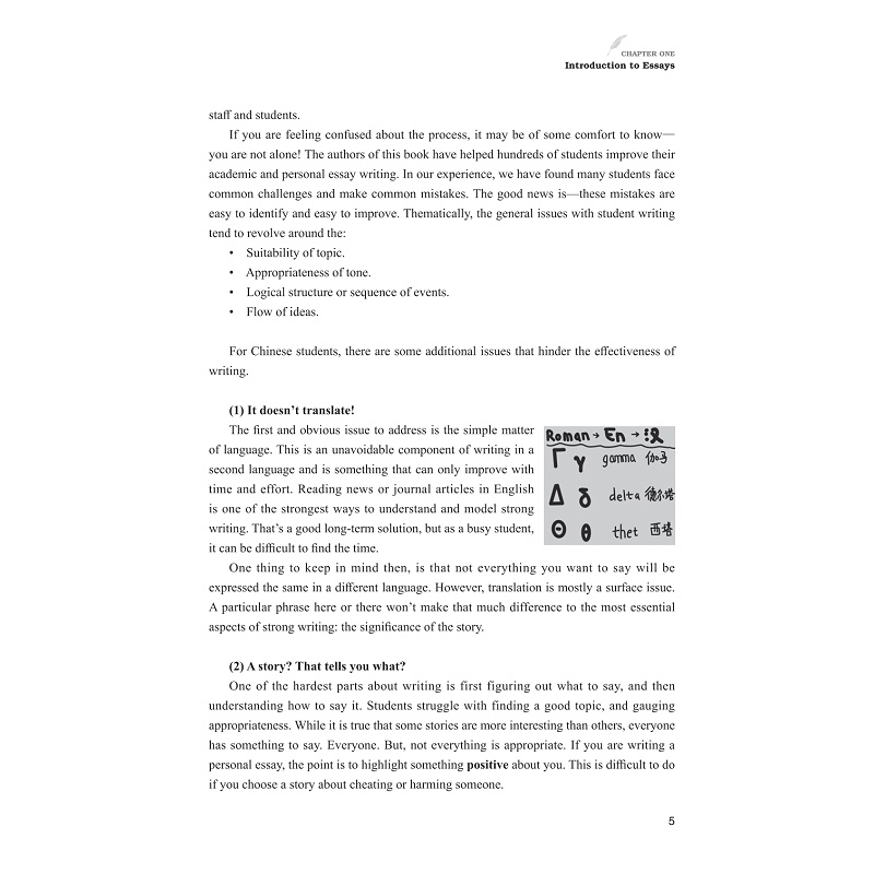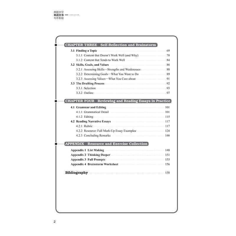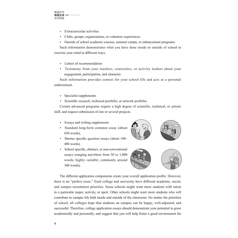 本书第一章主要通过介绍Essay这一体裁的分类,让学生理解大学申请文书(Personal Essay)的文体特征,尤其是文书写作的语言风格,写作目的。同时例举中国高中生在文书写作中所犯的典型错误。这些错误主要来自文化与语言的差异。第二章介绍文书各类题目特点,并通过例子来阐释如何满足文书题目要求。第三章着重引导学生如何寻找自身的特长,学业目标,价值观等,并通过这些来组织写作素材,如何构思并形成文章。第四部分指导学生如何研读范文,修改范文,理解优秀文书的评价标准。这部分重点例举了文书写作的文法与修改方法,并对历届优秀范文进行点评与修改。本书最后一部分包含每个章节的练习或活动。