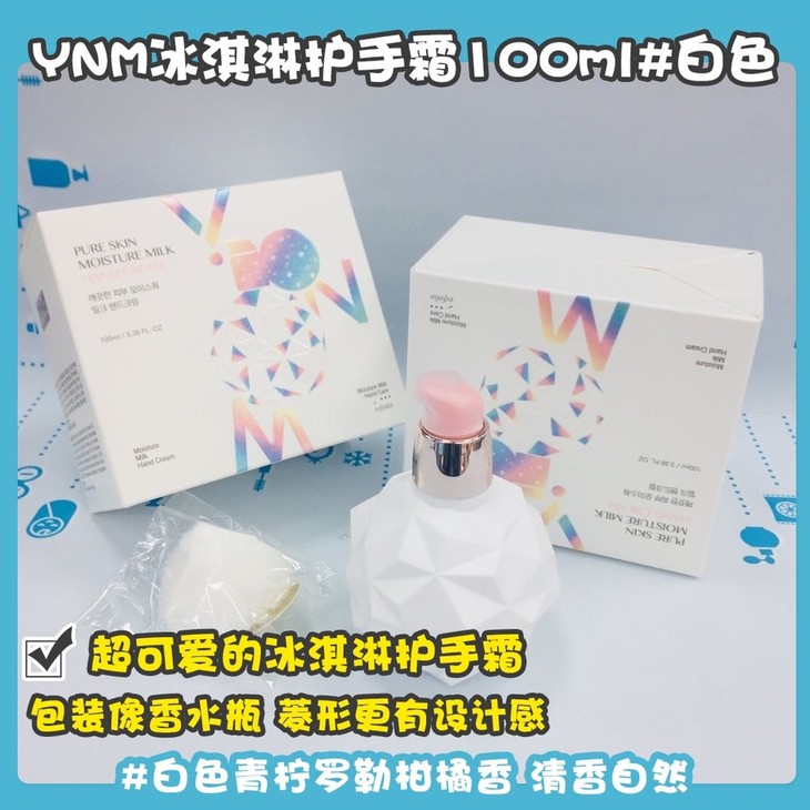 YNM冰淇淋护手霜100ml#粉色/#白色 👍超可爱的冰淇淋护手霜🍦,香香软软的太萌了吧💕,简直是小可爱本尊👅。包装像香水瓶,菱形更有设计感😎,配了一个小毛球像极了兔子尾巴🐇。改善手部肌肤干燥💦,清爽柔嫩肌肤,仿佛喷了香水一般😊,这种斩男小可爱还不赶紧buy起来~⚪#粉色东方花香调,让人联想到神秘女性魅力/⚪#白色青柠罗勒柑橘香,清香自然。