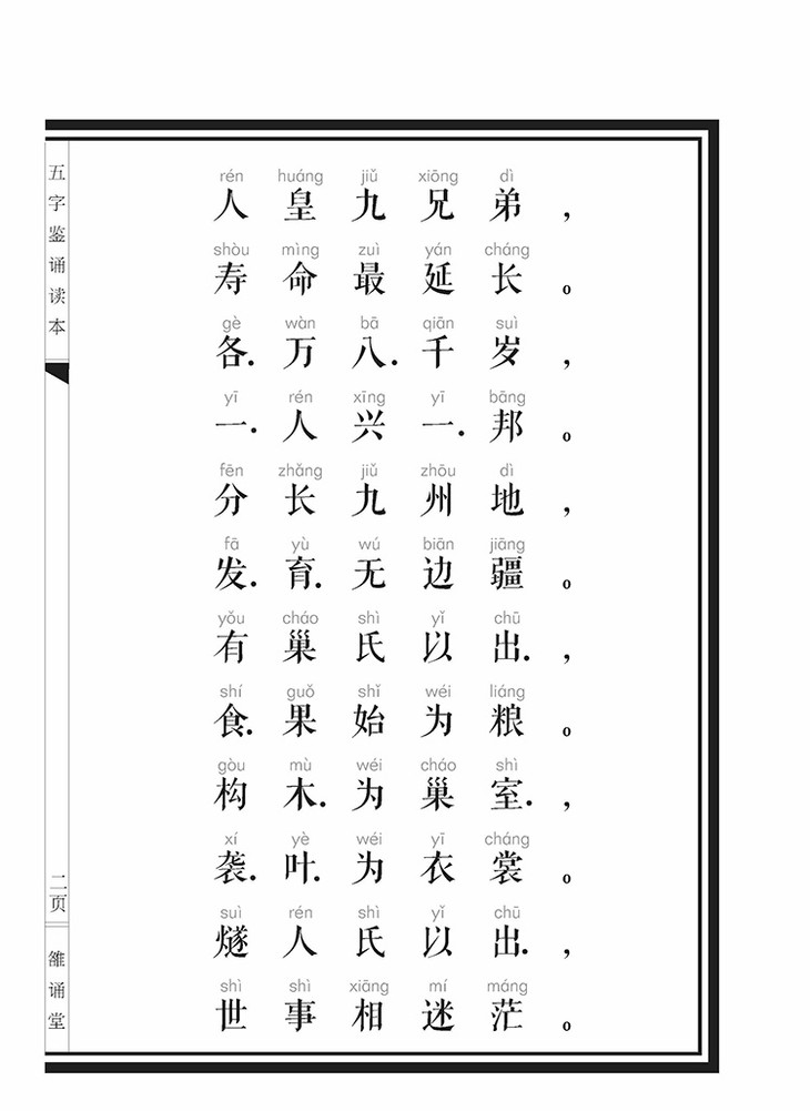 《五字鉴》将我国上至远古蒙昧时期,下至元明时代的社会历史发展,按时间顺序,描述得详尽、生动。而且主要选择一些历史大事,省略了细枝末节。以五字诗歌形式写成,读起来琅琅上口,易记易诵,是历代读书人都很喜欢的启蒙读物。对当今小读者来说,应该从小沉醉在传统文化的熏陶之中。本书是作者以其“雒诵堂”为教学实践基地,以自身教学经历编辑而成的国学教材。