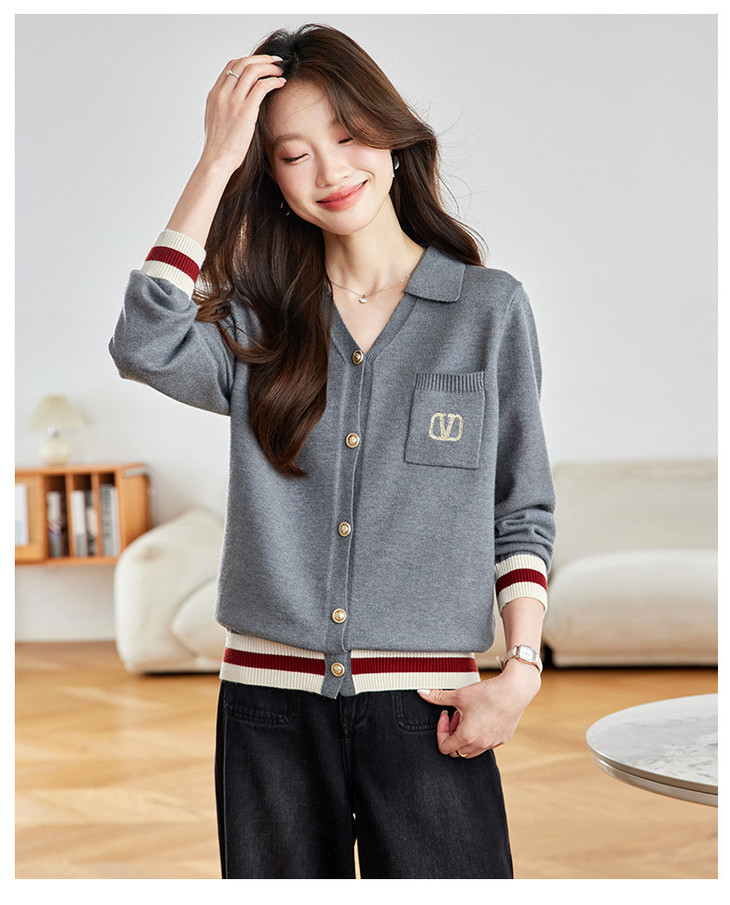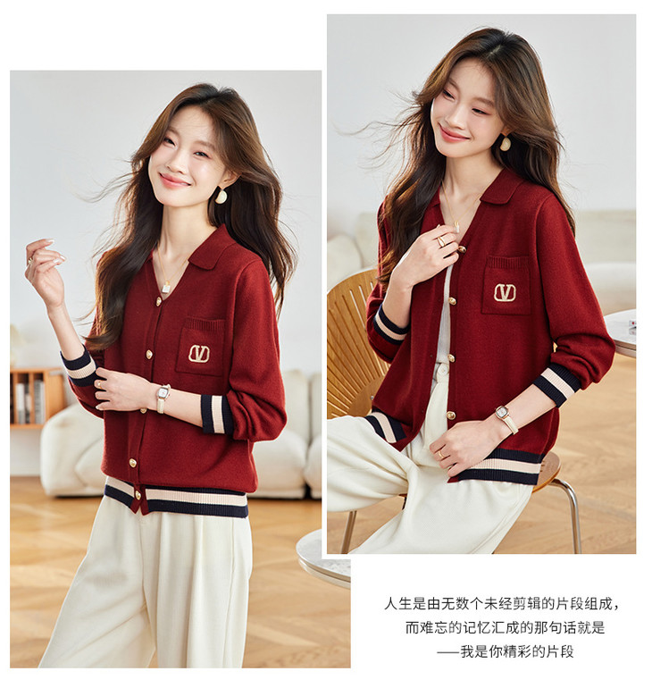 法式polo翻领长袖羊毛针织开衫,洋气宽松显瘦毛衣外套上衣CC-27-25120