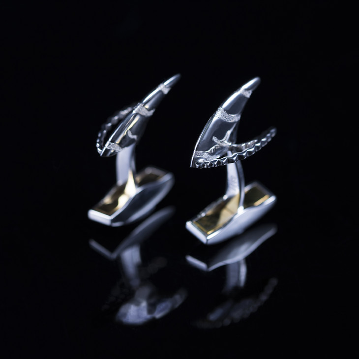 鲨鱼处于食物链的顶端,又酷又美。这对由上面有磨砂面水纹的鲨鱼鳍和被它划开的水面构成的925袖口,象征「一切尽在掌握」的领导力,霸气在袖口间若隱若现。