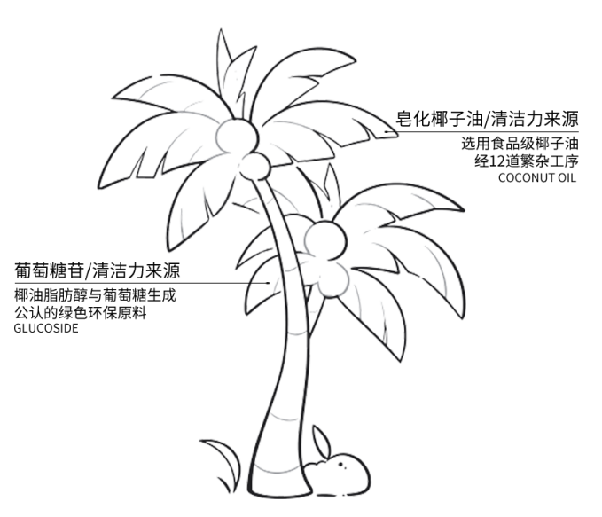洗衣液的清洁力来源于食品级椰子油和公认的绿色原料葡糖苷,经皂化等十二道繁杂工序制成。