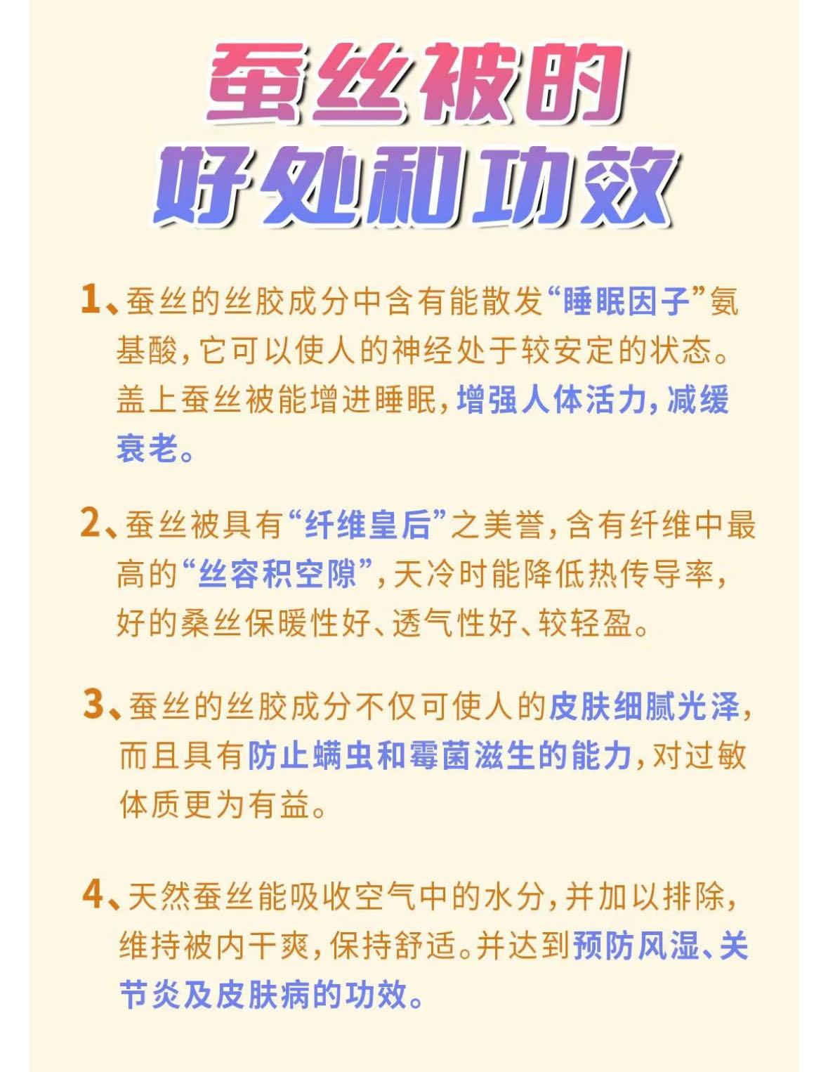 还有几点要重点提醒,蚕丝被不要水洗、不可长时间暴晒