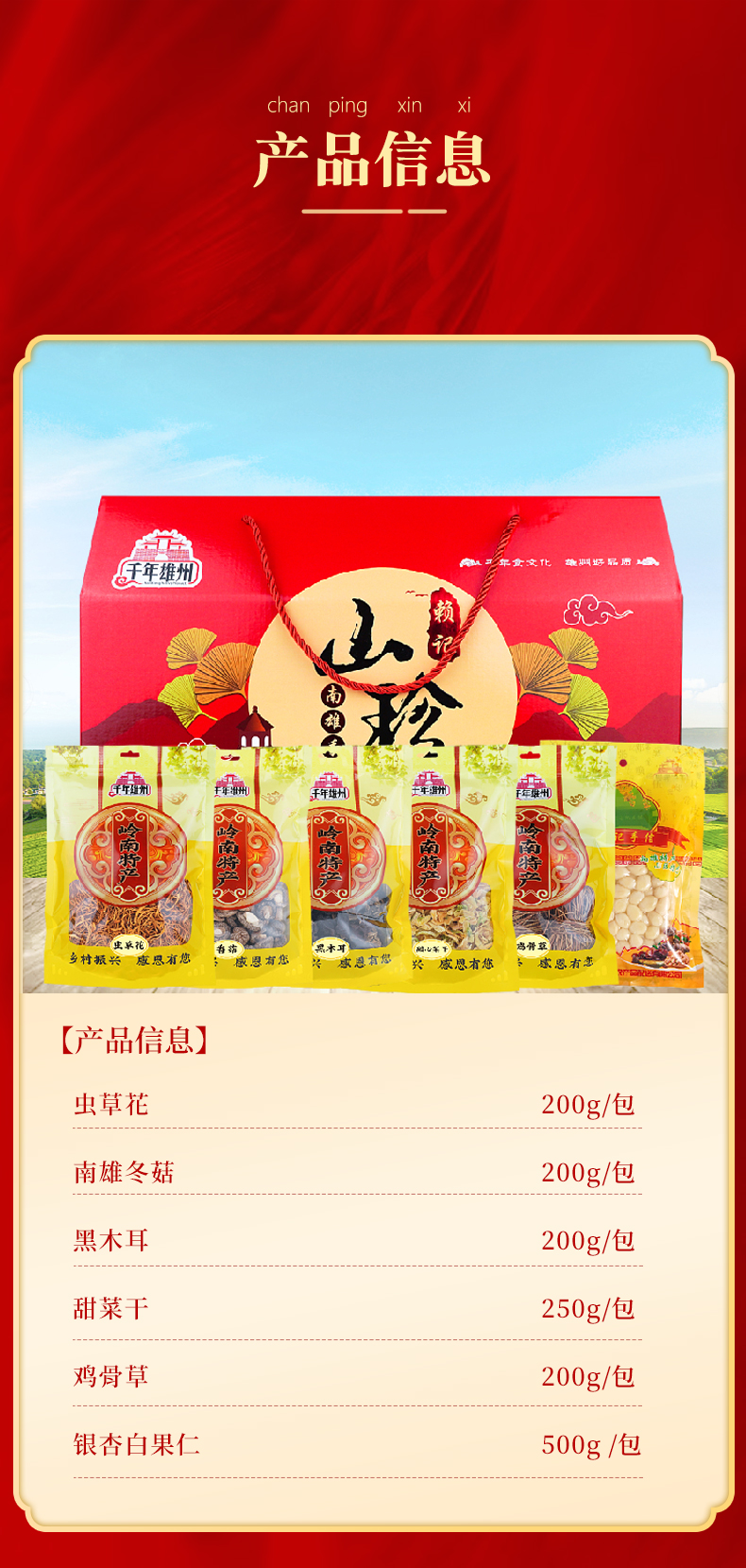 【韶关特产】千年雄州 赖记山珍 六六顺礼包(虫草花/南雄冬菇/黑木耳/甜菜干/鸡骨草/银杏白果仁)省内包邮