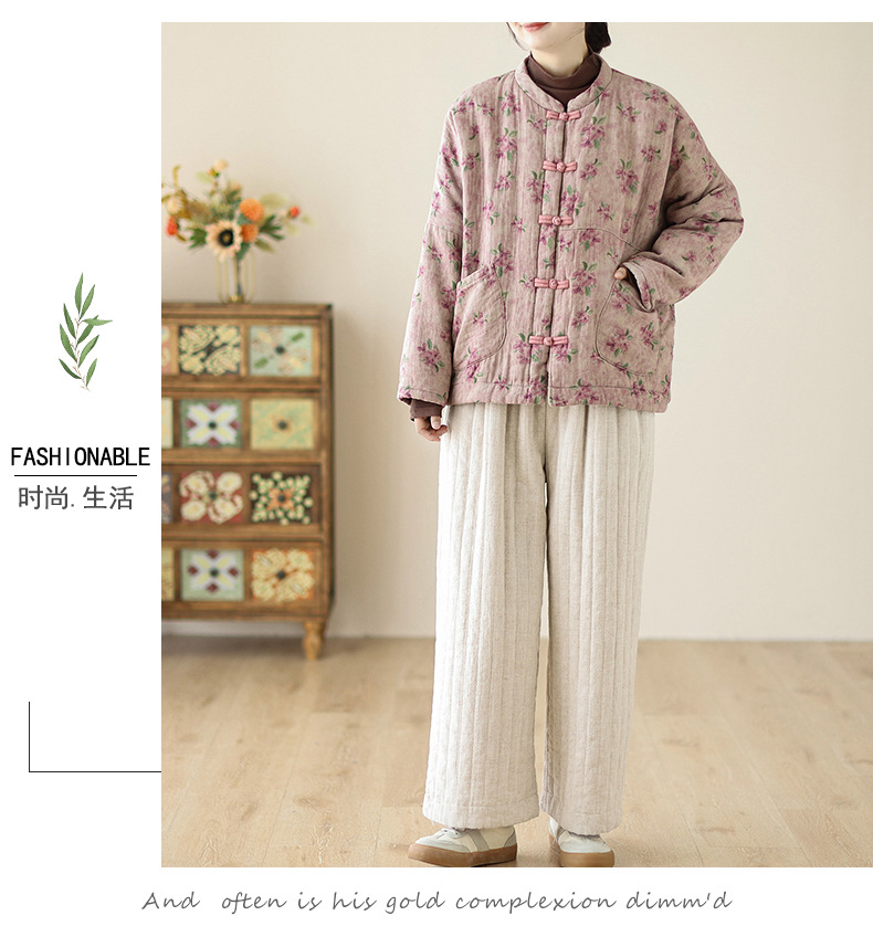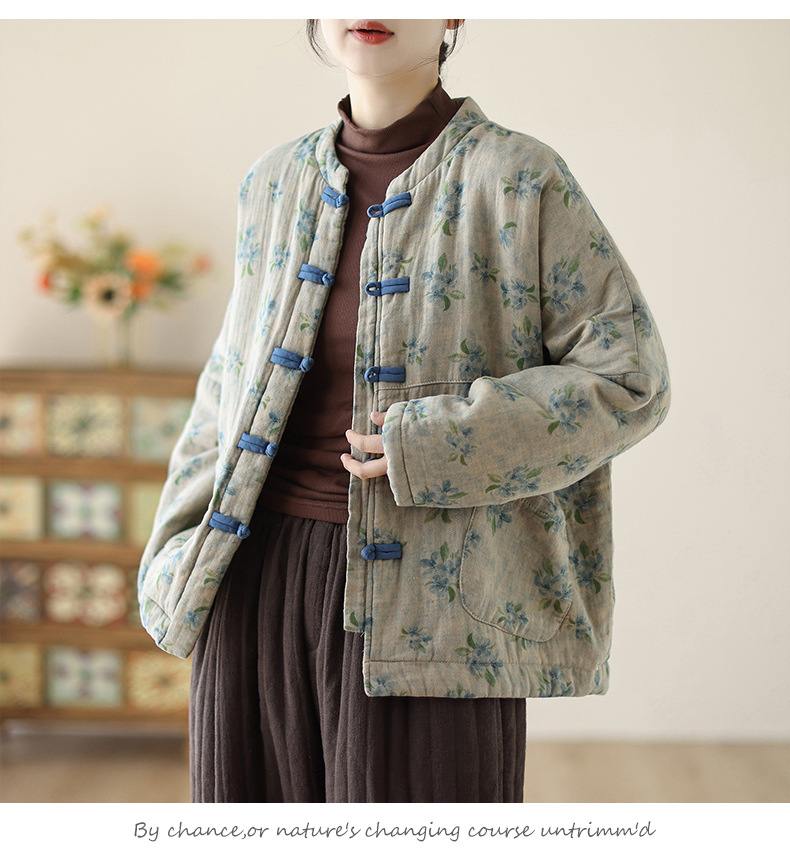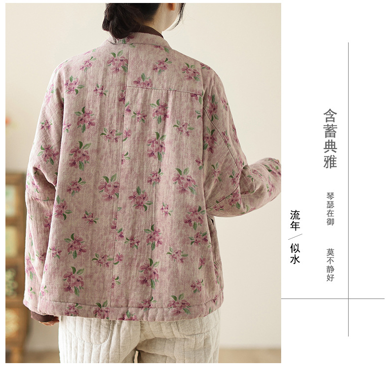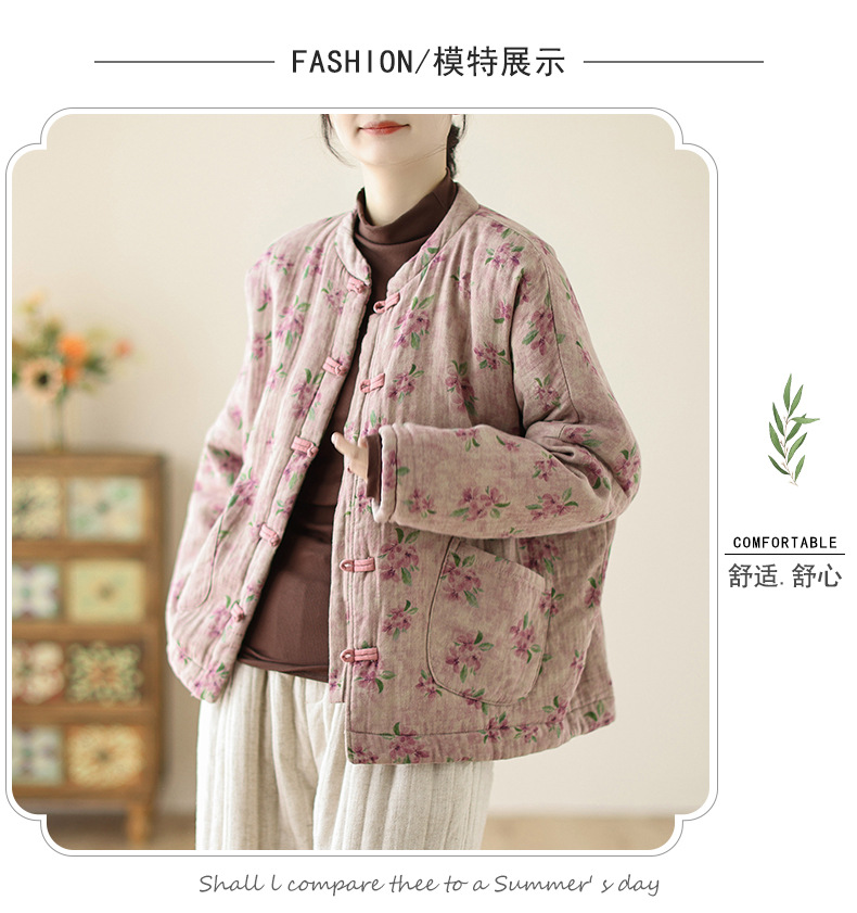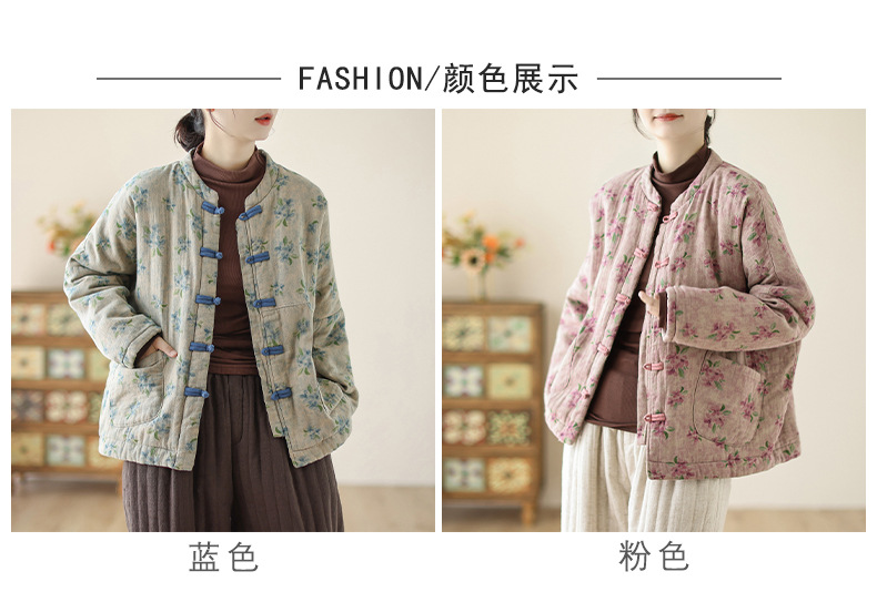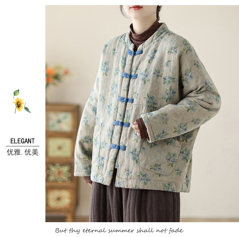 C070-2681新中式全棉复古盘扣棉服女文艺印花宽松夹棉保暖棉衣外套