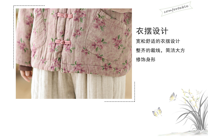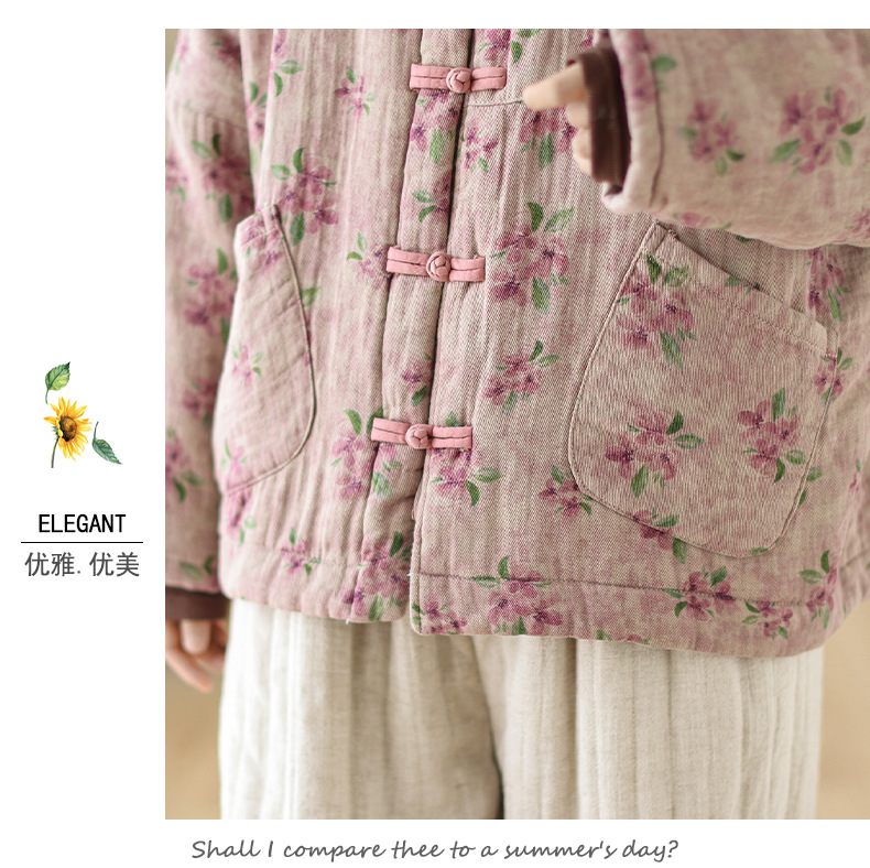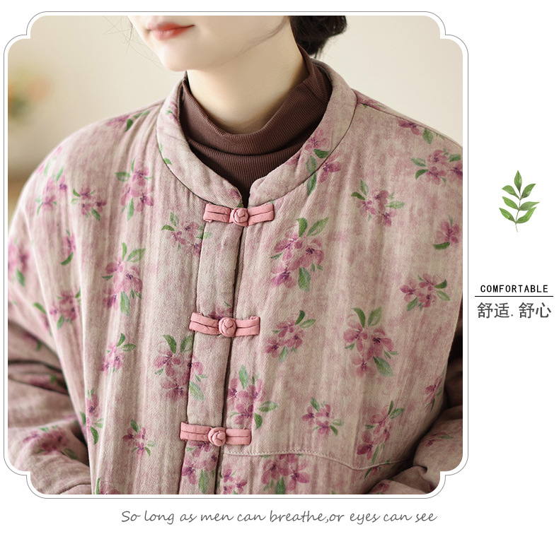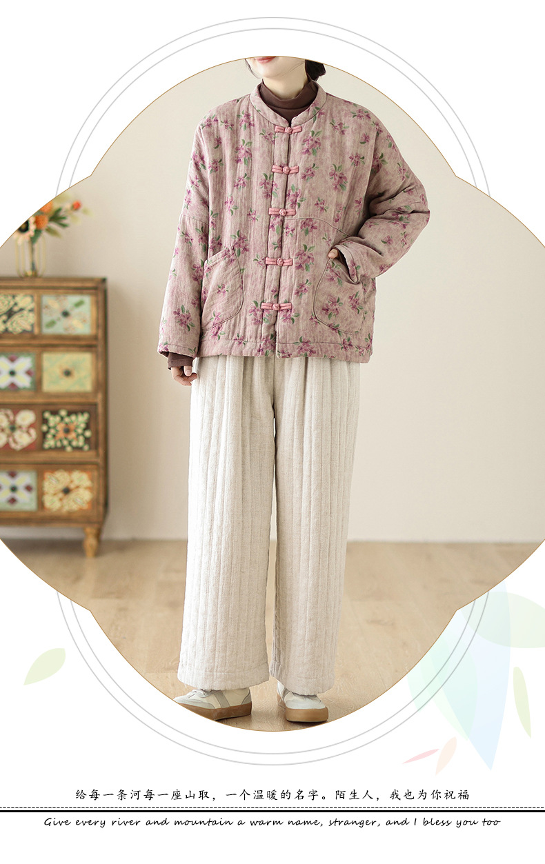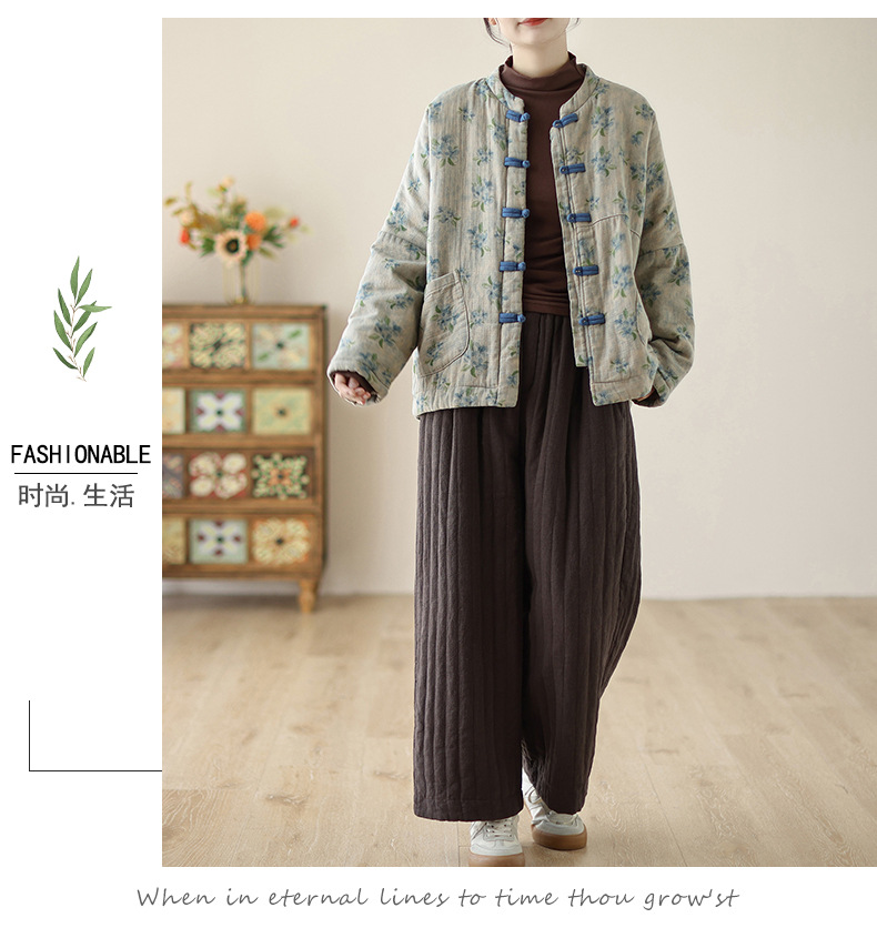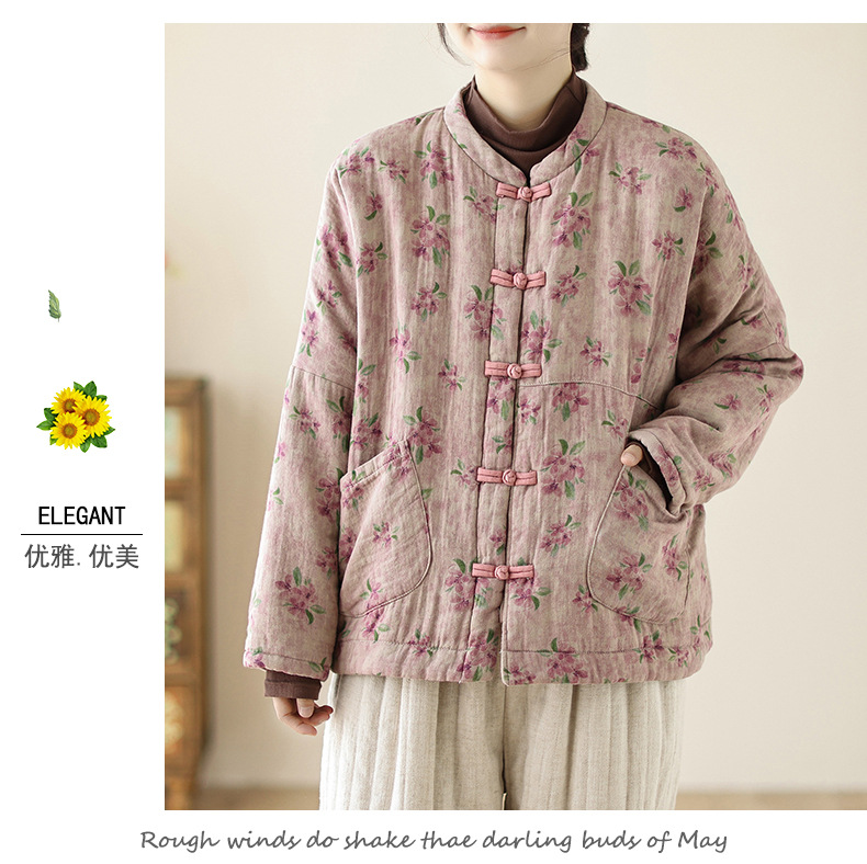 C070-2681新中式全棉复古盘扣棉服女文艺印花宽松夹棉保暖棉衣外套