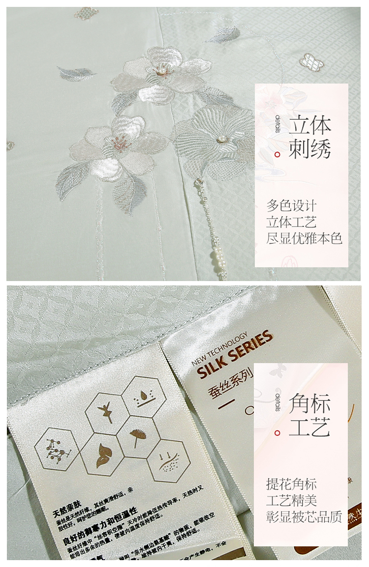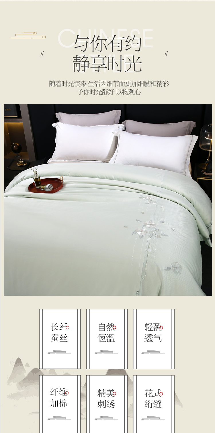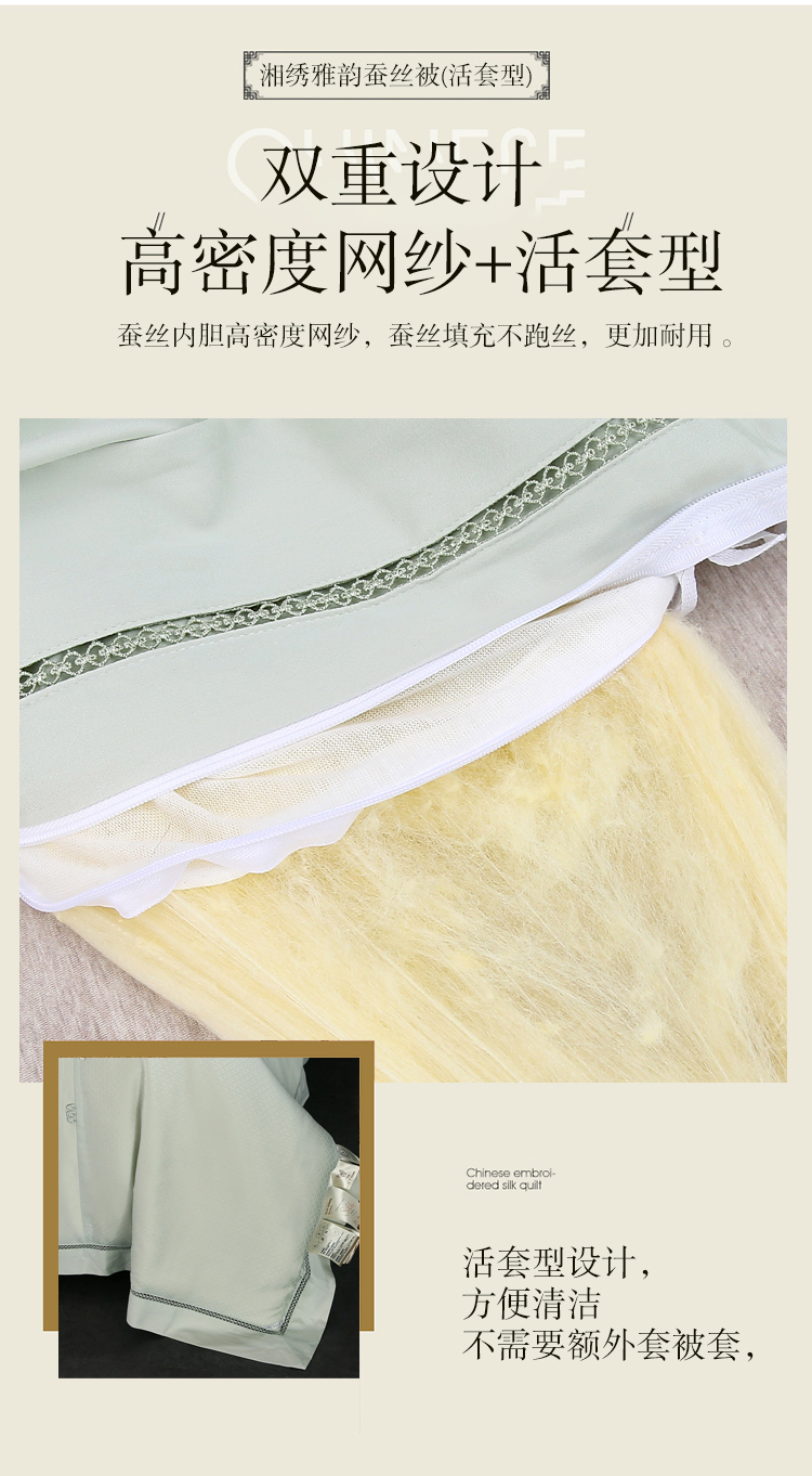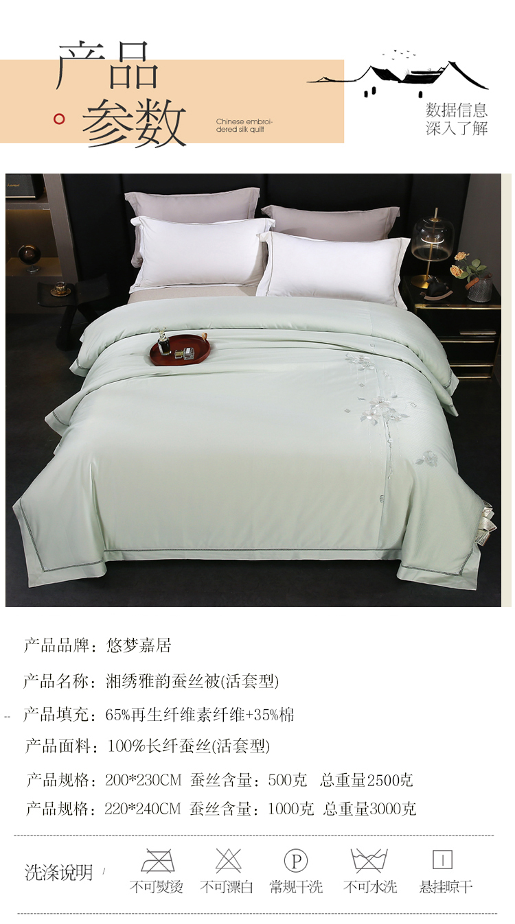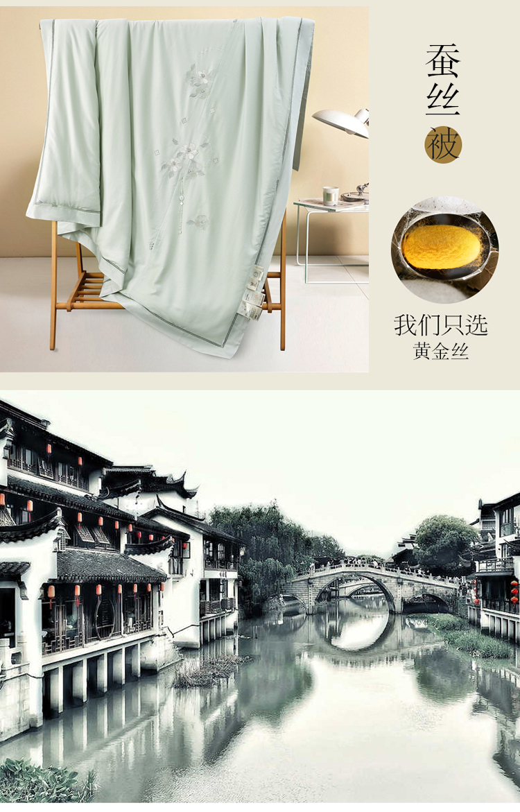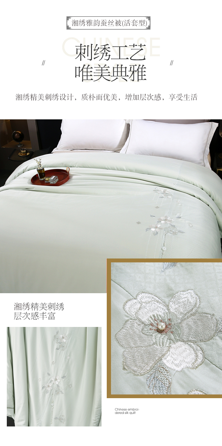 湘绣雅韵蚕丝被(活套型)【悠梦嘉居湘绣雅韵蚕丝被,活套型设计100%蚕丝填充,再生纤维素纤维面料,柔软舒适常规码200*230,绿水长汀】