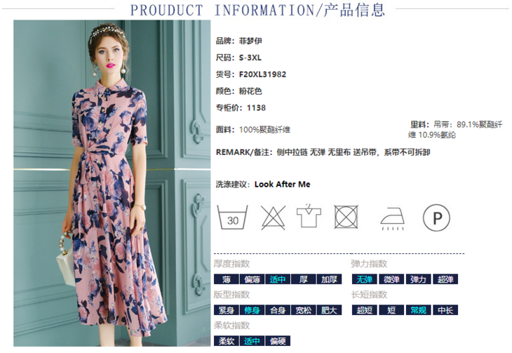 FMY-F20XL31982显瘦修身衬衫中长裙印花雪纺连衣裙