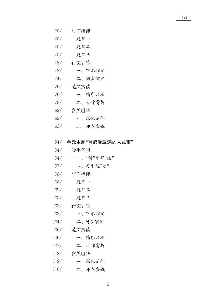 整体来说,全书呈现出三大特点:一是紧扣教材,突出实用。注重固本强基,而不是凌空蹈虚,着力解决学生日常写作中的痛点问题。二是切中要害,突出理法。注重精准针对,而不是天女散花,尤其强调“思维深化”与“章法训练”。三是贯通内外,突出积累。注重水滴石穿式的阅读积累,而不是止于口头的空泛倡导,特别强调对名家经典的诵读与揣摩,以期形成良好的心理记忆。