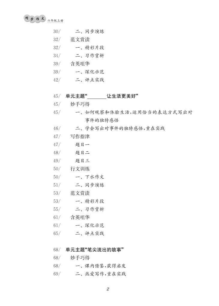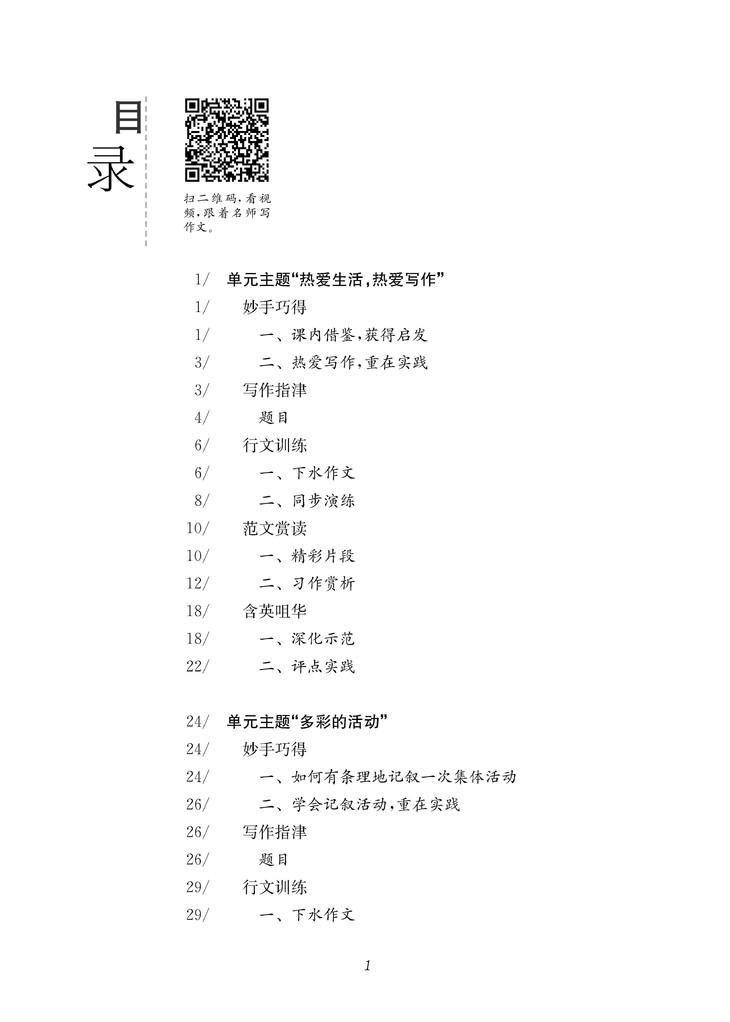 这一切得益于本书独特的编著体例。全书共计六个单元,每个单元分为五个板块:“妙手巧得”“写作指津”“行文训练”“范文赏读”“含英咀华”。五个板块,严格遵循写作规律,线索清晰而又章法宛然,浑然一体而又次序分明。“妙手巧得”,重在“强基”,强调通过深入阐释课内的精彩篇章,夯实写作基础。“写作指津”,重在“启智”,强调通过对具体题目的精细剖析,拓宽学生思维。“行文训练”,重在“浚思”,强调通过教师的亲身示范和学生的行文训练,帮助学生疏通行文思路,初步建立写作章法。“范文赏读”,重在“立范”,强调通过赏析同龄人的精彩习作,促进学生对比省思,确立写作范式。“含英咀华”,重在“悟道”,强调通过悉心揣摩名家经典,引导学生用心感悟写作之道。