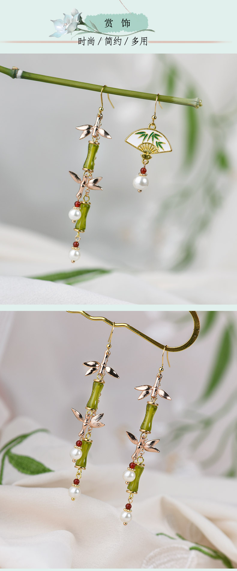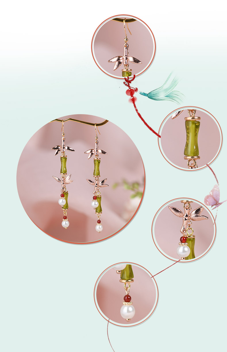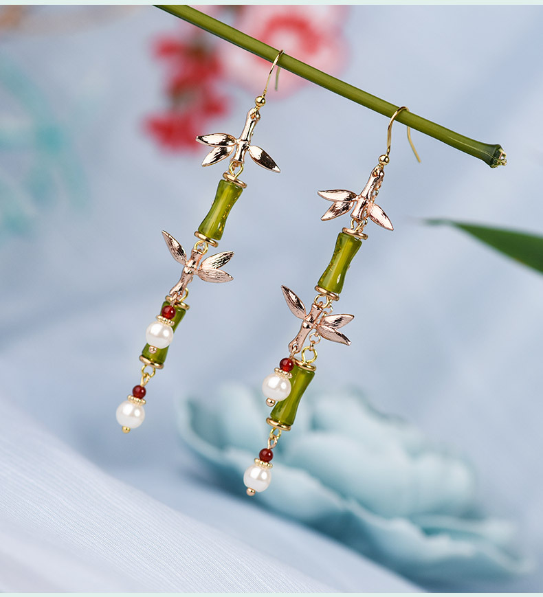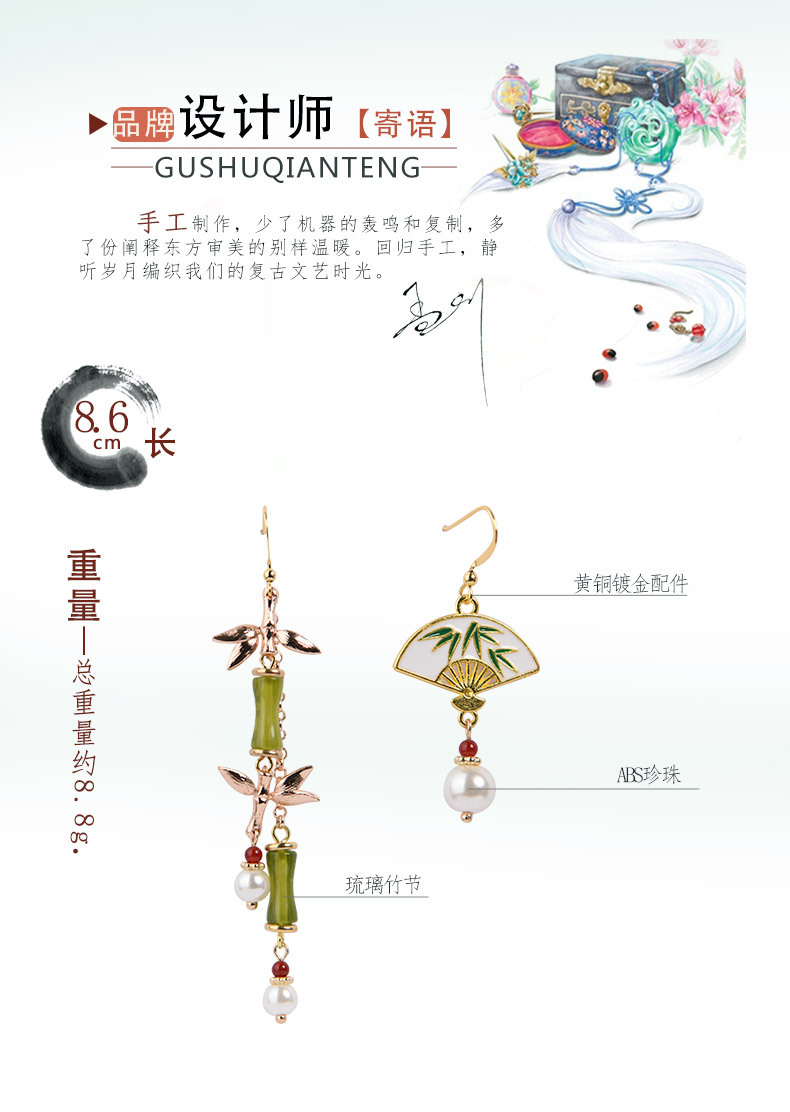 JGL-03220334古风耳环长款竹节流苏耳坠新中式扇形耳环小众设计不对称耳饰
