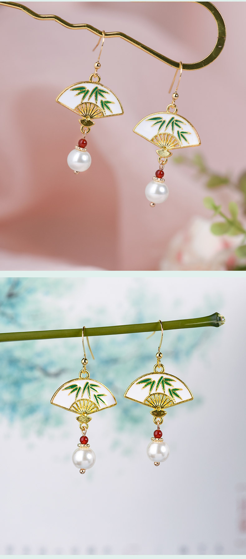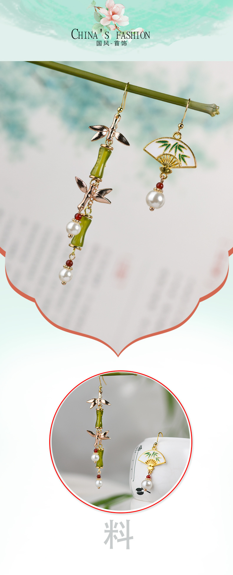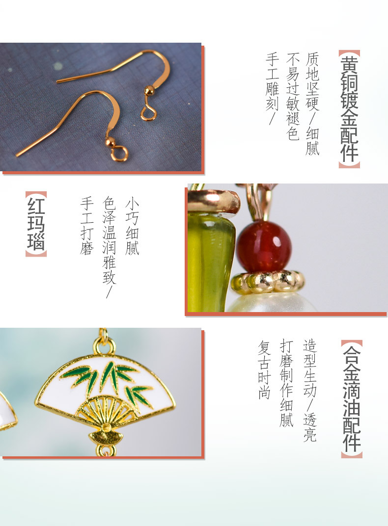 JGL-03220334古风耳环长款竹节流苏耳坠新中式扇形耳环小众设计不对称耳饰
