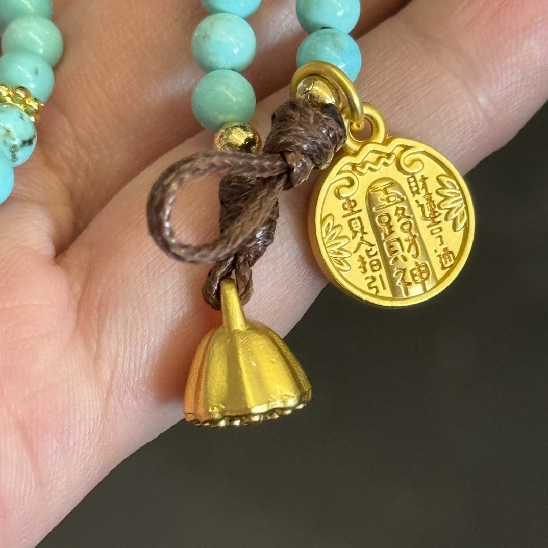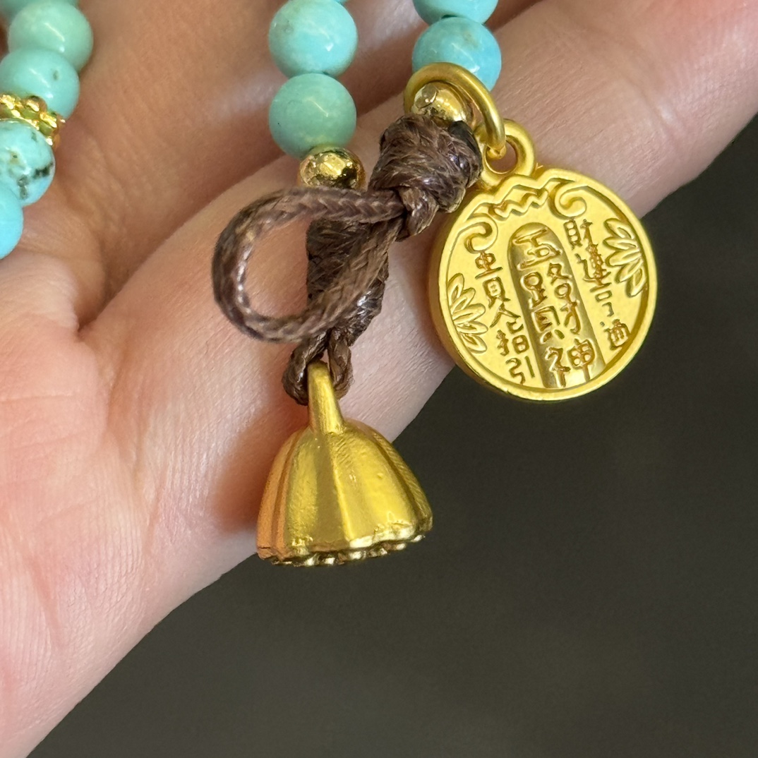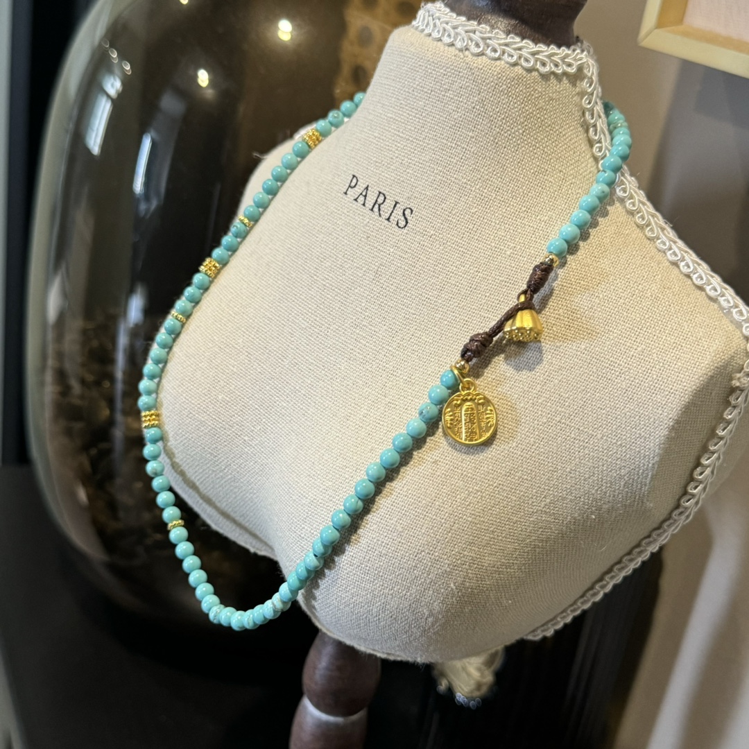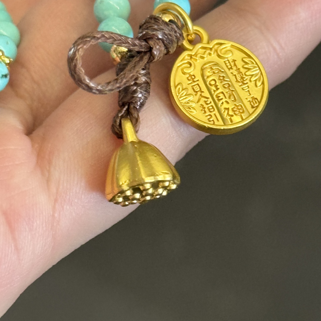 纯自然无滤镜看成色!实在太好看了,搭配莲蓬扣头,寓意hao事连连当手链佩戴也是绝美 这条项链由纯天然绿松石和纯银镀金制作而成,tian然宝石组成的自由宝石守护串珠,全部由老师傅纯手工切割、抛光、执膜、串珠,一条匠心打造的艺术大作!!