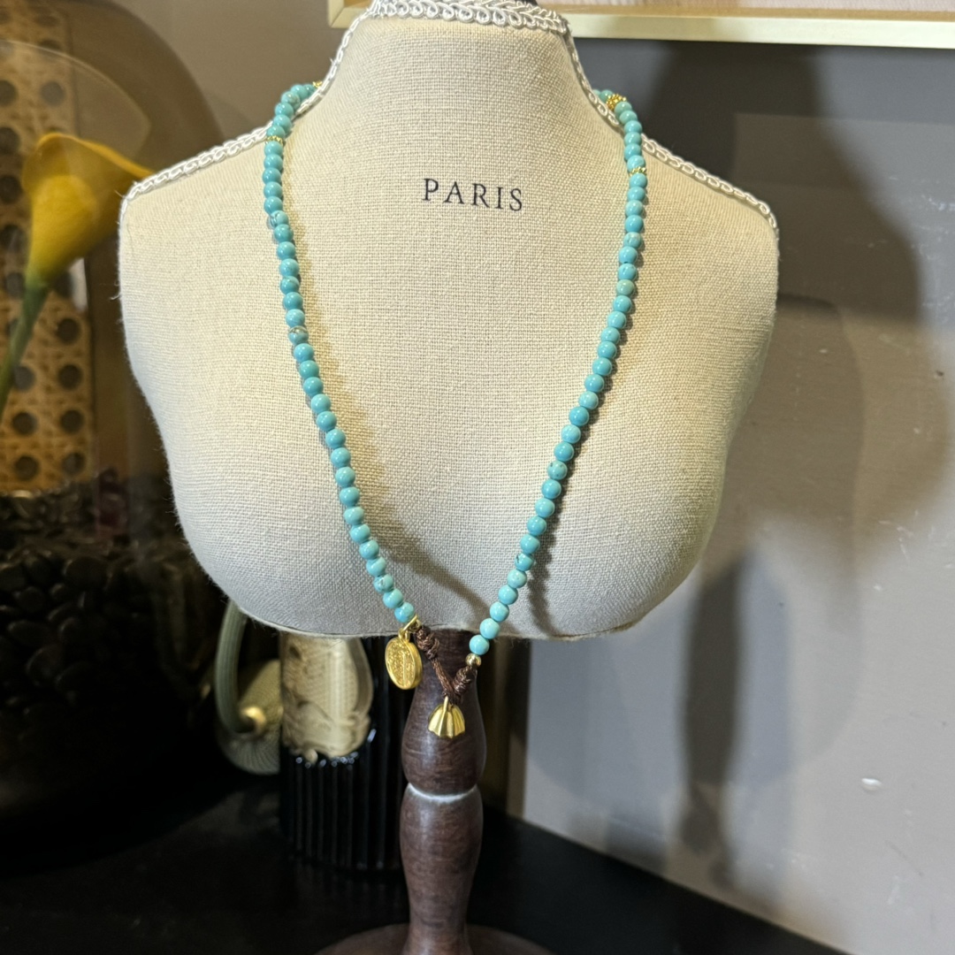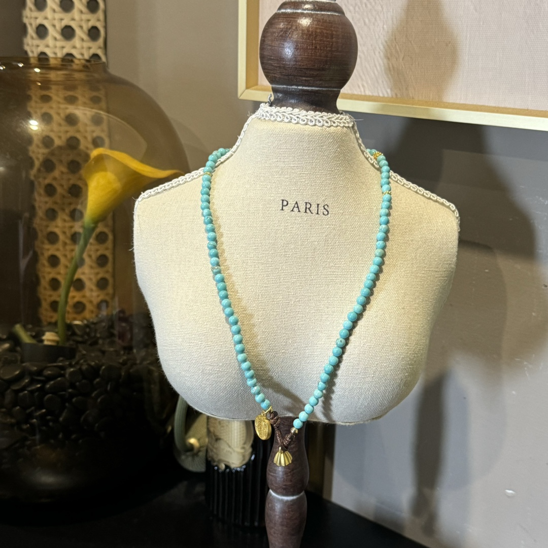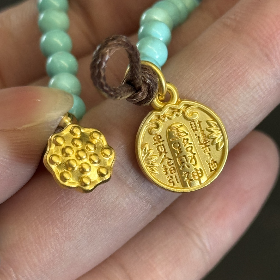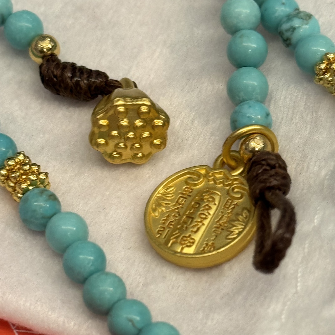 纯自然无滤镜看成色!实在太好看了,搭配莲蓬扣头,寓意hao事连连当手链佩戴也是绝美 这条项链由纯天然绿松石和纯银镀金制作而成,tian然宝石组成的自由宝石守护串珠,全部由老师傅纯手工切割、抛光、执膜、串珠,一条匠心打造的艺术大作!!