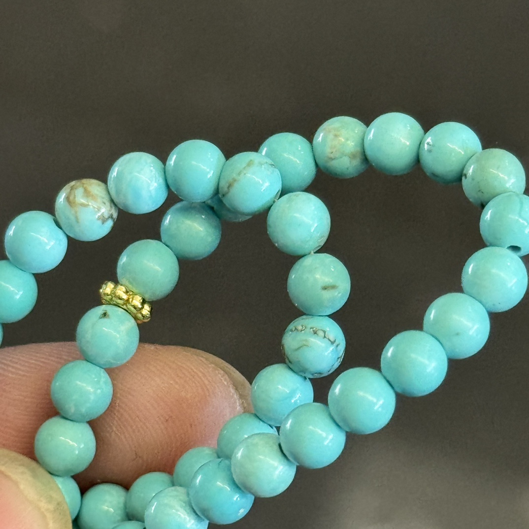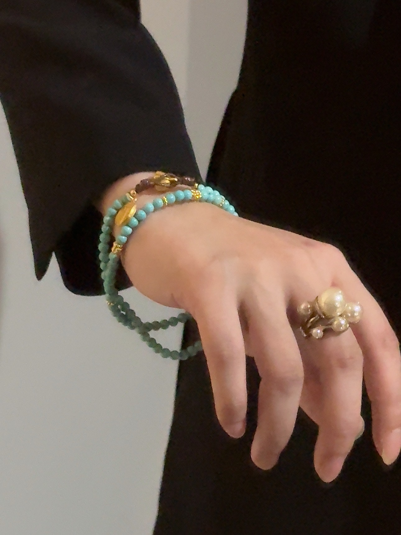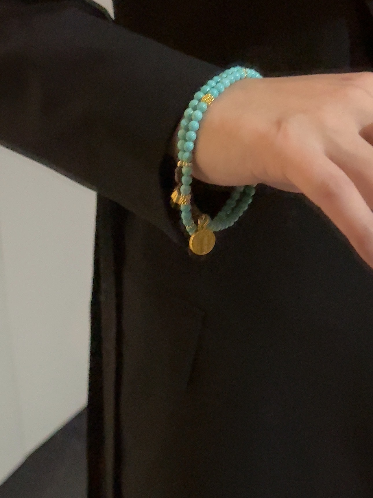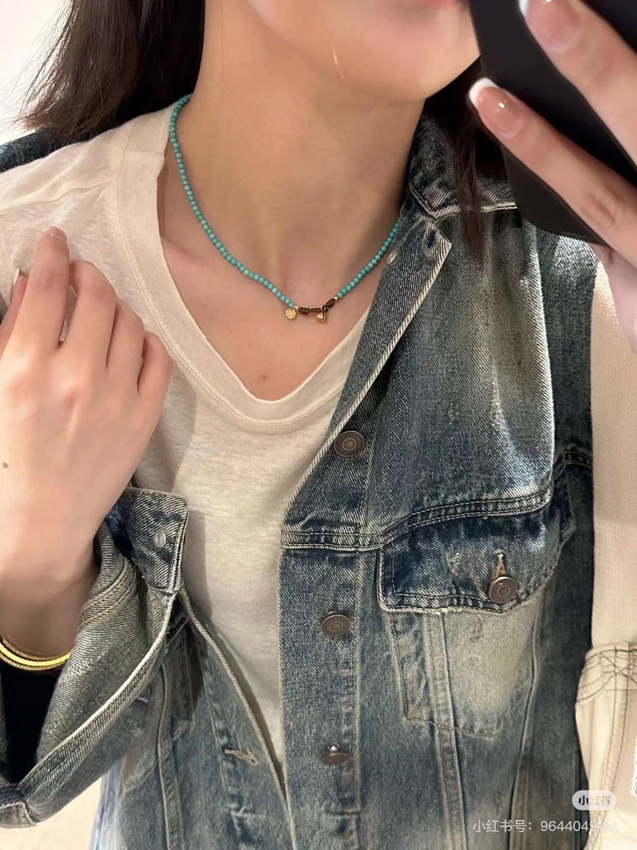 尤其适合夏天 最近不光是我身边朋友都在入手绿松石单独戴或者当作叠戴搭配珍珠黄金项链都是贼好看的存在!!你们听我的自留就行了随便搭配什么连衣裙 tee 衬衫 都不会让失望!而且可以当作手链戴一条链子两用,采用tian然绿松石3mm小米珠,也称之为优化绿松石并不是市面上那些人造绿松 我们chun天ran的!
