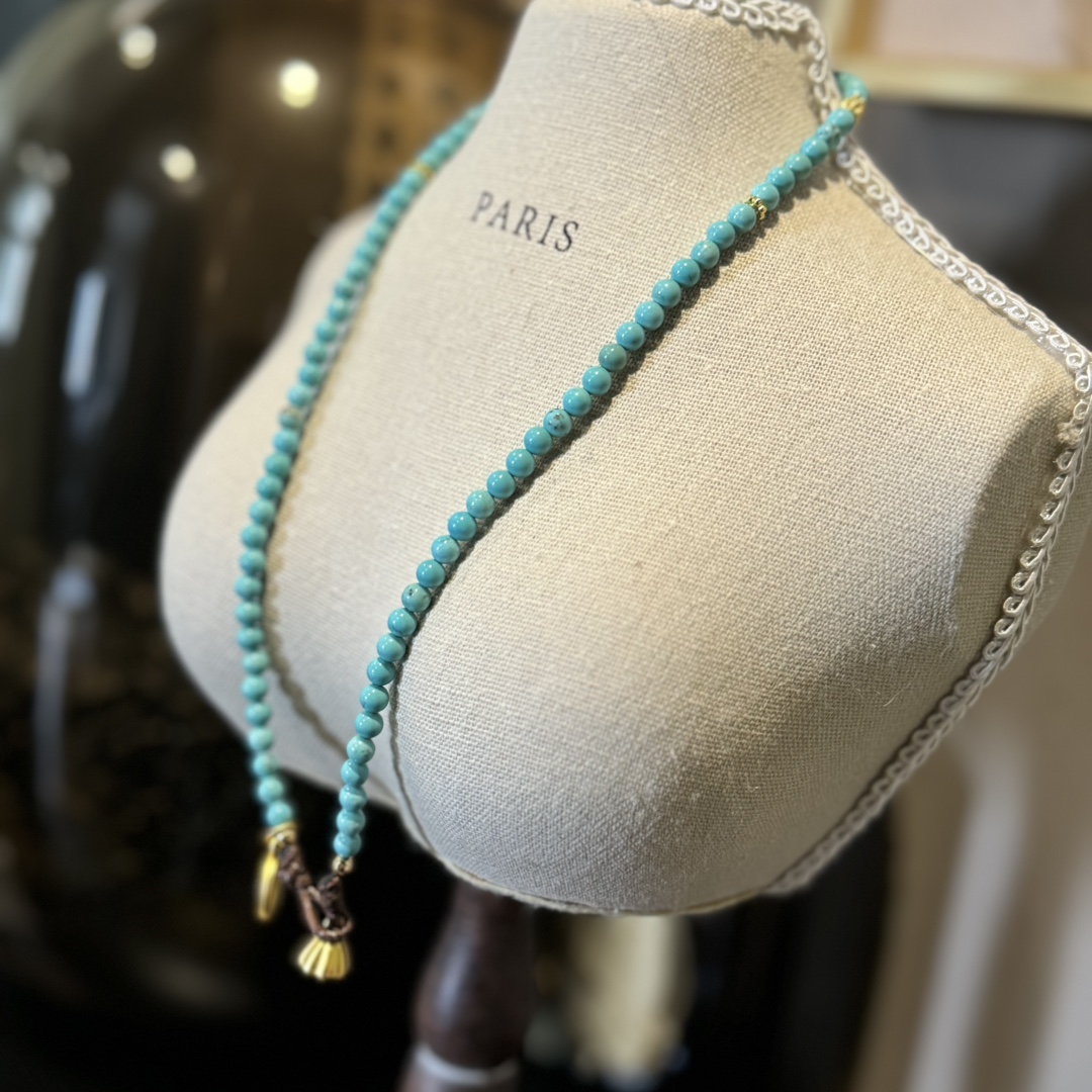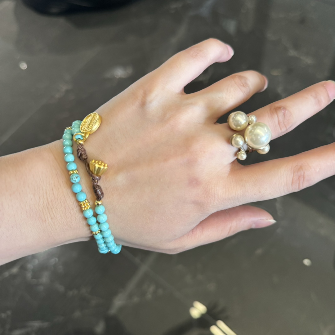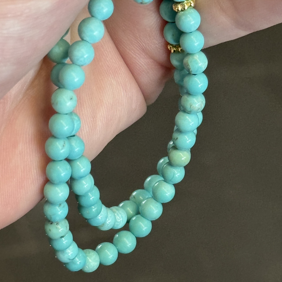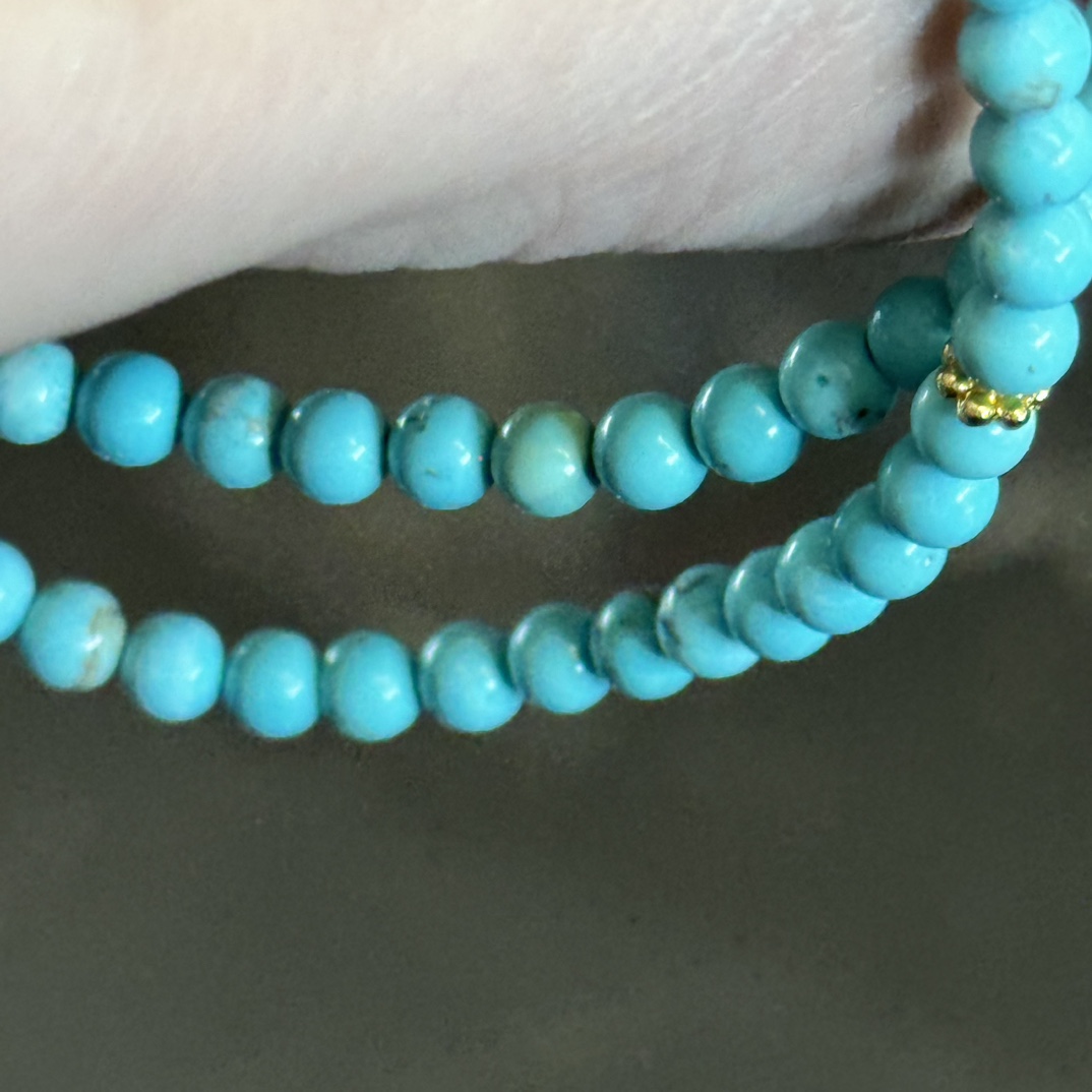 尤其适合夏天 最近不光是我身边朋友都在入手绿松石单独戴或者当作叠戴搭配珍珠黄金项链都是贼好看的存在!!你们听我的自留就行了随便搭配什么连衣裙 tee 衬衫 都不会让失望!而且可以当作手链戴一条链子两用,采用tian然绿松石3mm小米珠,也称之为优化绿松石并不是市面上那些人造绿松 我们chun天ran的!