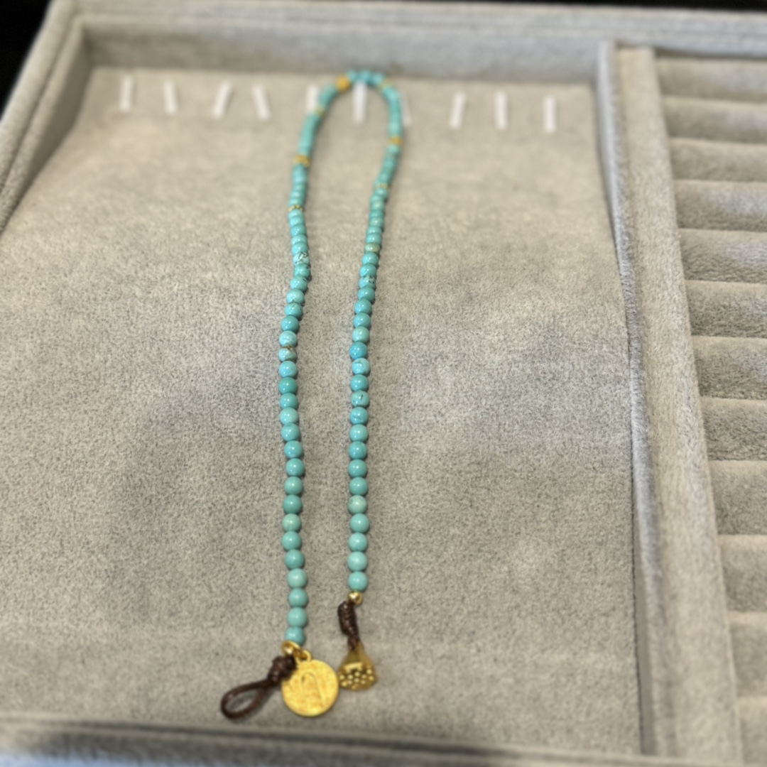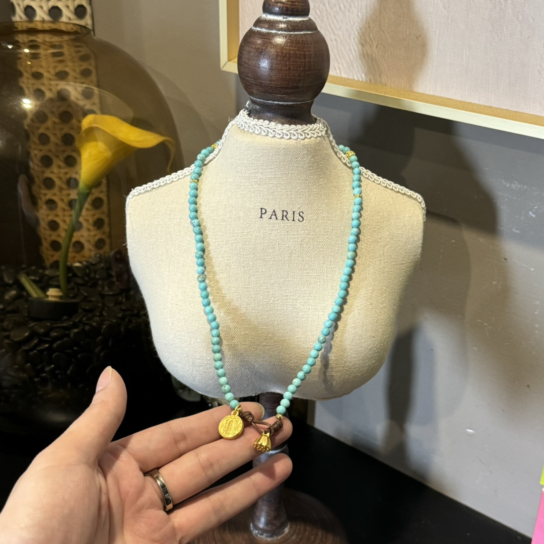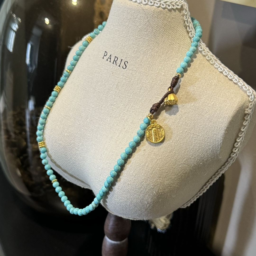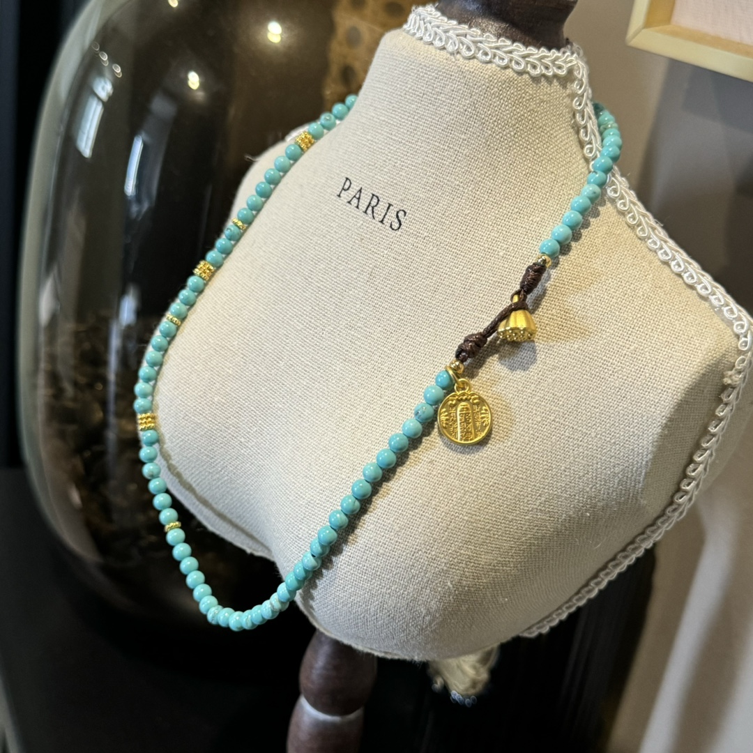 产地:中国,埃及,伊朗,美国等地,中国是绿松石主要产地之一,其中湖北郧西县,竹山县一带盛产优质绿松石。看似普通的项链,因为宝石的孔位极小,机器无法代替,所有只能靠纯手工!!无论是项链还是手链,每一条都要通过多年经验的老师傅,用超细的定制绳,纯手工一粒一粒的穿孔,单条至少多花费60分钟以上!!纯手工串珠不仅让链条更牢固耐用,更是每一条都是世界上独一无二的存在!!配件吊坠都是925银➕黄铜镀真金的 将近20个小五金自己算价格就行了~绳索编织都是手工的