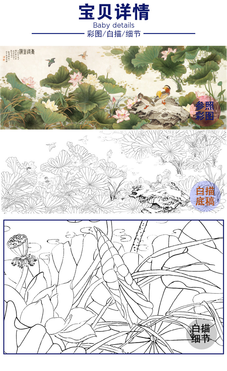 横幅工笔花鸟白描底稿-金鸿钧荷花鸳鸯《香远益清》-多种白描尺寸可选-QA13