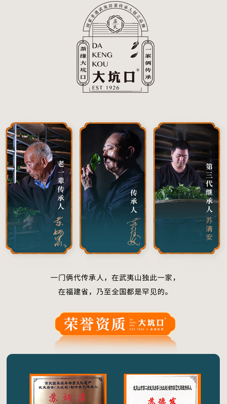 大坑口岩茶有限公司,位于武夷山市-天心村,茶山分布于正岩产区的“三坑、两涧”,由首批非物质文化遗产武夷岩茶制作技艺传承人:苏炳溪和第二批传承人:苏德发先生的精心手工制作,造就了大坑口岩茶的独特品质