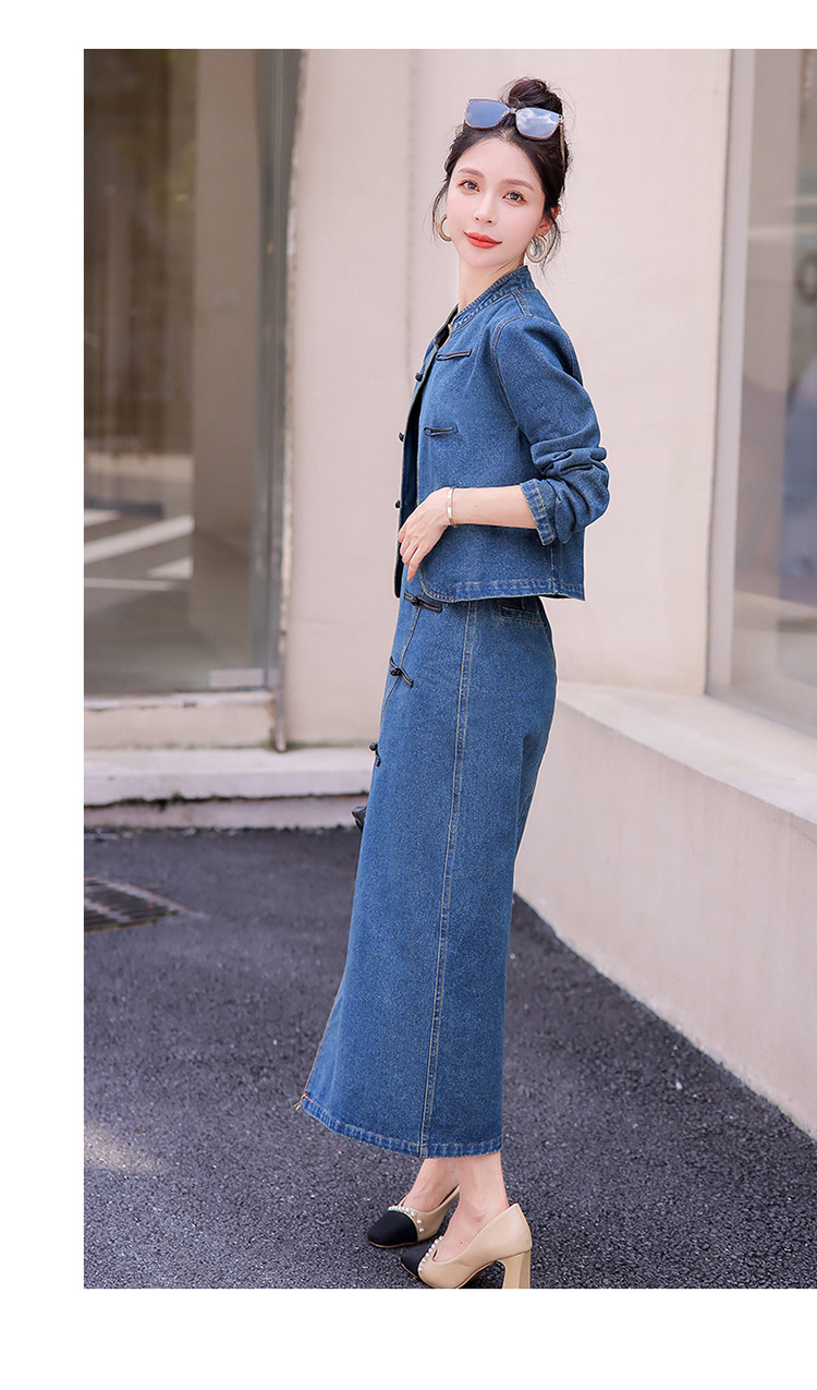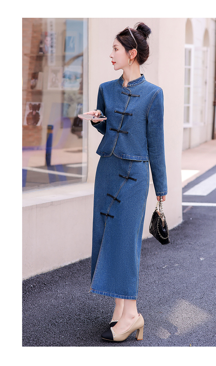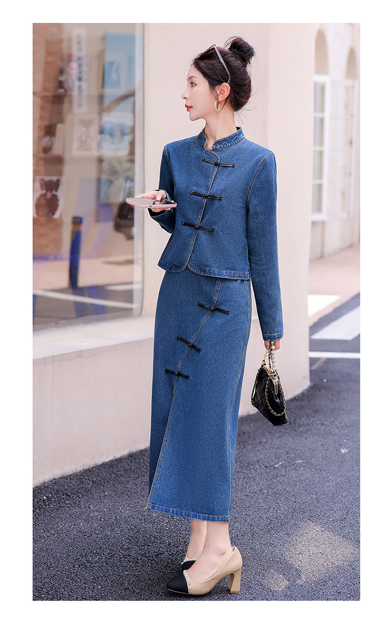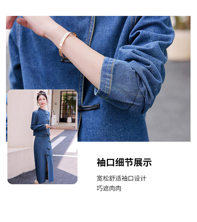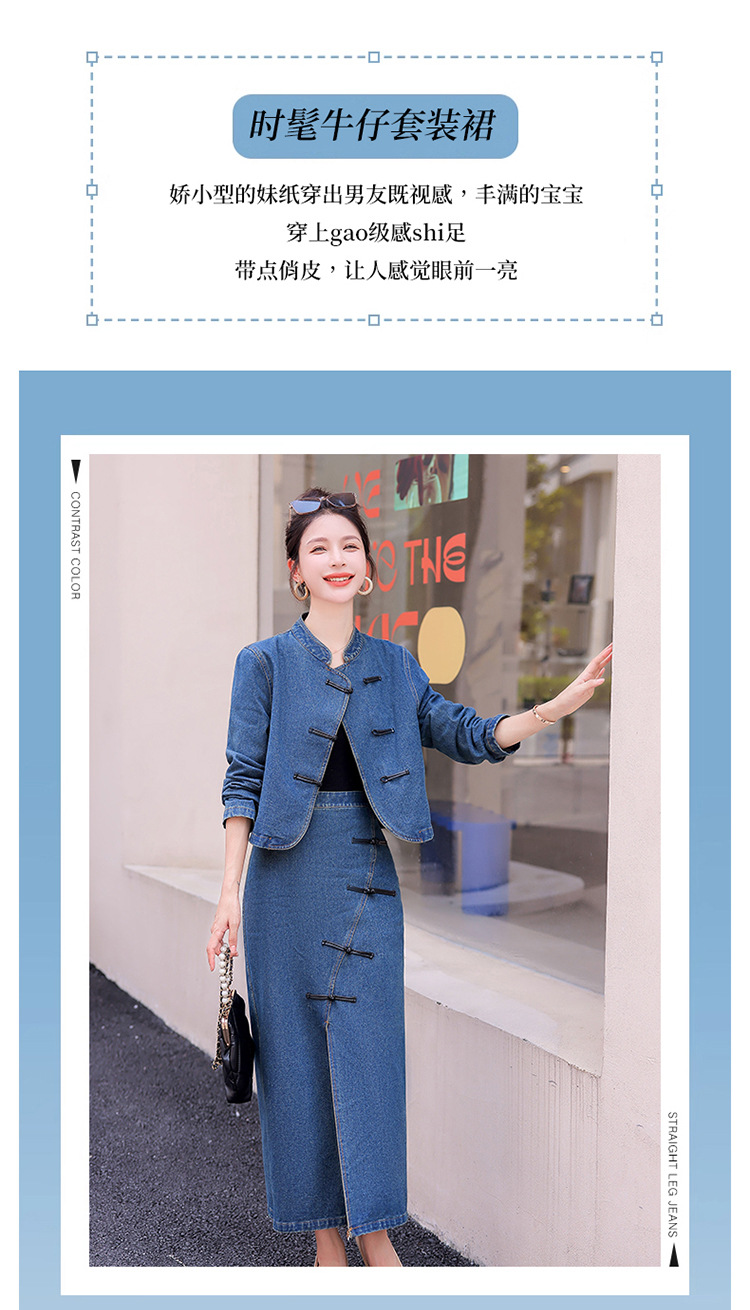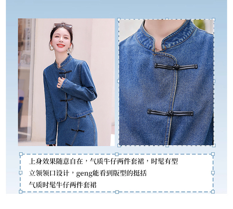 WZNHWH23779 2023年秋季新款气质复古潮流立领盘扣长款两件套牛仔套装裙 商品图3