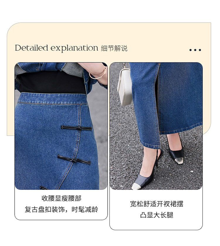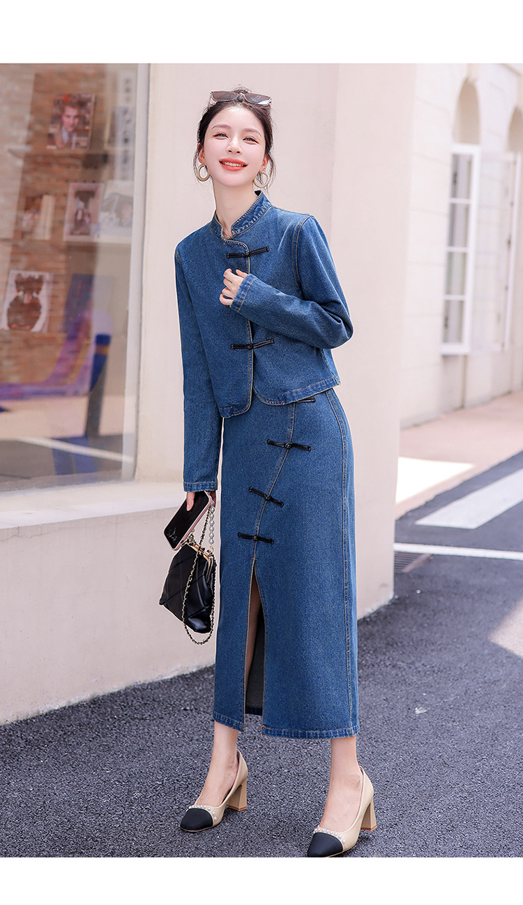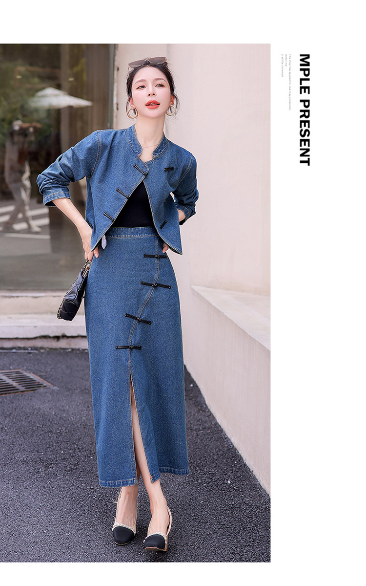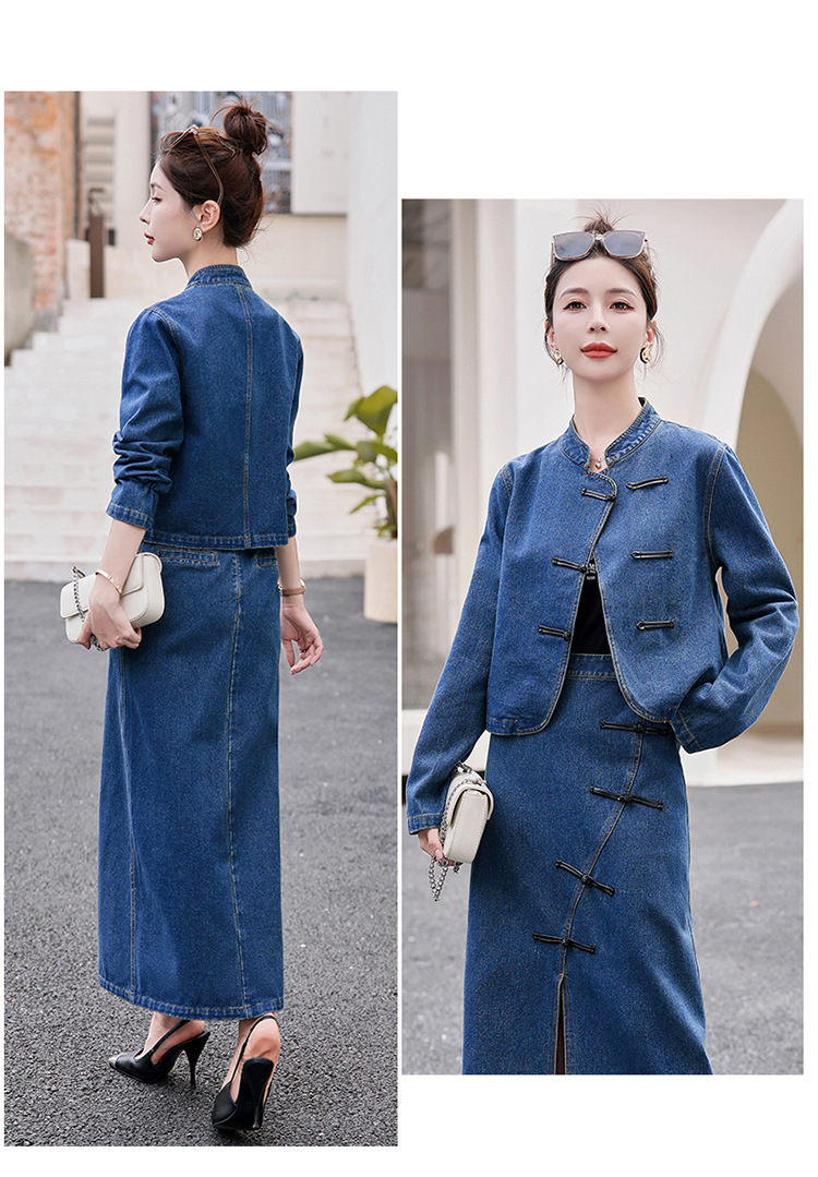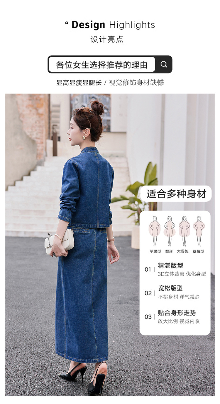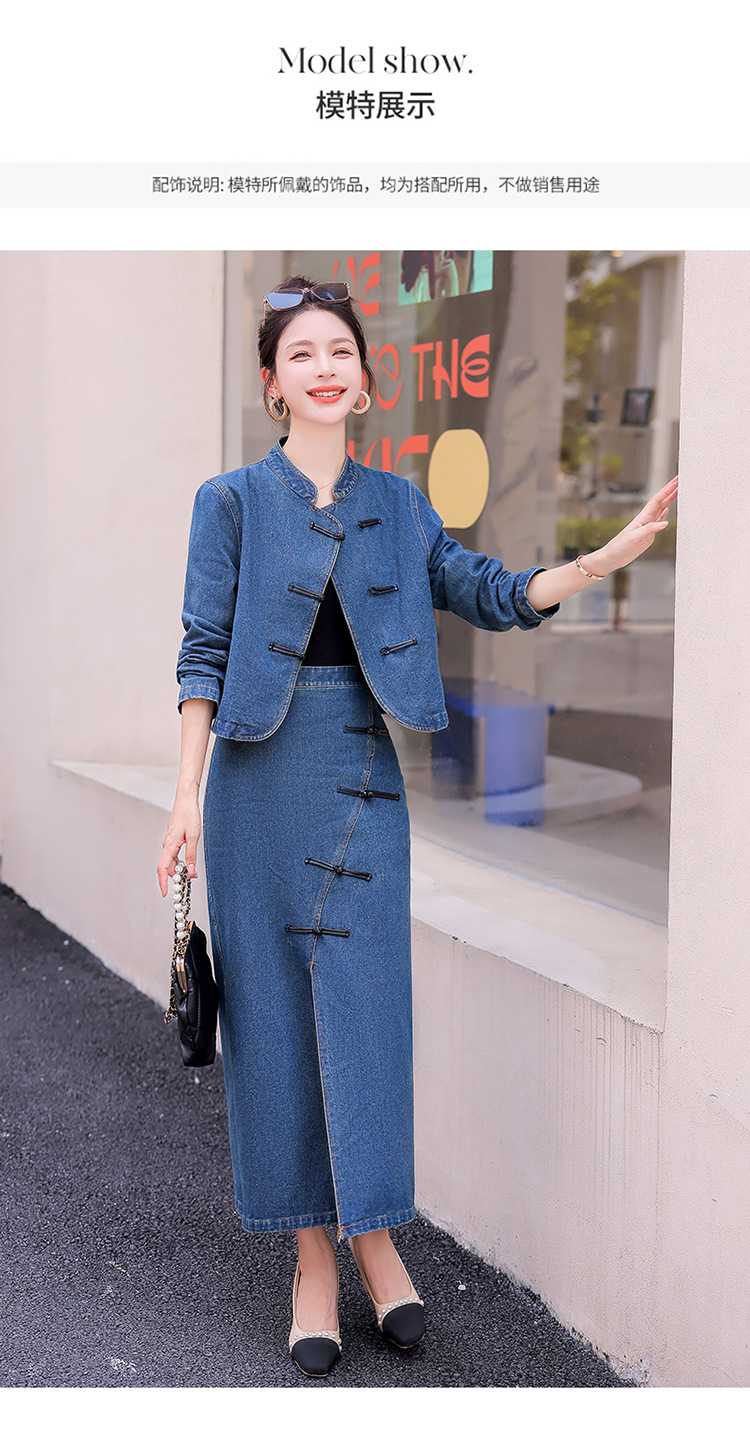 WZNHWH23779 2023年秋季新款气质复古潮流立领盘扣长款两件套牛仔套装裙 商品图3